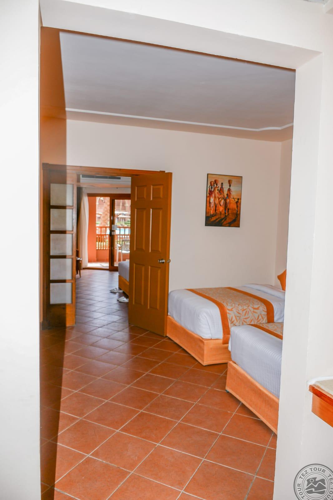 Family Suite (garden, pool view, макс. 2+3 или 4 взр., состоит из двух спален (спальня для родителей с одной двуспальной или двумя односпальными кроватями, 23 м2 + детская спальня 19 м2 с двумя односпальными кроватями, есть дверь между спальнями), душ, балкон, 58 м2 с учетом балкона). Доп. место - раскладушка.
