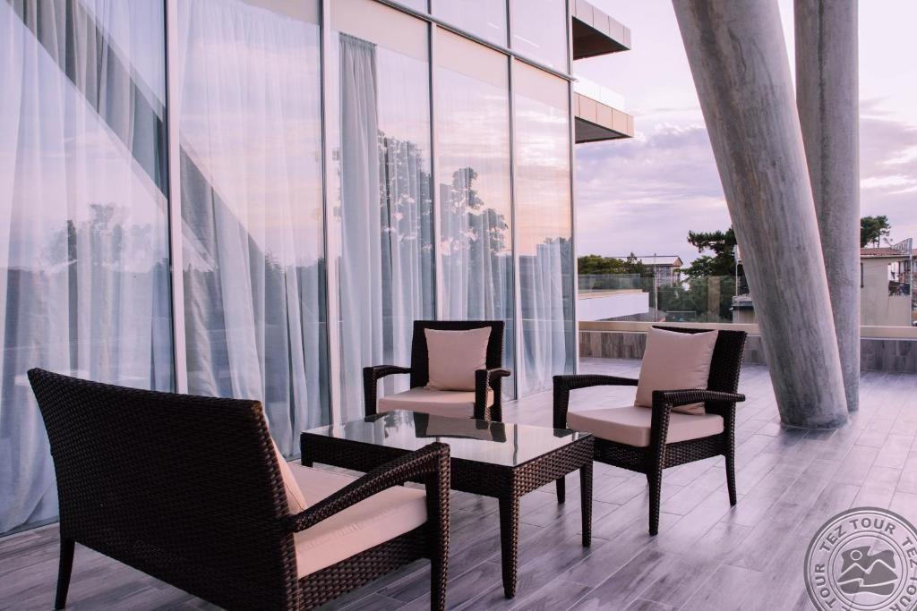 Стильный отель недалеко от пляжа с просторными номерами и с красивым видом на горы, бассейн и море.