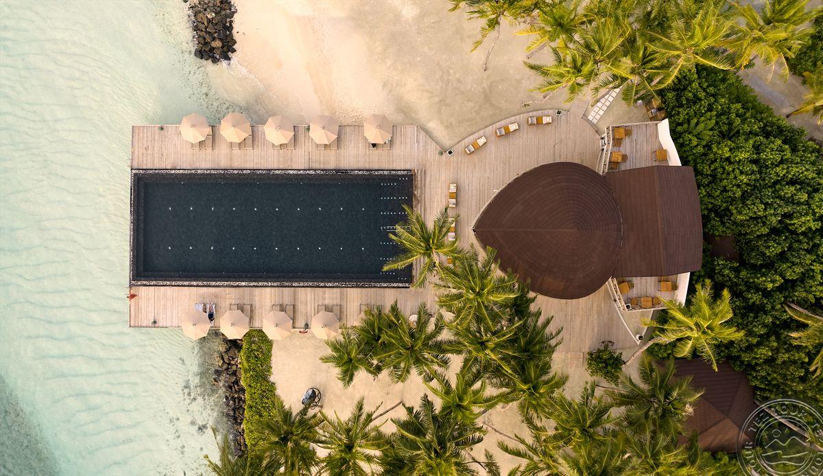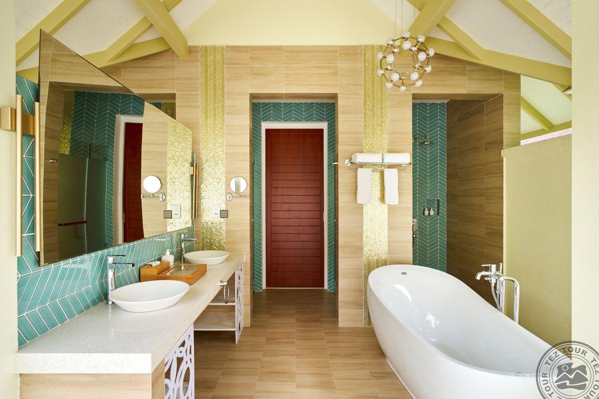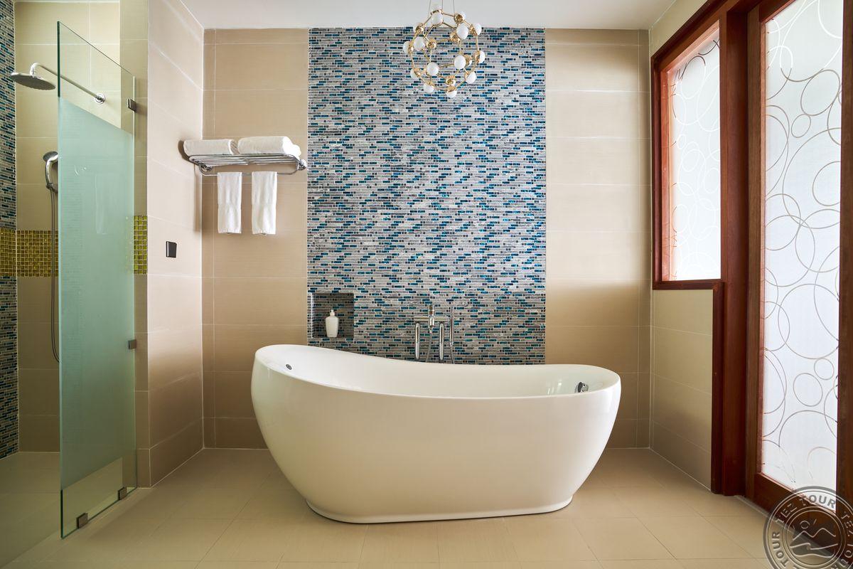 40 Romantic Water Villa with Pool (112 м², макс. 2 взрослых). Водные виллы. Спальня с кроватью king-size, ванная комната с ванной и душем, частный бассейн, терраса с прямым спуском в воду.