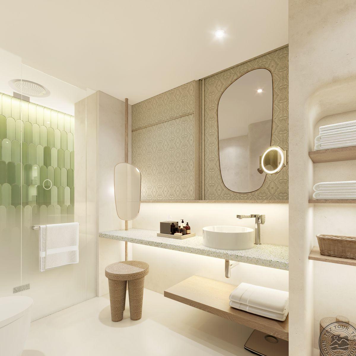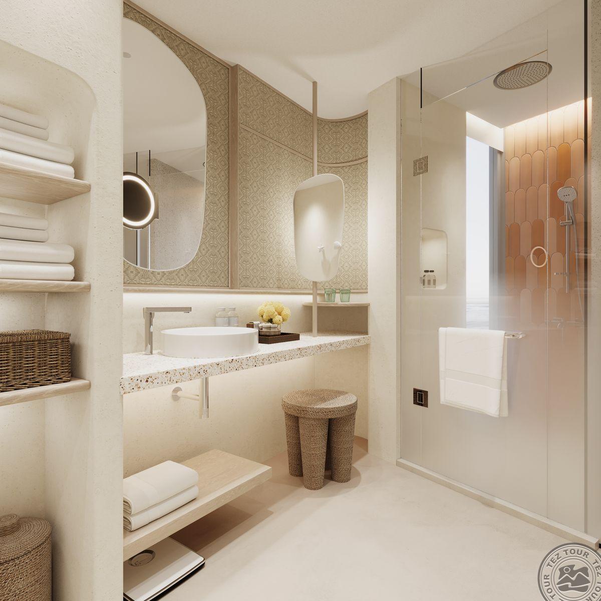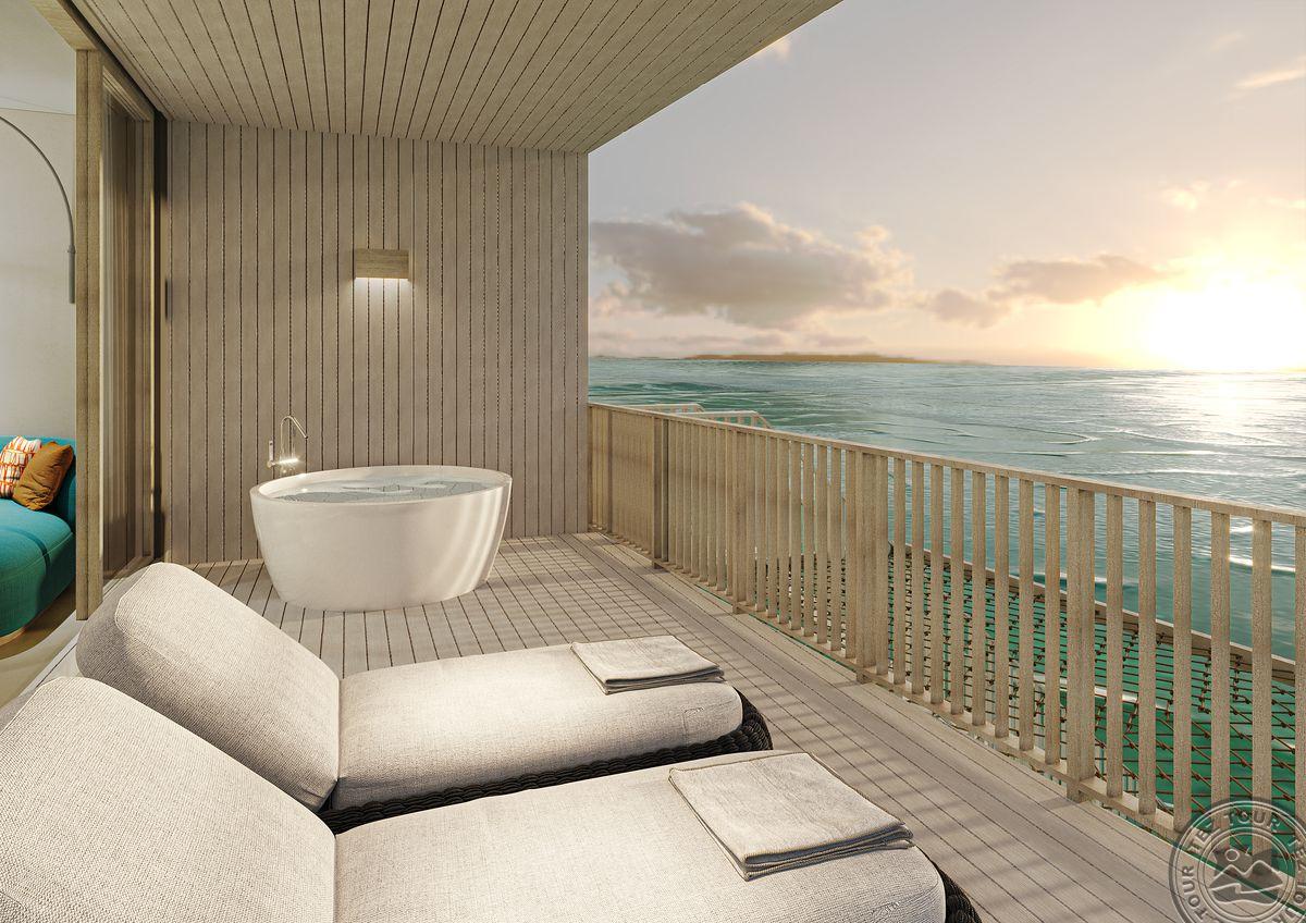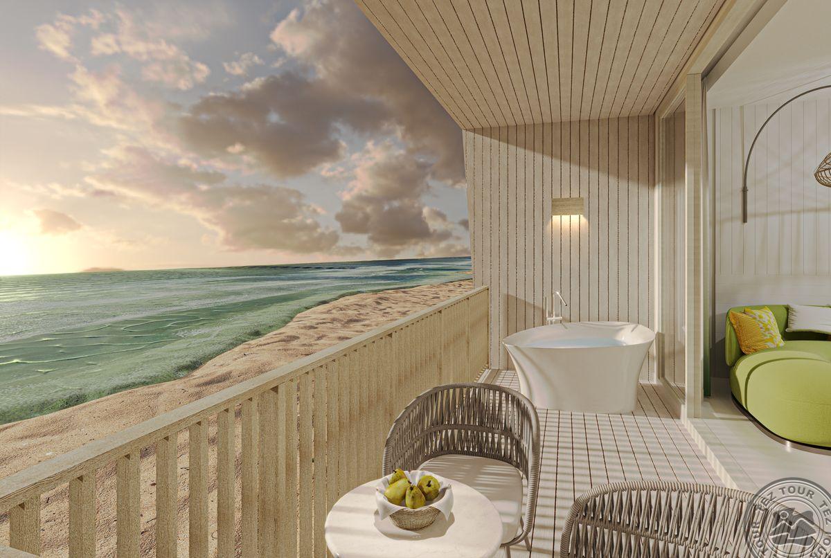 12 Mirage Beachfront Room with Jacuzzi (внутри 43 м² + терраса 12 м2, макс. 2+2 чел.). Аналогичны номерам Mirage Panoramic Room with Jacuzzi, но расположены на первом этаже.