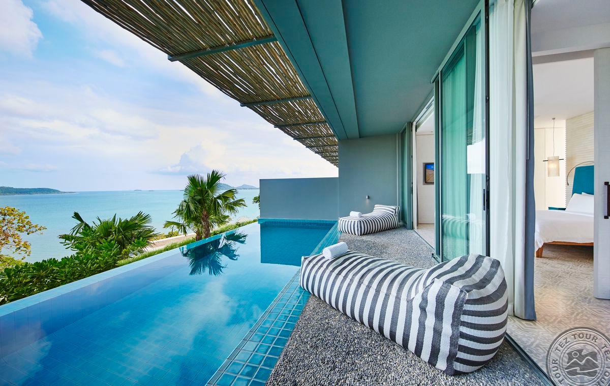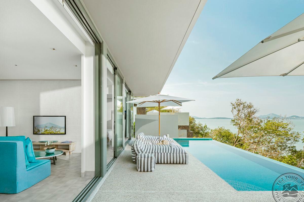 7 вилл 1 Bedroom Pool Villa (вид на море, гостиная и спальня, двуспальная кровать, 2 ванные комнаты (основная и гостевая), кухня, терраса, бассейн, шезлонги, услуги батлера, привилегии, макс. 2+2 или 3 чел., общ. площадь 170 м2);