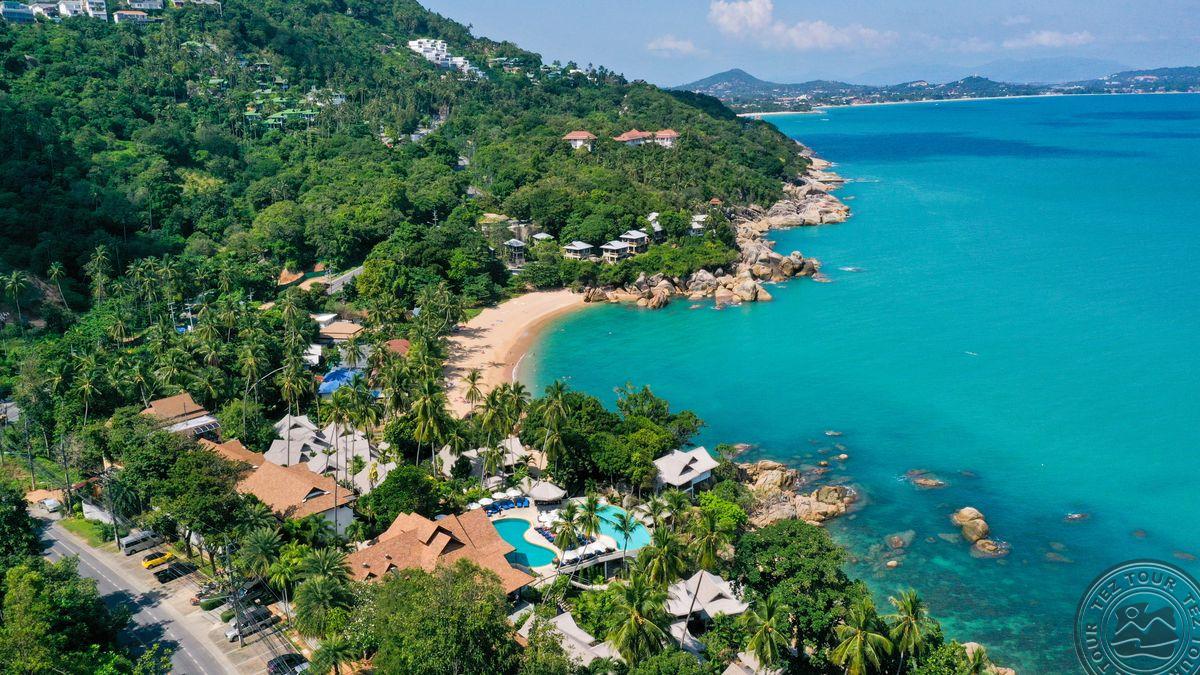 на восточном побережье Самуи, на пляже Coral Cove, в 9 км от аэропорта, в 7 км от центра, на берегу моря.