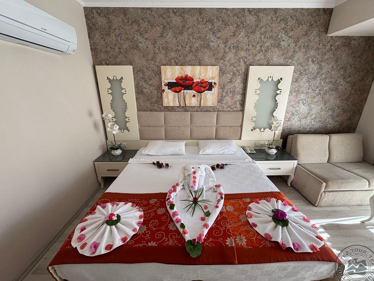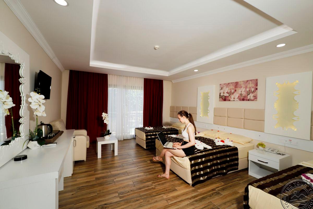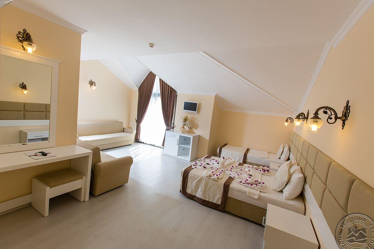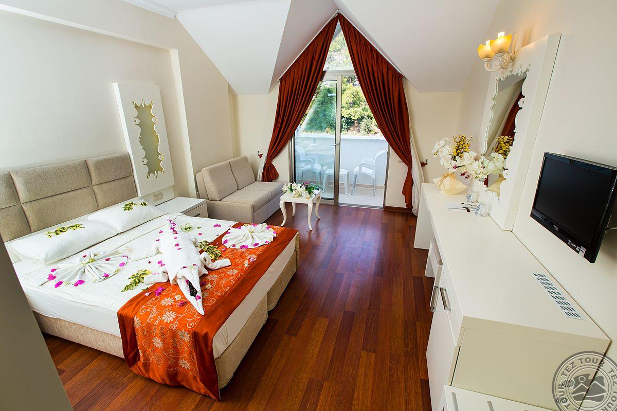 в 62 км от аэропорта г. Анталья, в 7 км от г. Кемер, в поселке Кириш, в 250 м от собственного пляжа.