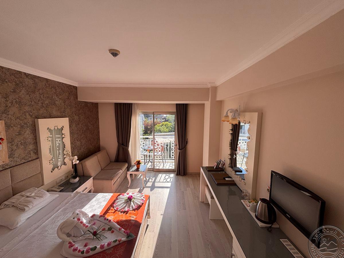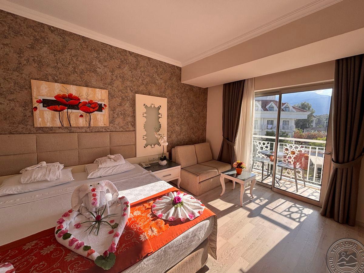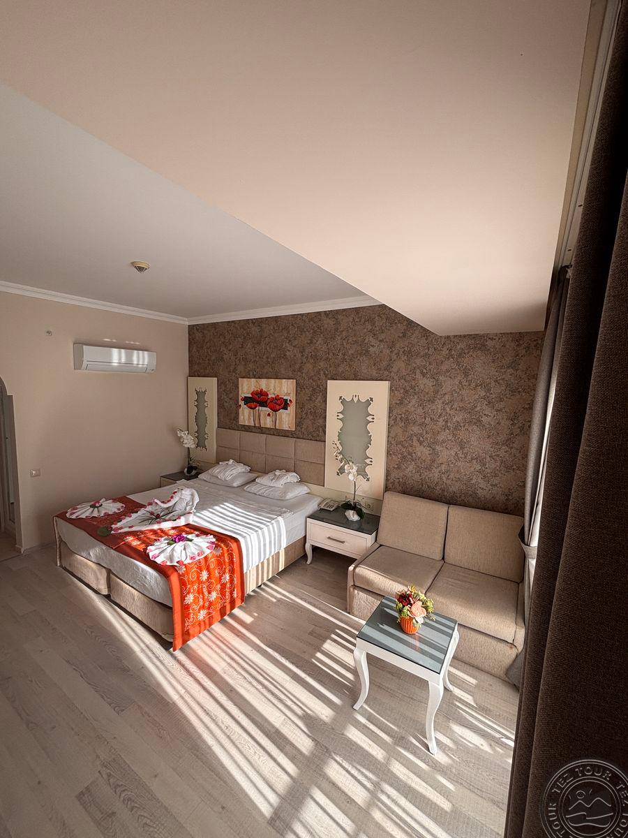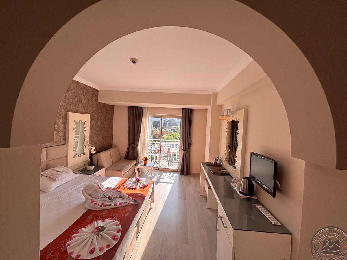 в 62 км от аэропорта г. Анталья, в 7 км от г. Кемер, в поселке Кириш, в 250 м от собственного пляжа.