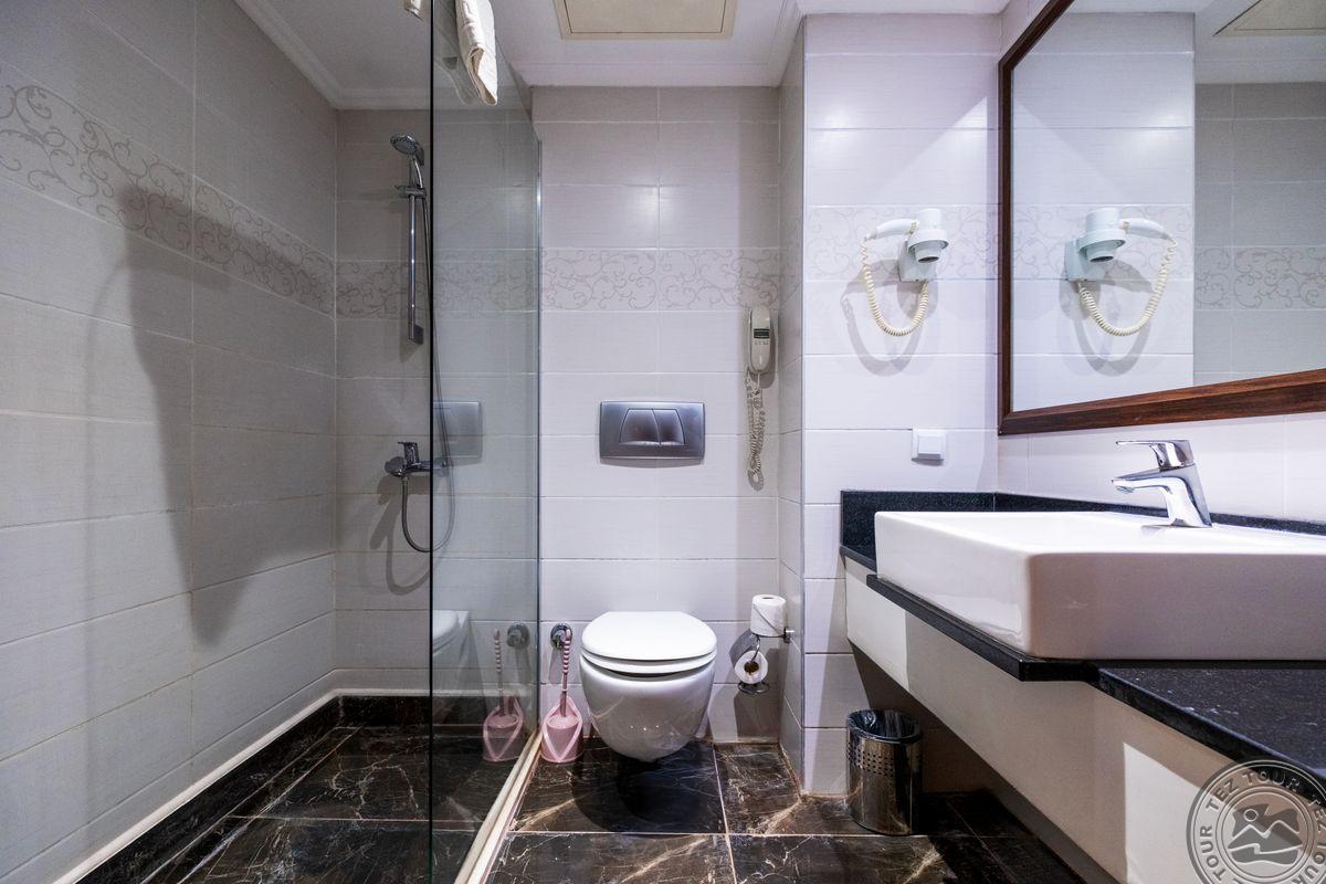 в 65 км от аэропорта г. Анталья, в 5,5 км от г. Кемер, в поселке Кириш, в 250 м через дорогу от собственного пляжа.