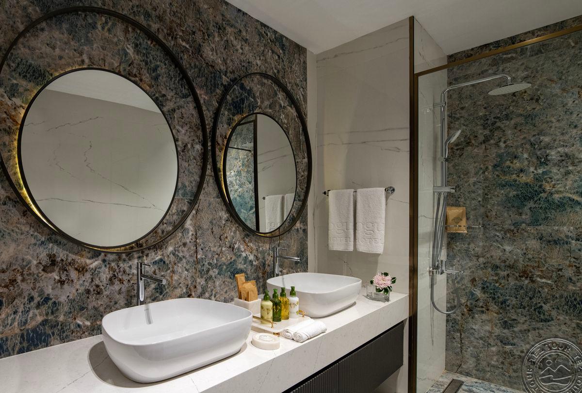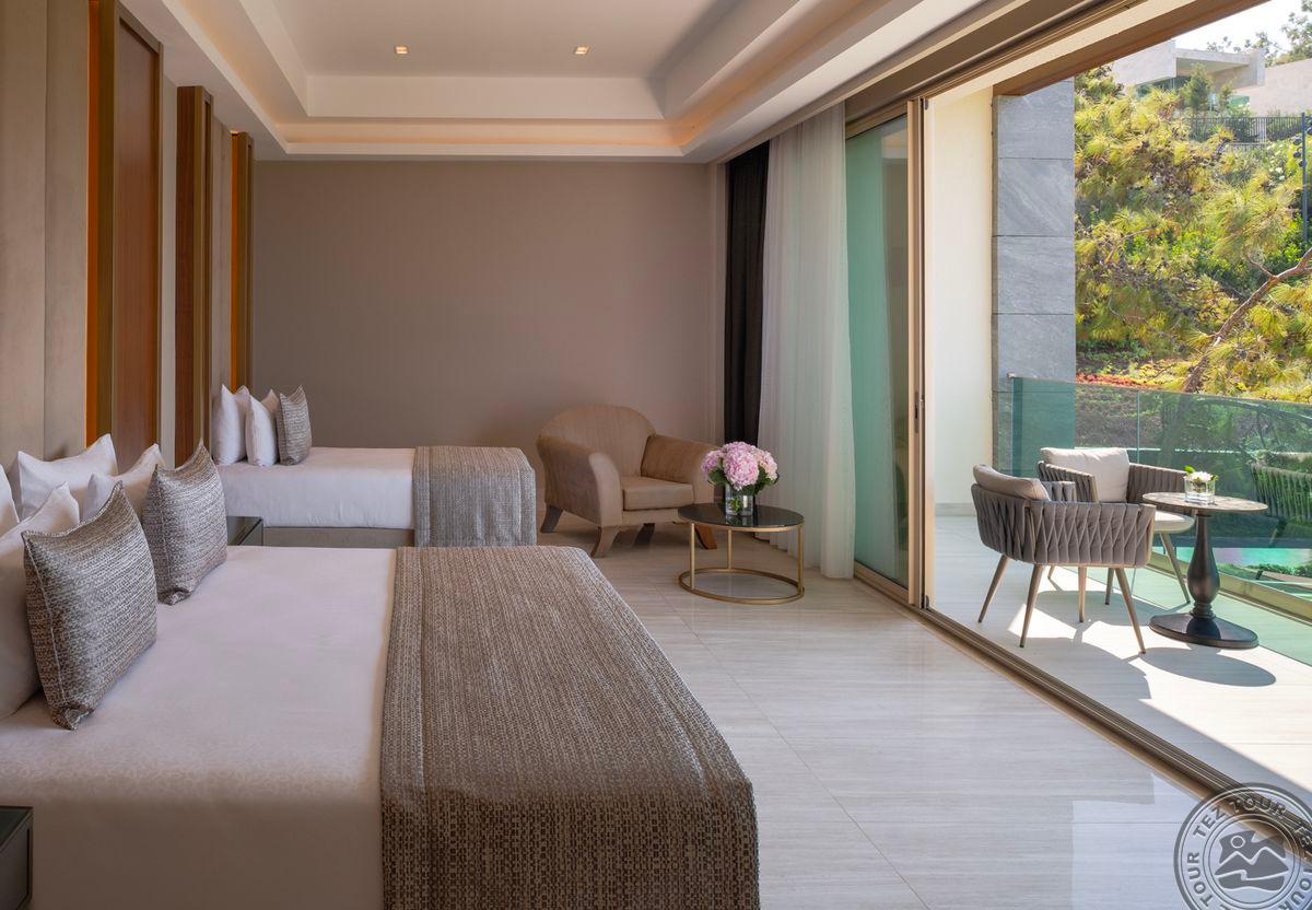 11 двухэтажных Poseidon Villa (вид на море, на первом этаже: индивидуальный бассейн, терраса с шезлонгами, гостиная, спальня с ванной, столовая зона, кухня (микроволновая печь, кухонное оборудование (по запросу), посудомоечная машина), туалет; на втором этаже: 3 спальни с дверью, 3 ванные комнаты, балкон, терраса; макс. 8+1 чел., 330 м2, Vip-сервис);
