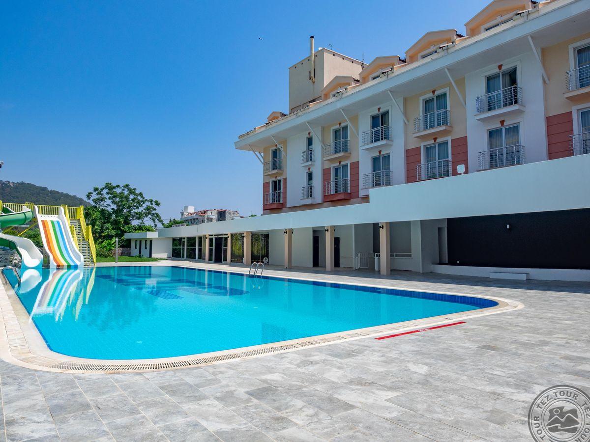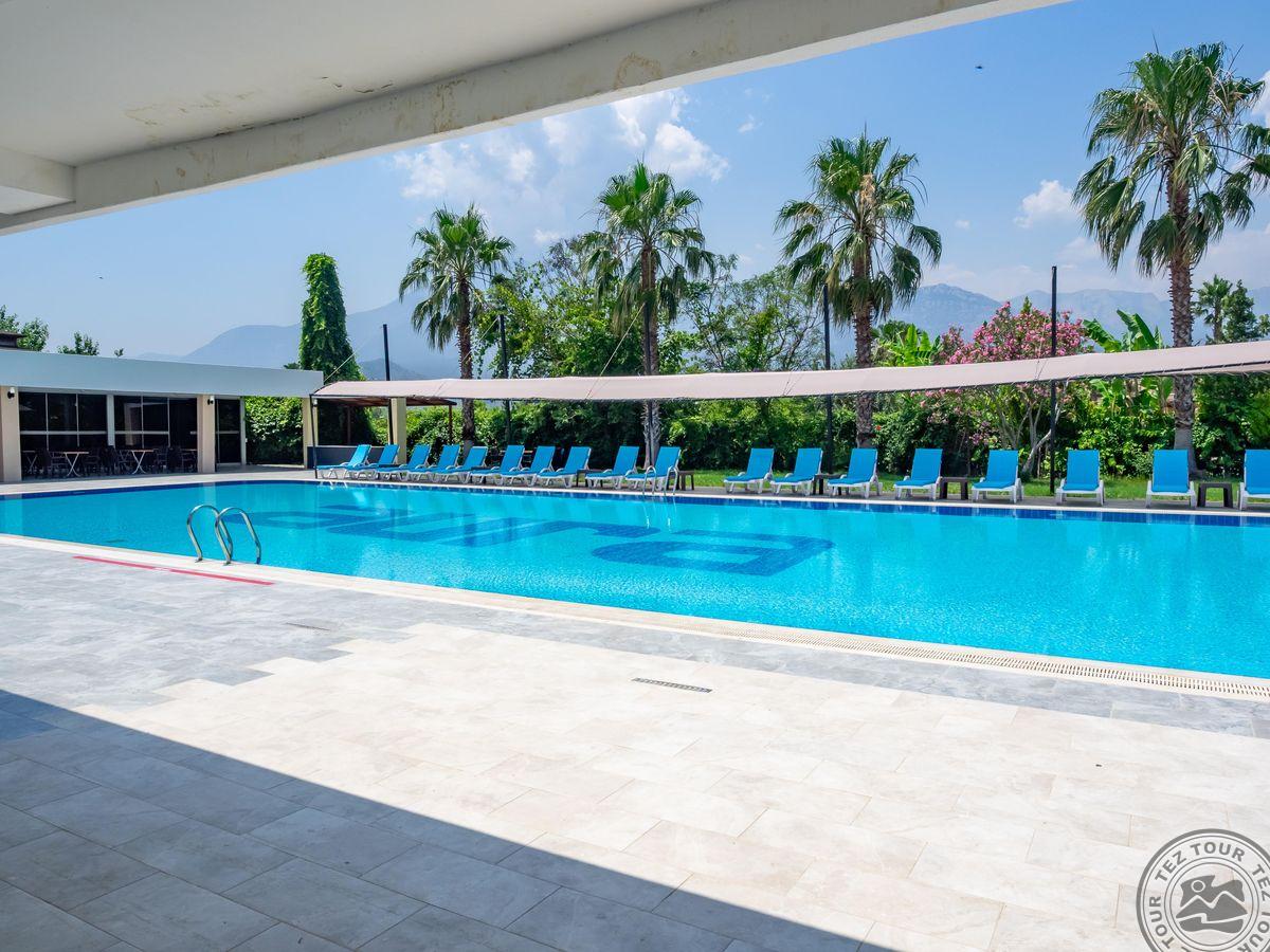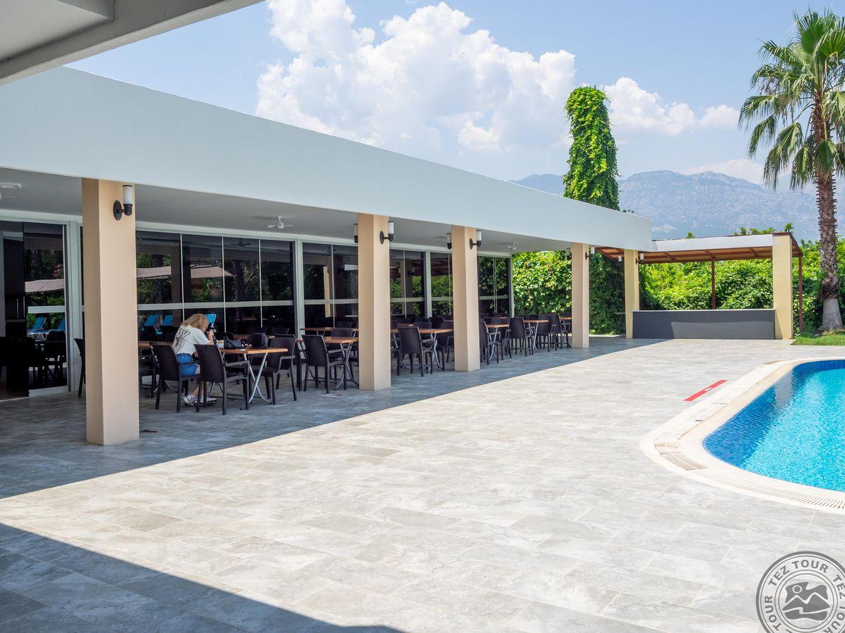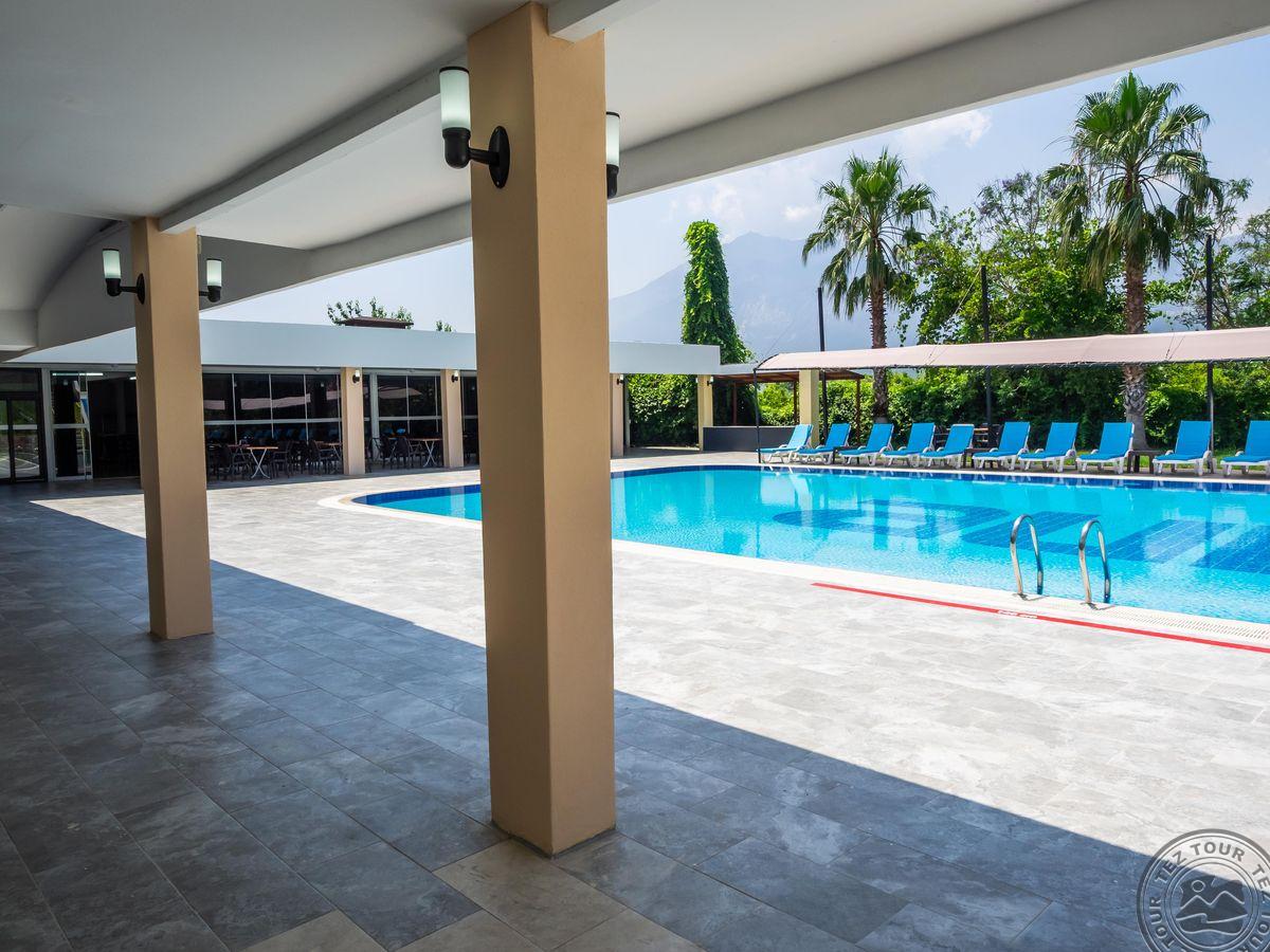в 56 км от аэропорта г. Анталья, в 45 км от центра г. Анталья, в 7 км от г. Кемер, в поселке Кириш, в 250 м через дорогу от пляжа.