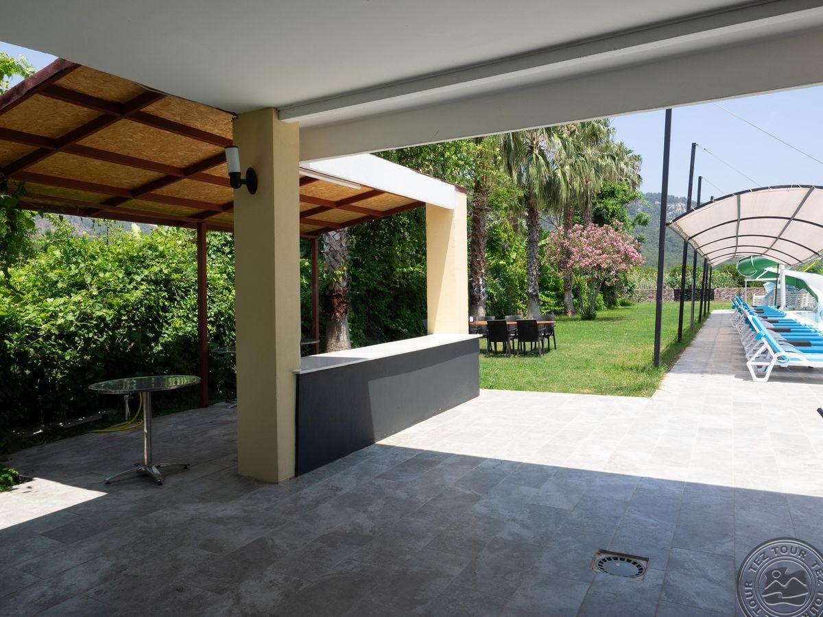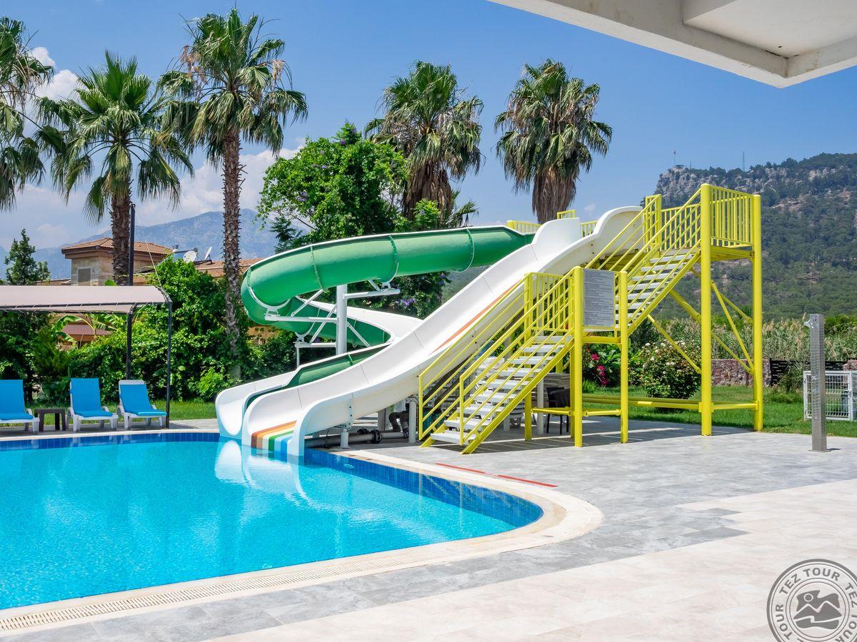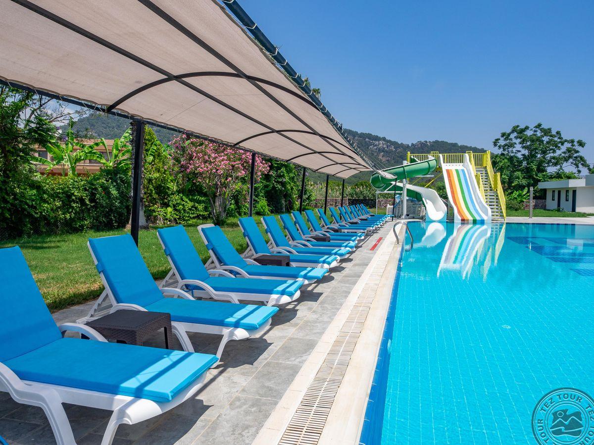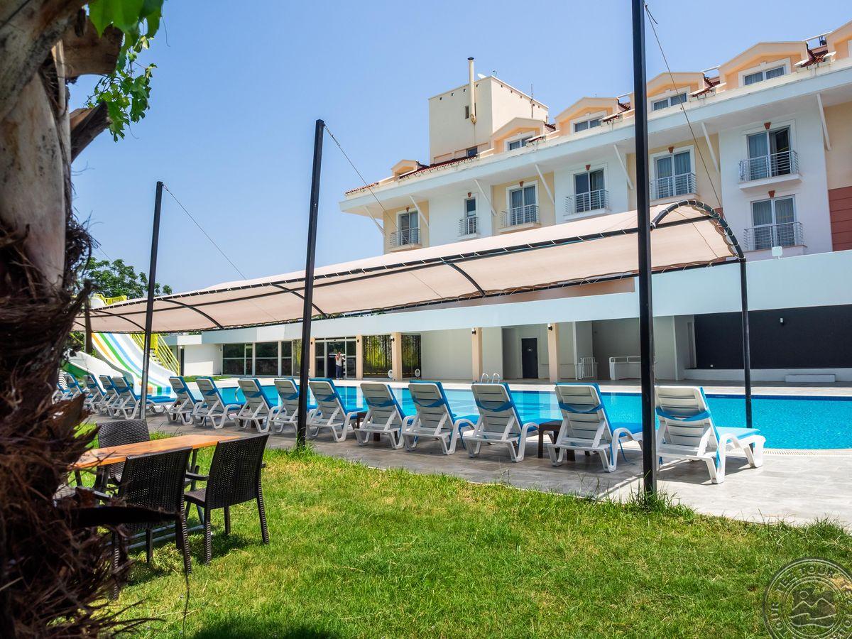 в 56 км от аэропорта г. Анталья, в 45 км от центра г. Анталья, в 7 км от г. Кемер, в поселке Кириш, в 250 м через дорогу от пляжа.