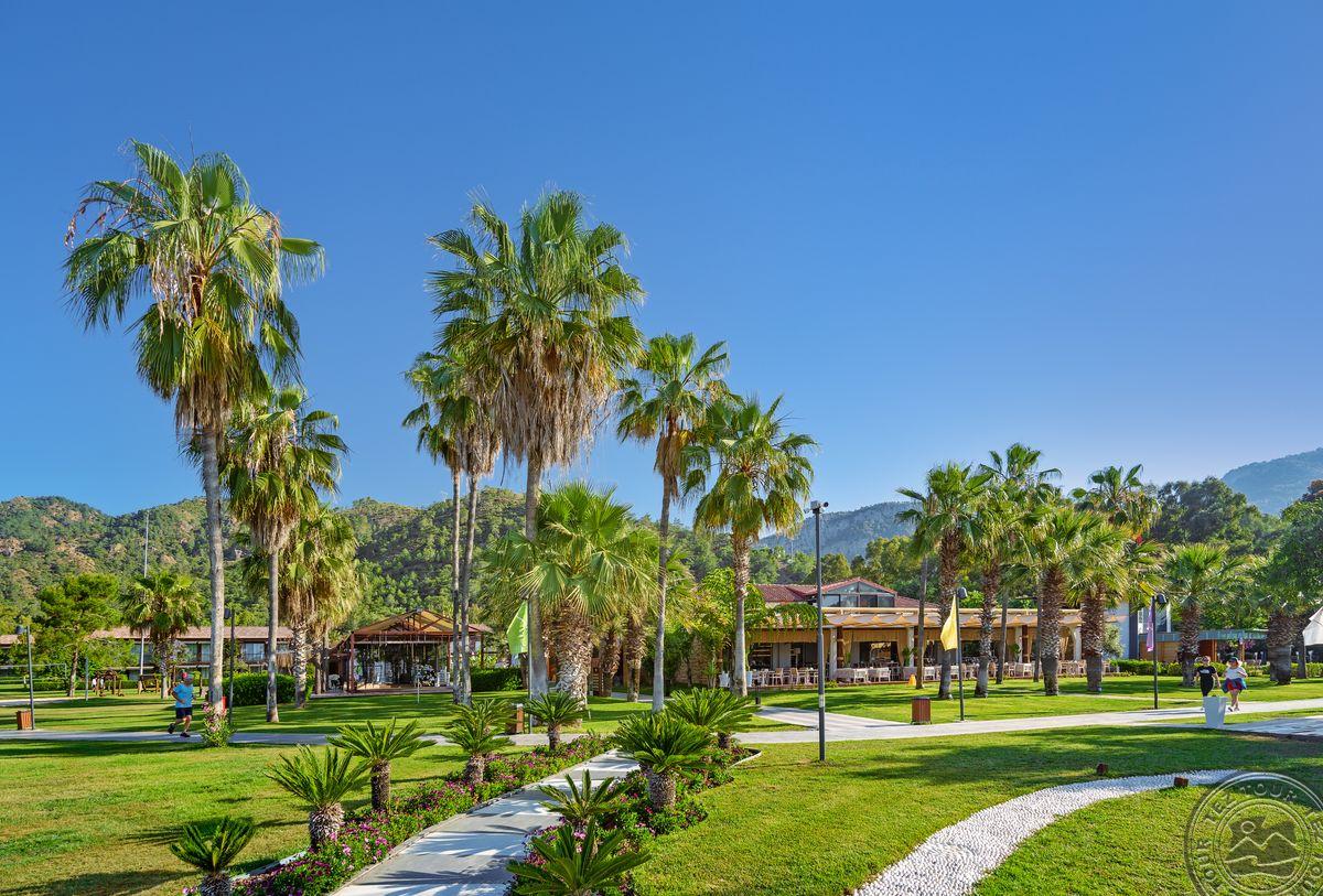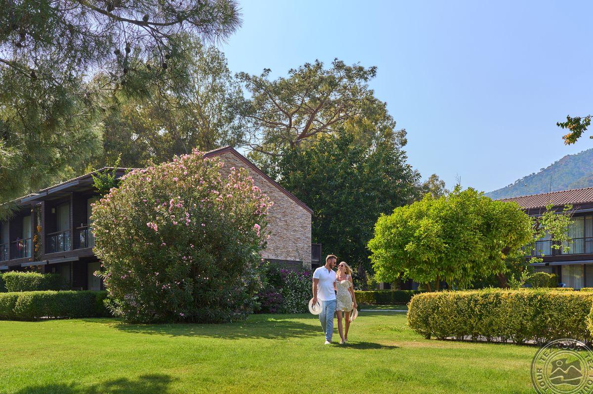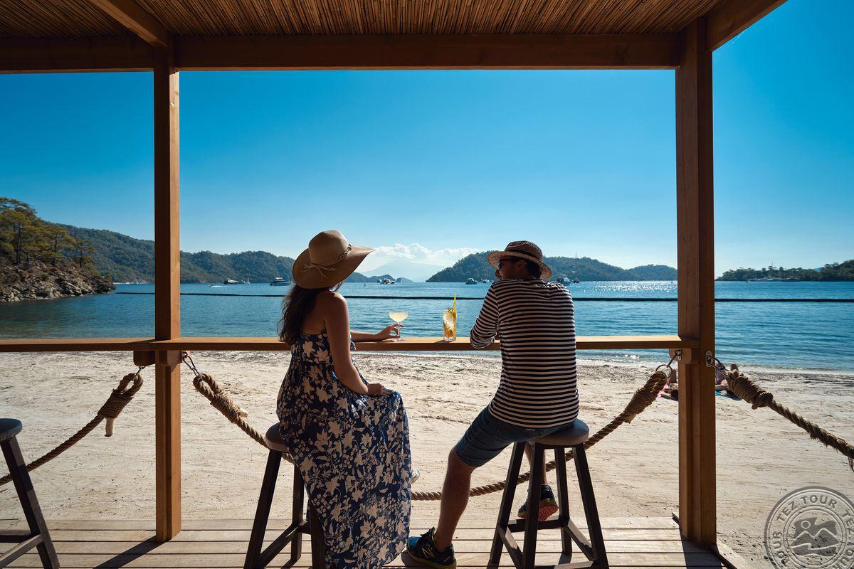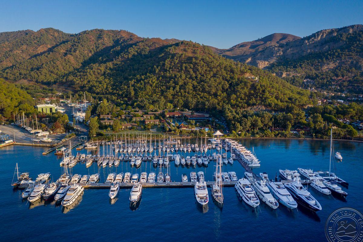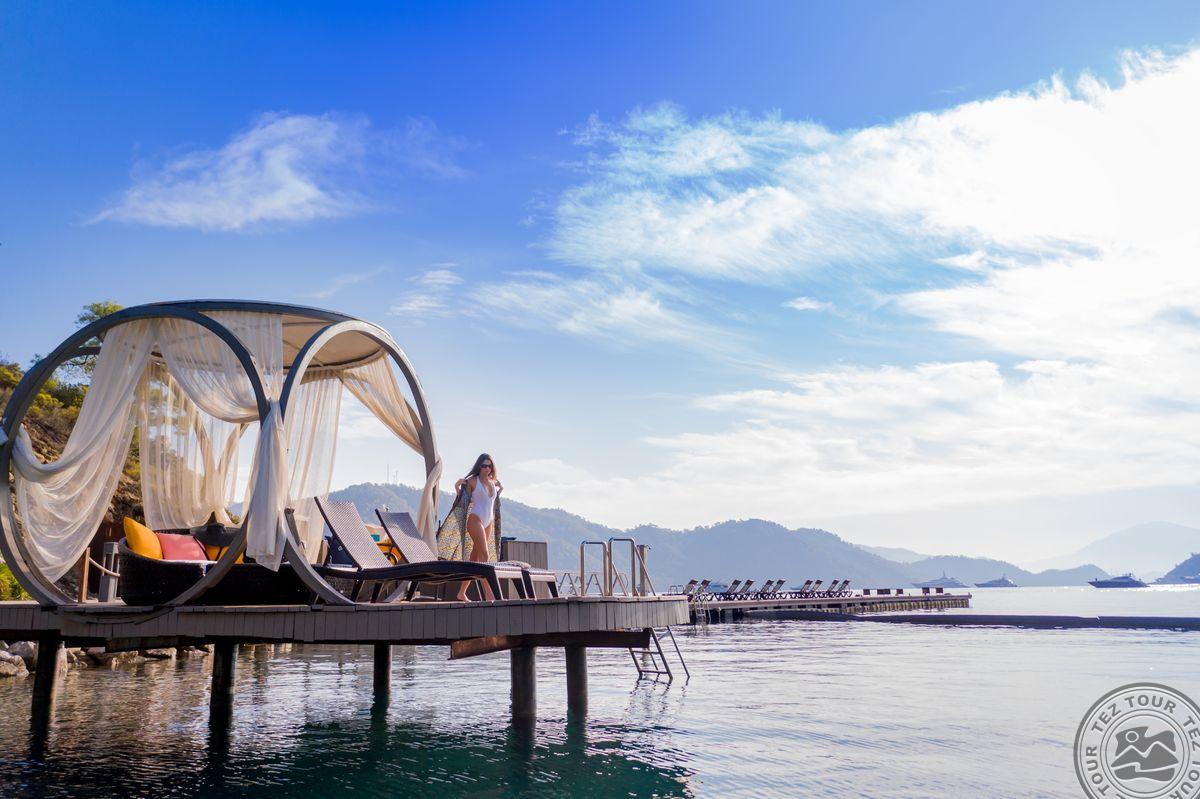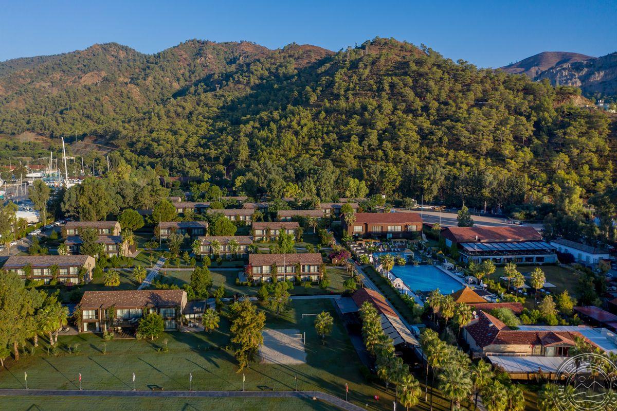в 20 км от аэропорта г. Даламан, в 28 км от г. Фетхие, в поселке Гёчек, на берегу моря.