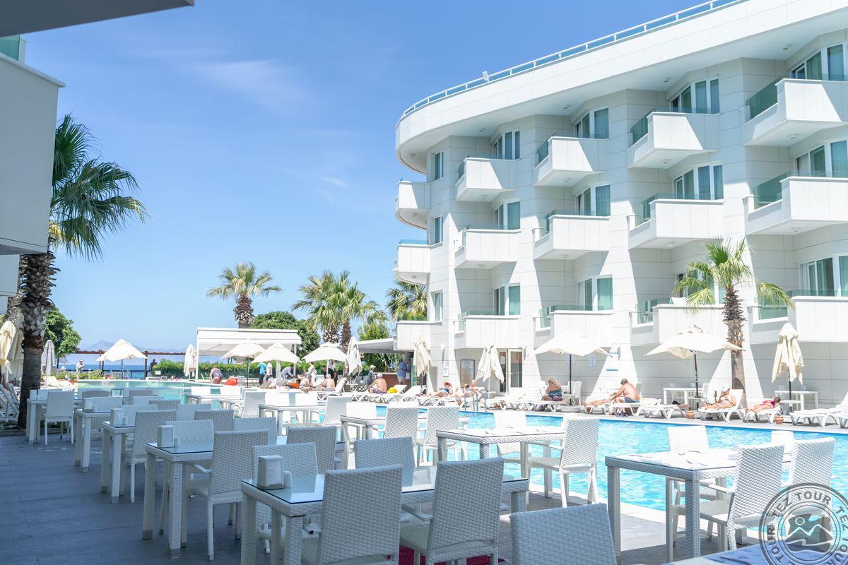 в 55 км от аэропорта Бодрума и в 20 км от центра Бодрума, в 2 км от центра Тургутрейса, на берегу моря.