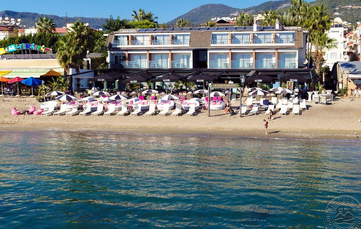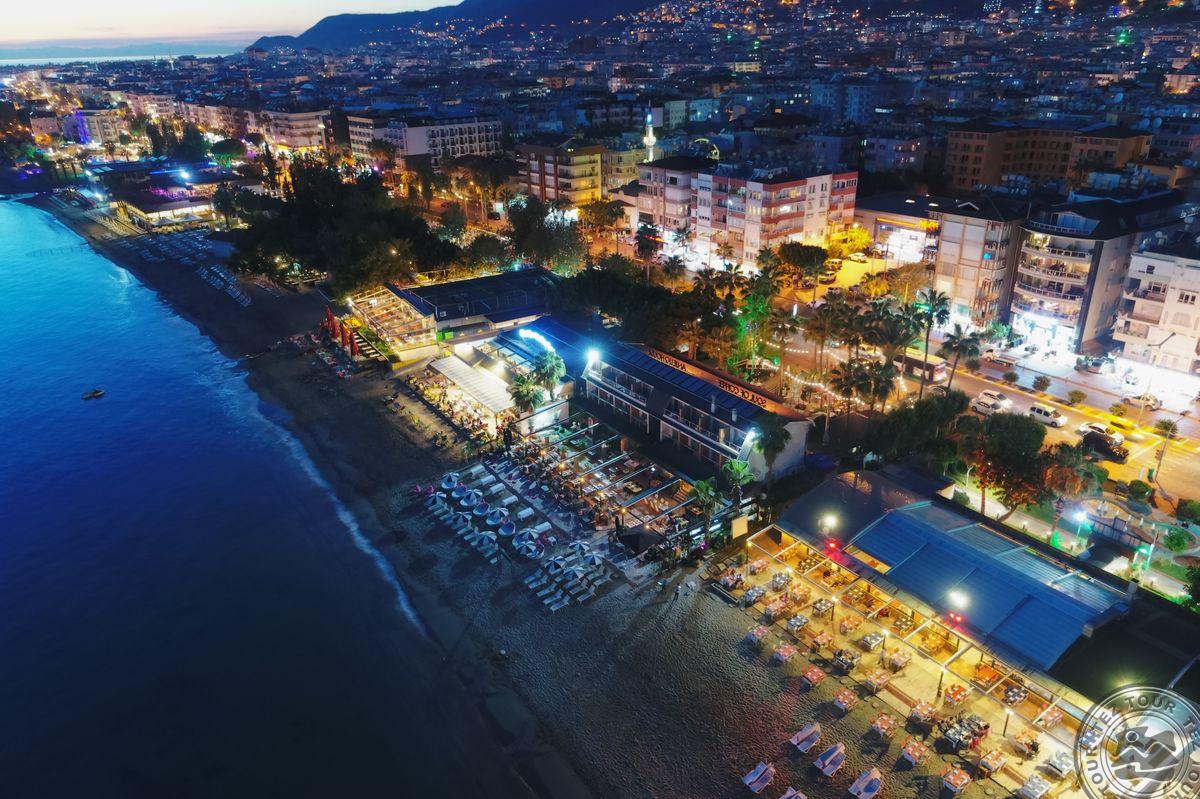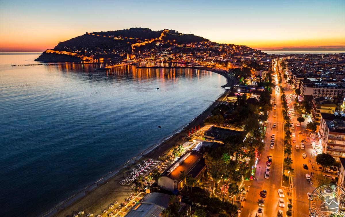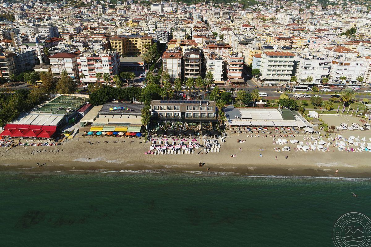 в 150 км от аэропорта г. Анталья, в 44 км от аэропорта Газипаша, в центре г. Аланья, на берегу моря.