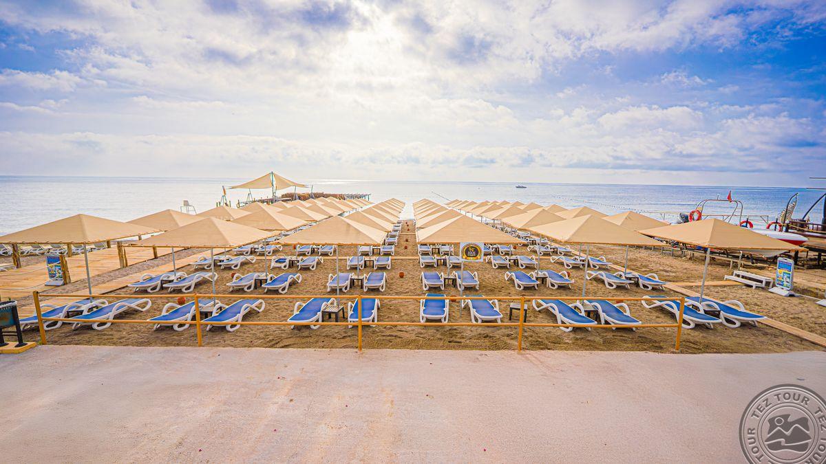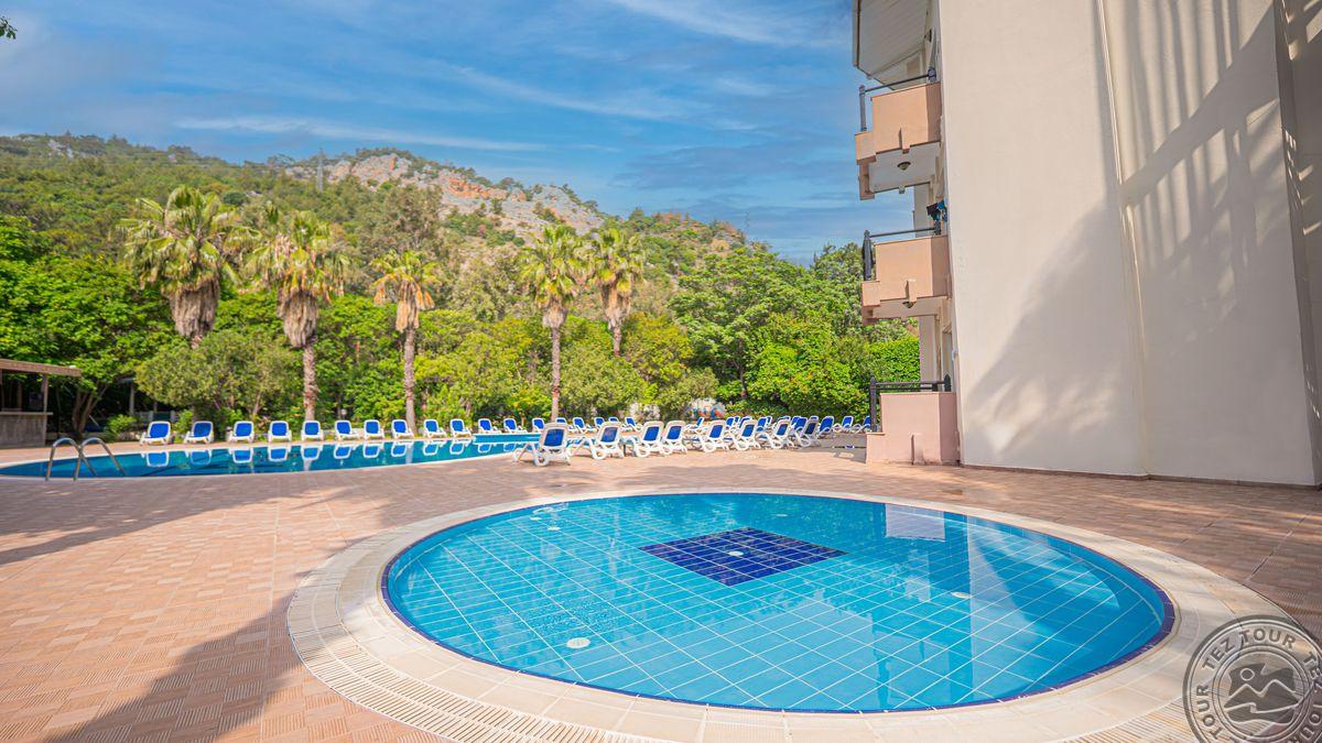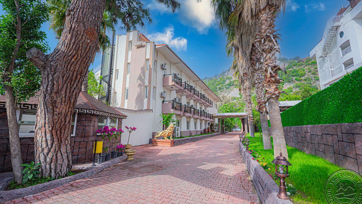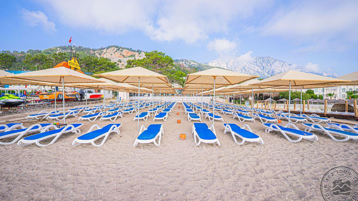 в 40 км от аэропорта г. Анталья, в 12 км от г. Кемер, в поселке Бельдиби, в 50 м от собственного пляжа.