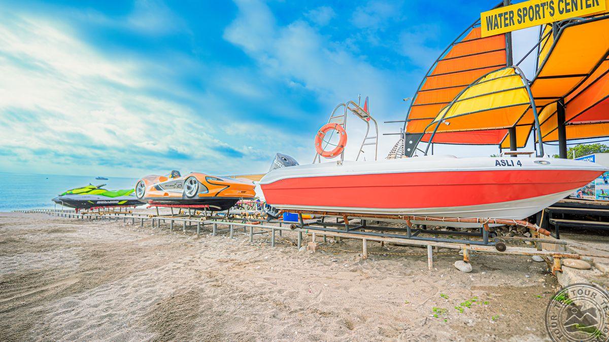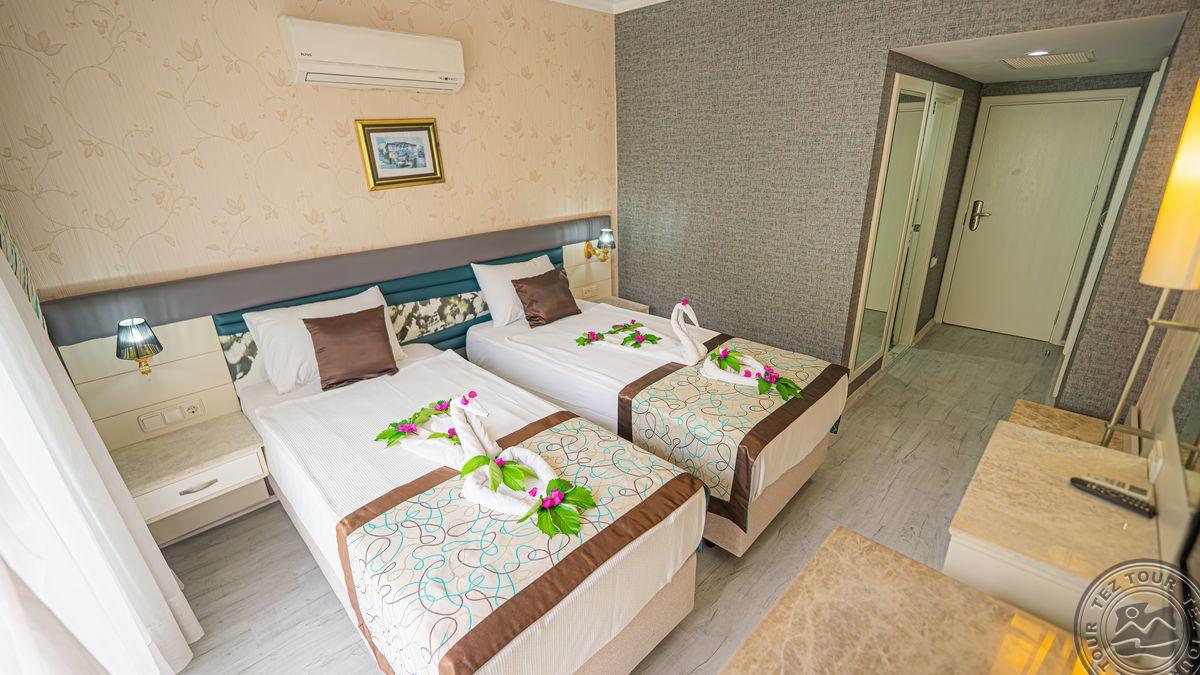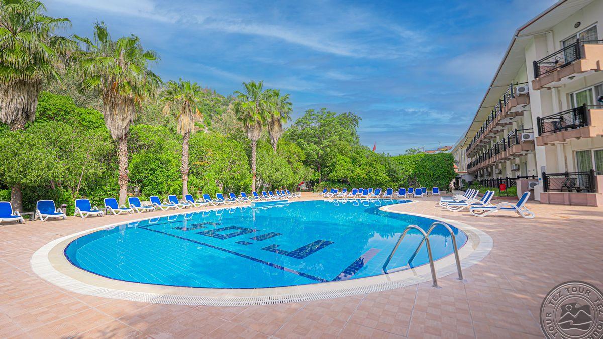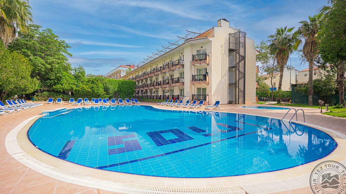 в 40 км от аэропорта г. Анталья, в 12 км от г. Кемер, в поселке Бельдиби, в 50 м от собственного пляжа.