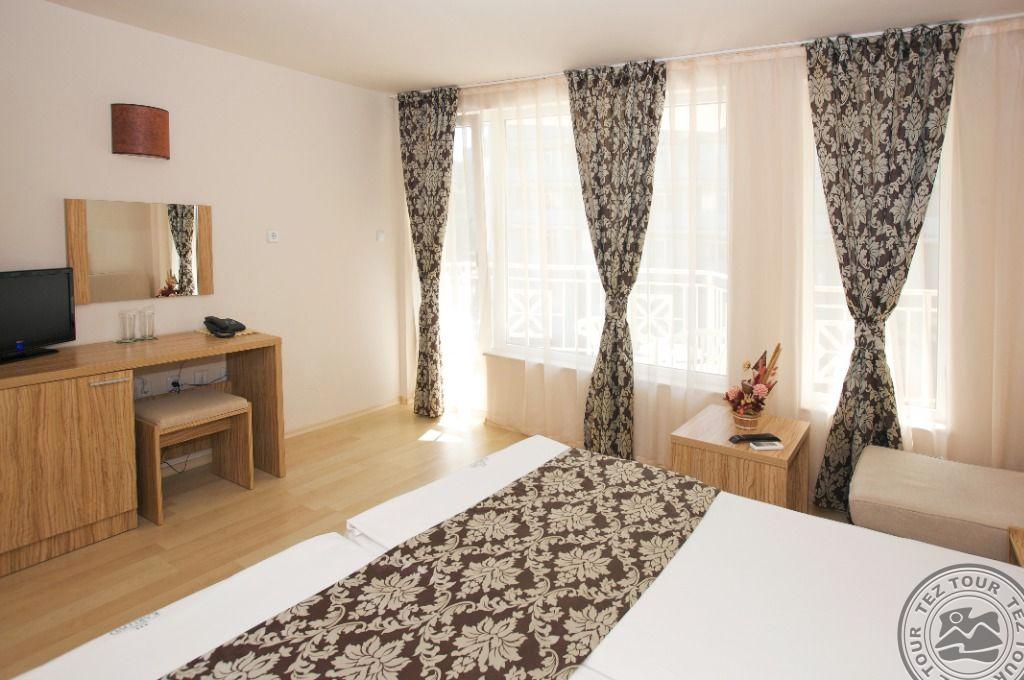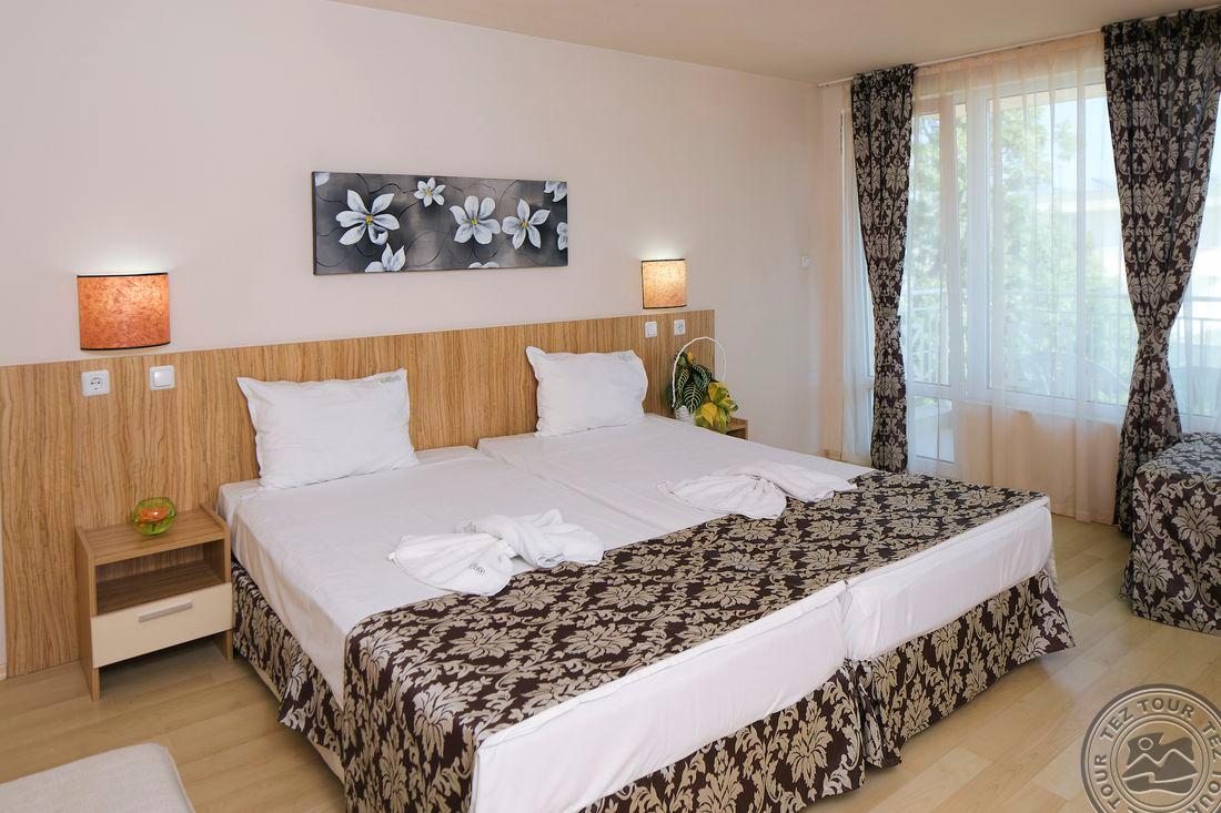в курортном комплексе Солнечный Берег, в 20 км от аэропорта города Бургас, в 500 м от центра курорта и в 200 м от пляжа.