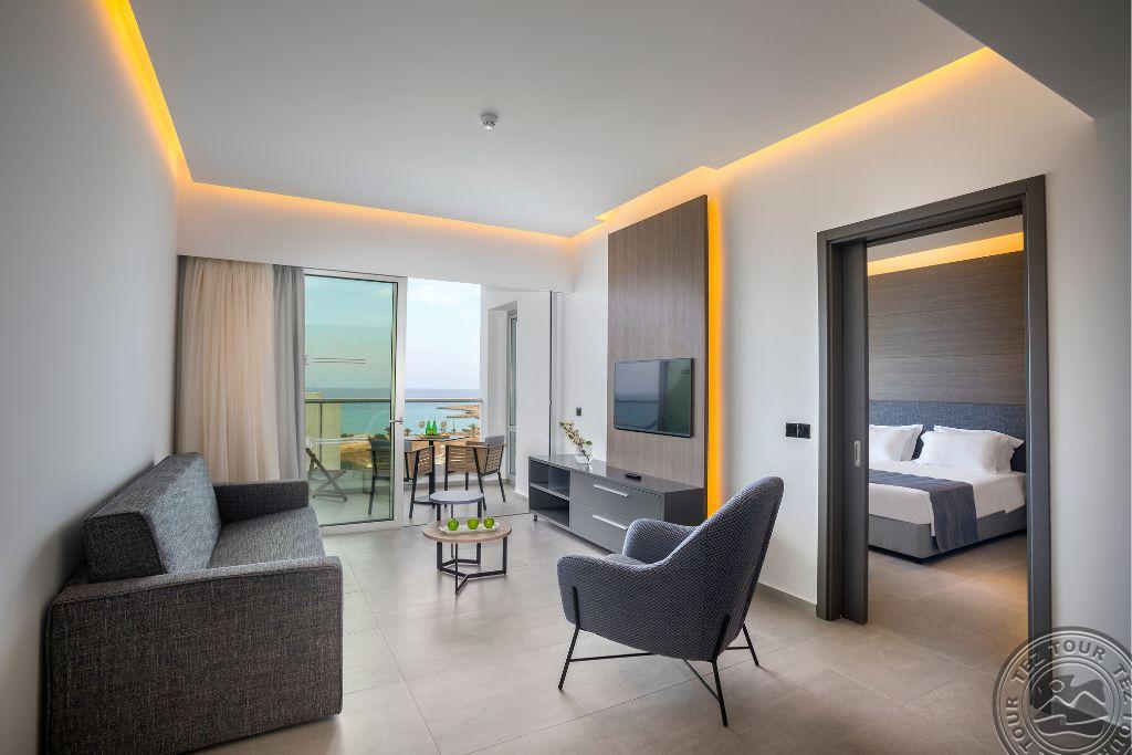 Premier Family Room (31 м2, макс. 4+1 чел.) двухкомнатный номер: гостиная с 2 софами соединена (есть дверь) с главной спальней и ванной комнатой, балкон, прямой вид на море.