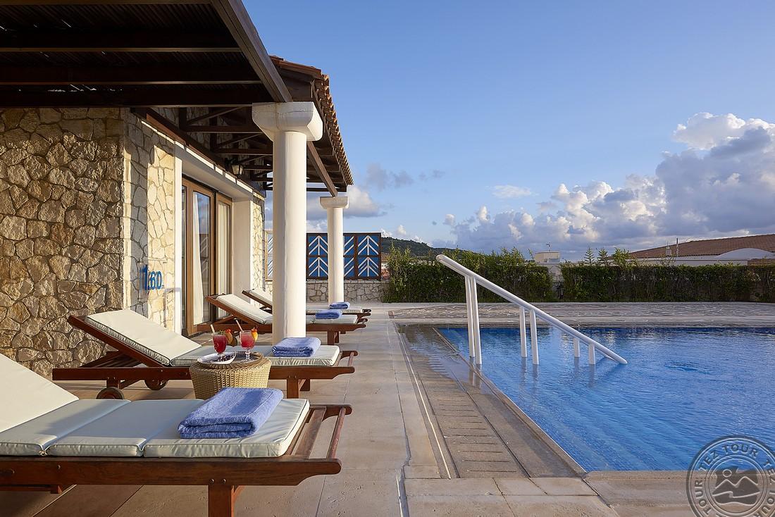Phaidra suite (расположен на побережье, 2 спальни (одна спальня с кабинетной зоной), 2 односпальные кровати в каждой спальне, доп. – односпальная кровать, гостиная с обеденной зоной, 1 ванная комната с джакузи, 1 WC с душевой кабиной, терраса с выходом к индивидуальному бассейну, макс. 5 чел., 110 м2).