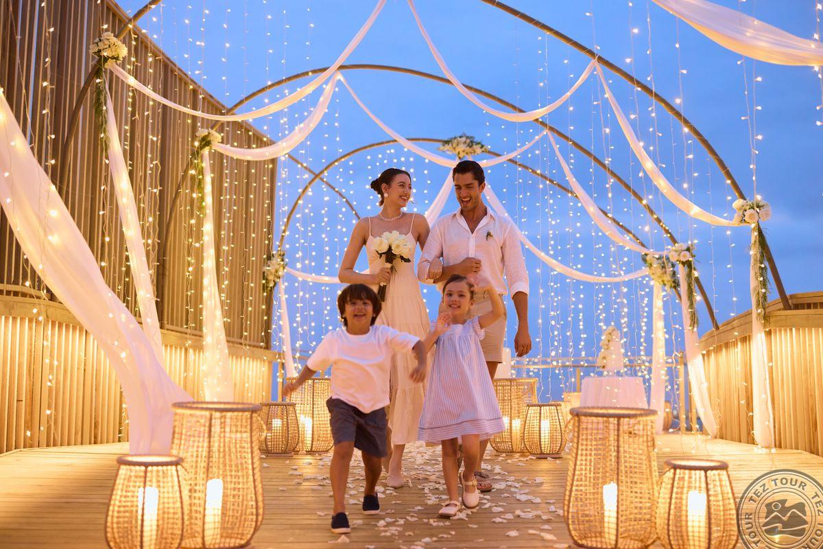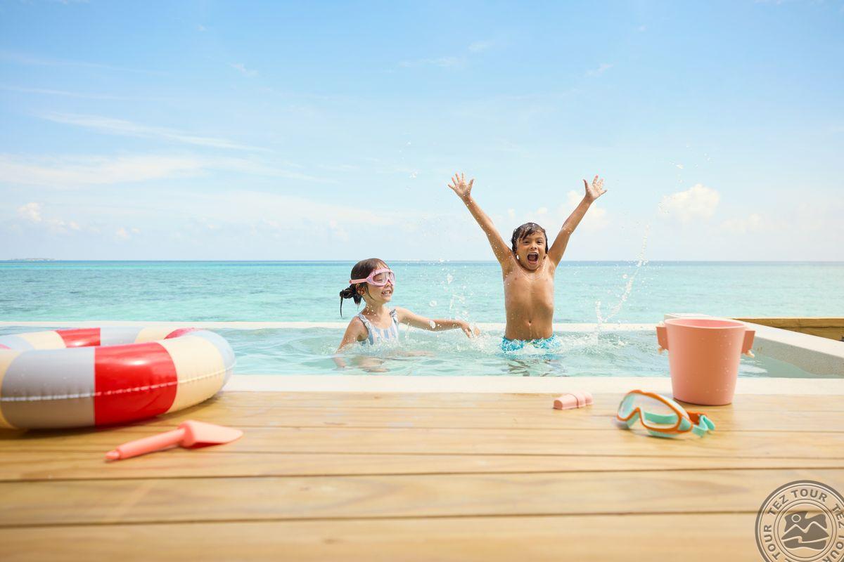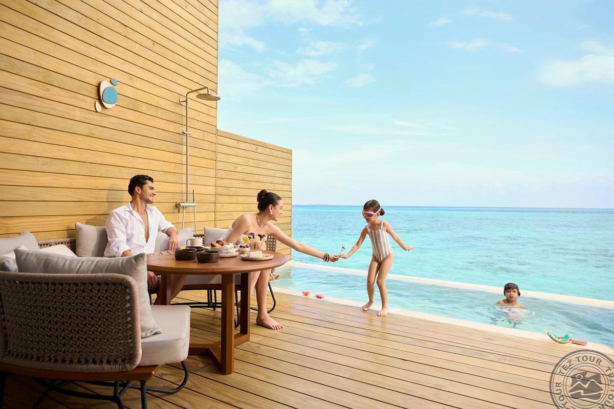 3 Mirage Overwater Sunset Pool Villa (внутри 47 м² + терраса 32 м2, макс. 2+2 чел.). Водные виллы с частным бассейном и видом на закат, расположенные в самом конце западной надводной дуги-мостике. Кровать king-size (2 х 2 м) или две раздельные Hollywood twin (1 х 2 м), а также двухъярусная кровать (1 х 2 м) для детей до 16 лет. Гамак на террасе. Прямой спуск в воду.