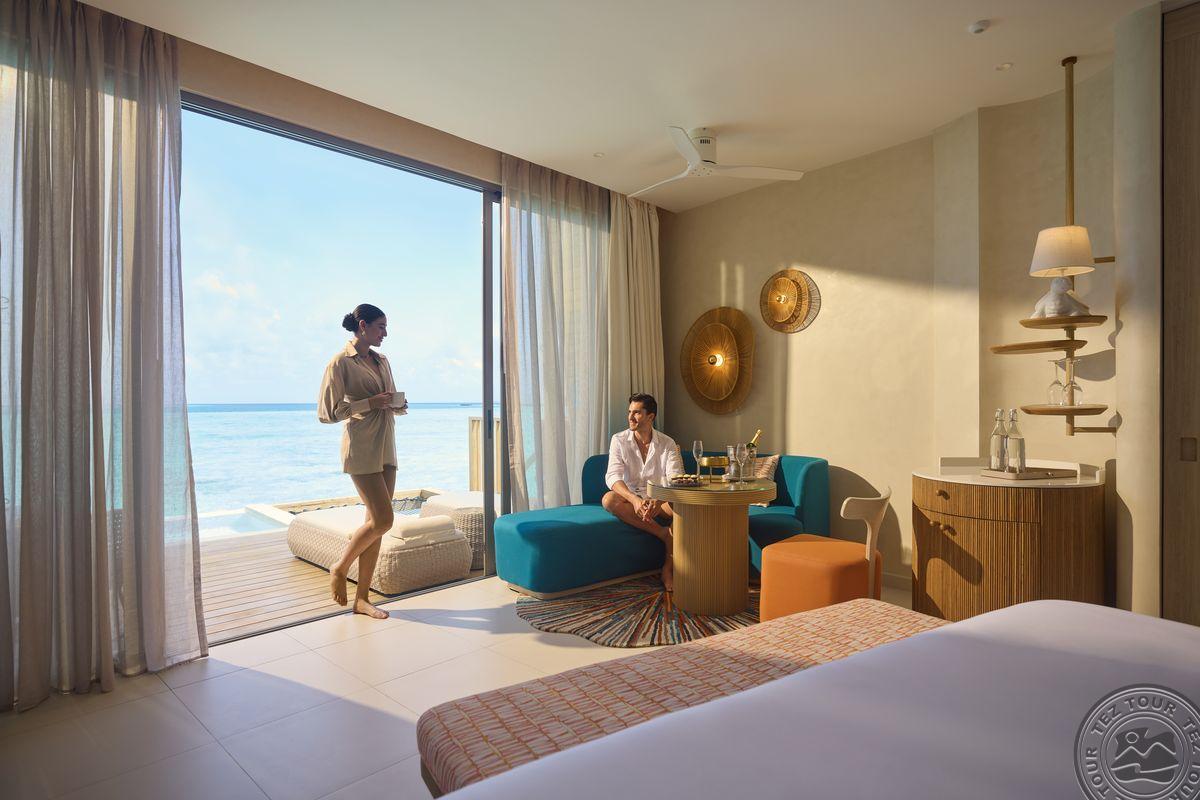 10 Overwater Sunrise Villa with Jacuzzi (внутри 34 м² + терраса 20 м2, макс. 2 чел.). Аналогичны номерам Overwater Villa with Jacuzzi, но имеют вид на восход.