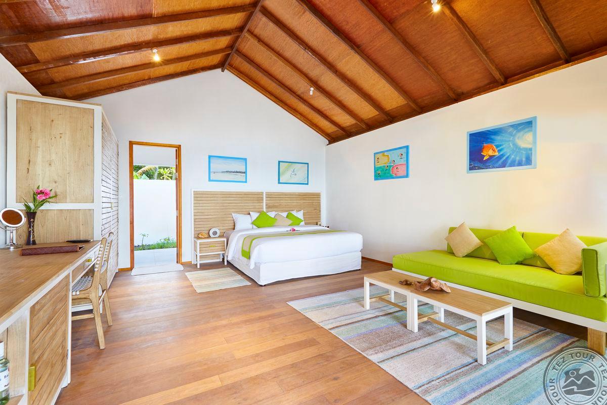 33 Sunset Beach Bungalow (79 м2; макс. 3 или 2 + 2 чел.). По наполнению идентичны номерам Sunrise Beach Bungalow, но расположены с видом на закат.