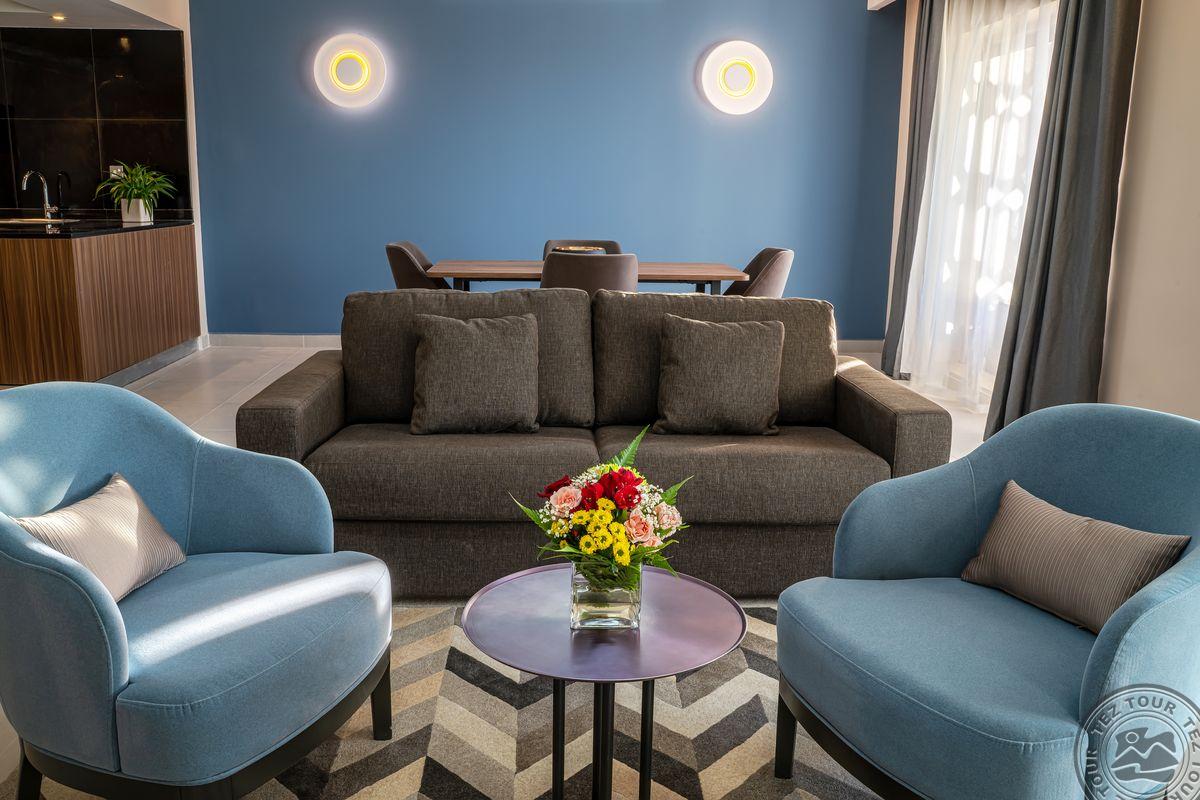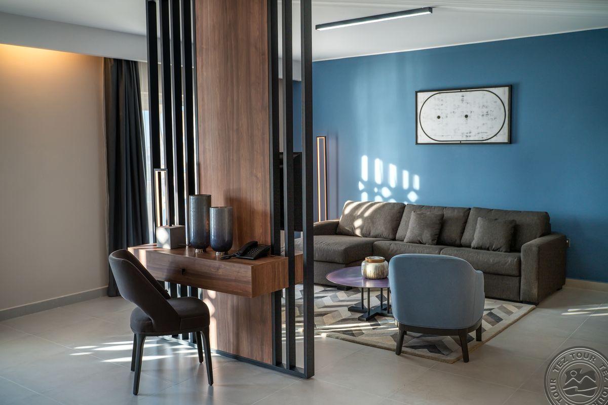 Junior Suite (вид на лагуну и бассейн, 11 и 12 этажи, гостиная и спальня, кровать king, макс. 3 или 2+2 чел., 56 м2).