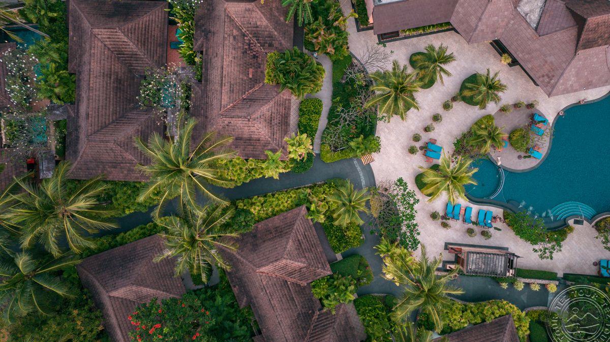 Трехэтажное здание отеля и виллы в расположены в тропическом саду.