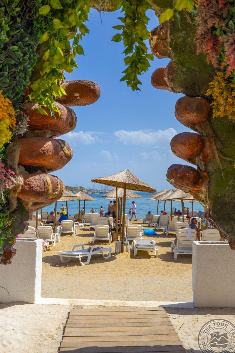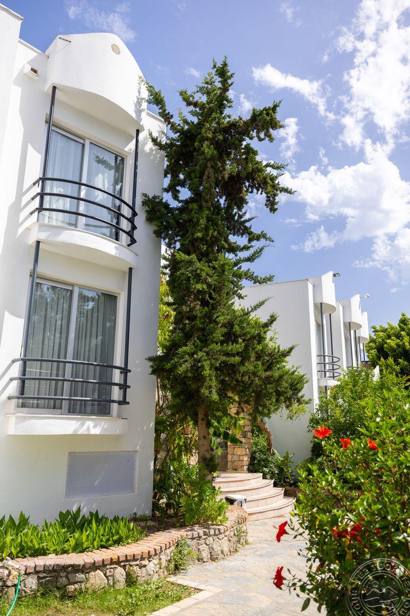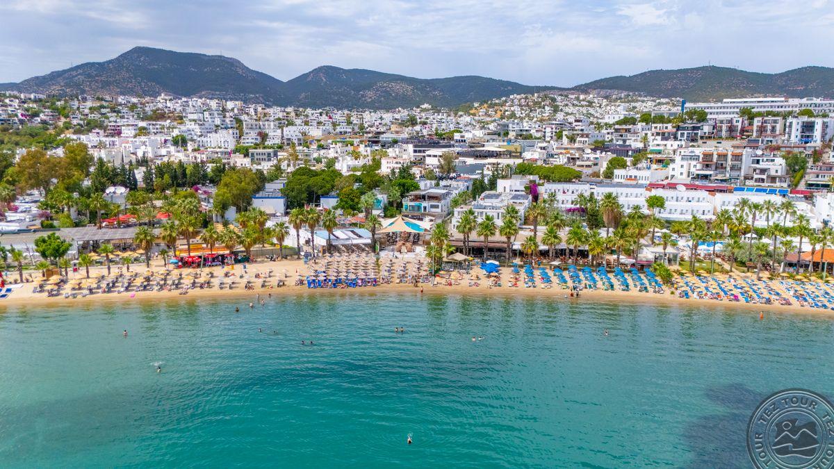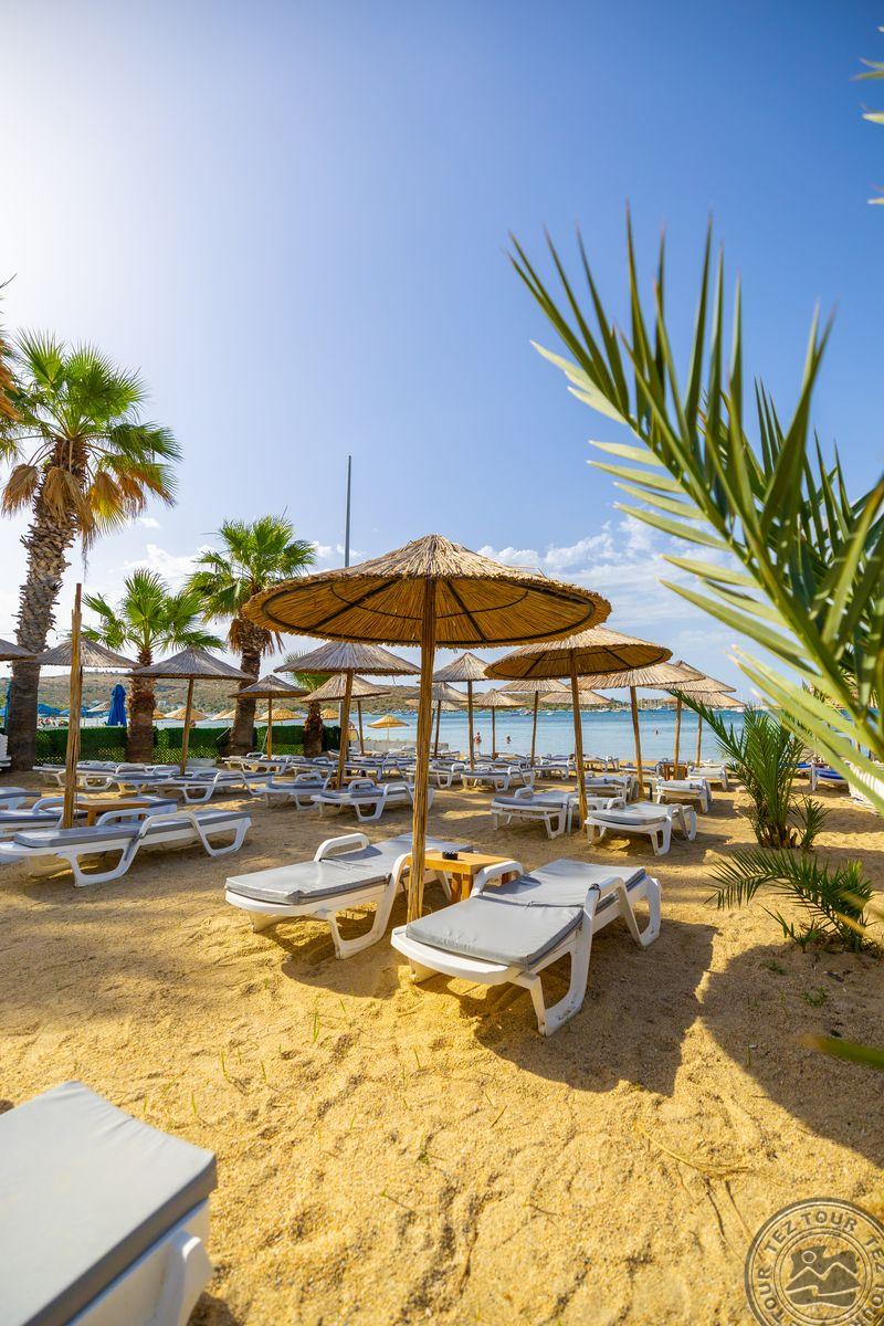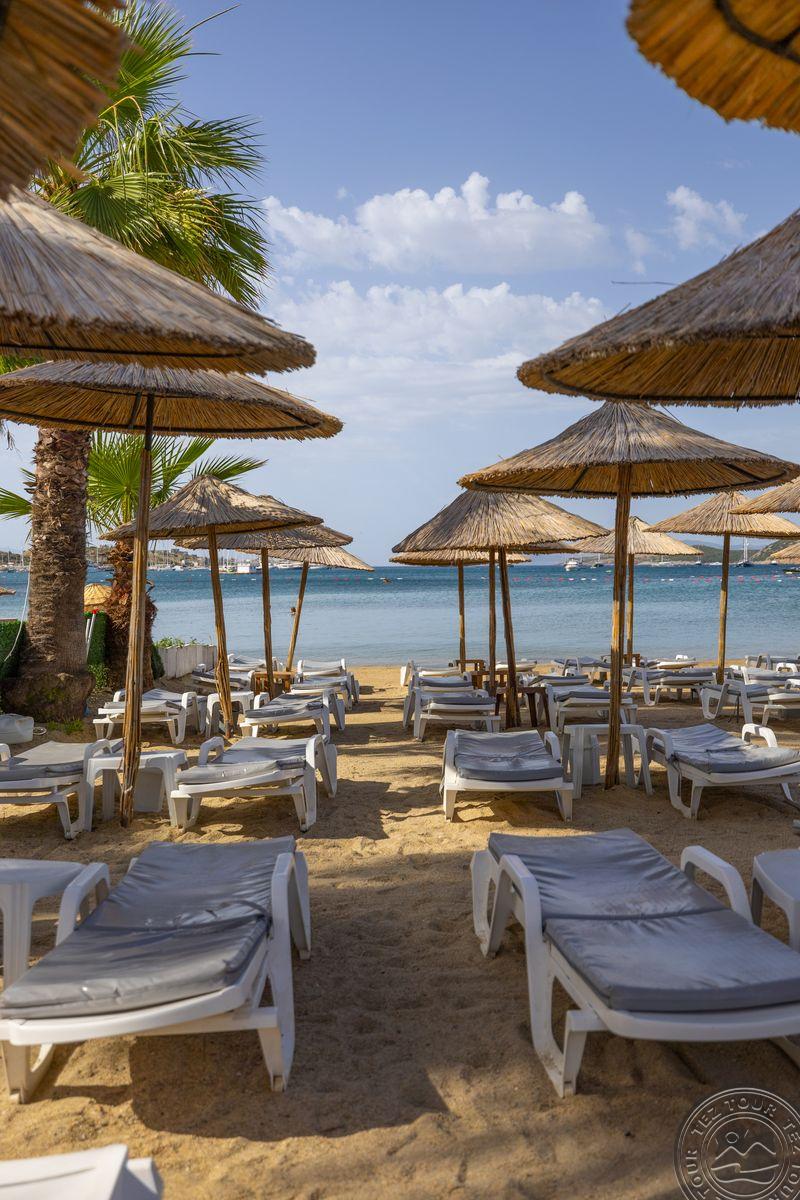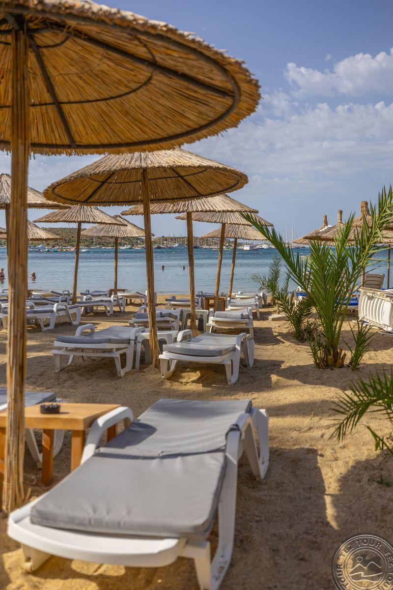 в 500 м от центра Гюмбет, в 4 км от центра Бодрума, в 45 км от аэропорта, на берегу моря.