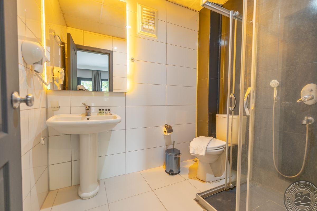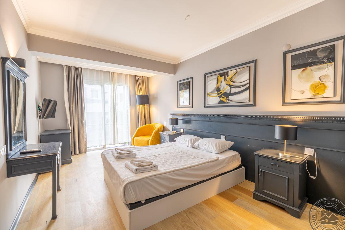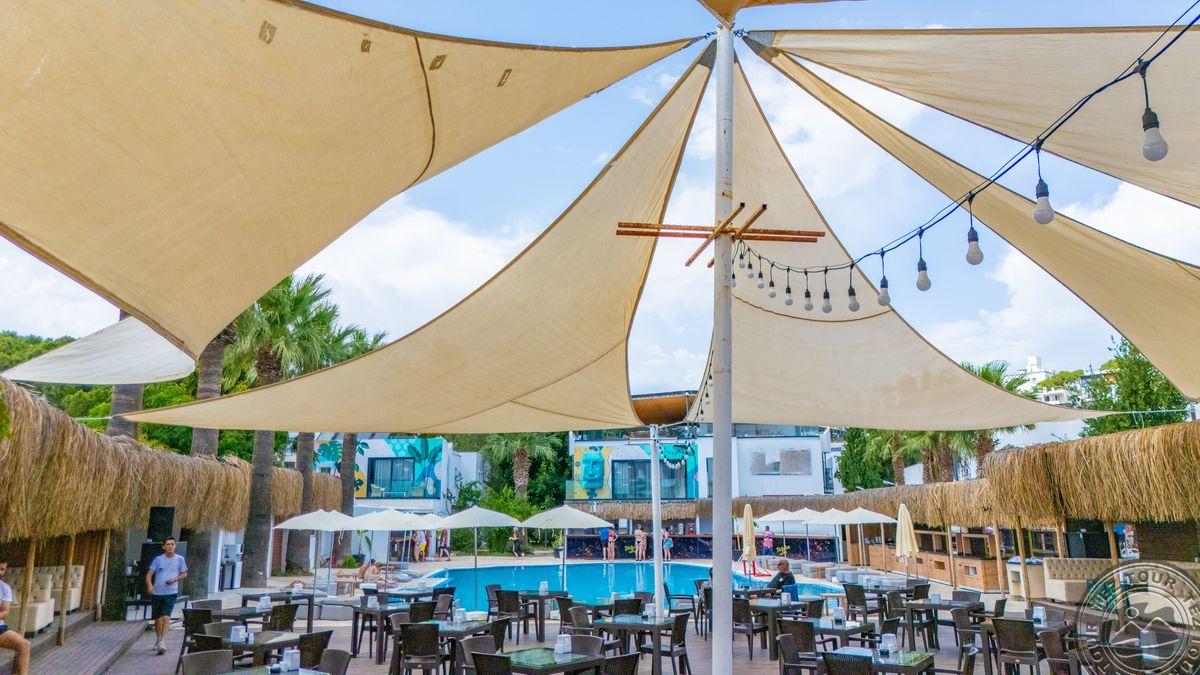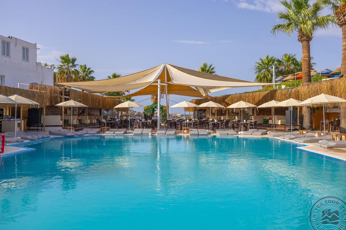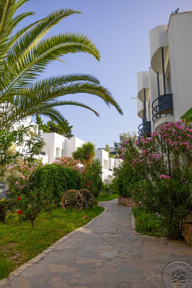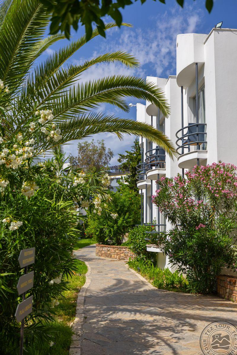 в 500 м от центра Гюмбет, в 4 км от центра Бодрума, в 45 км от аэропорта, на берегу моря.