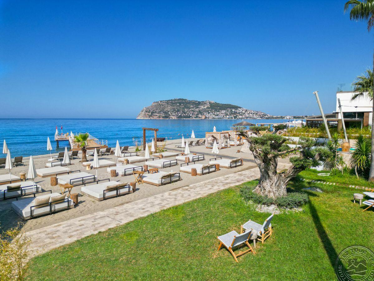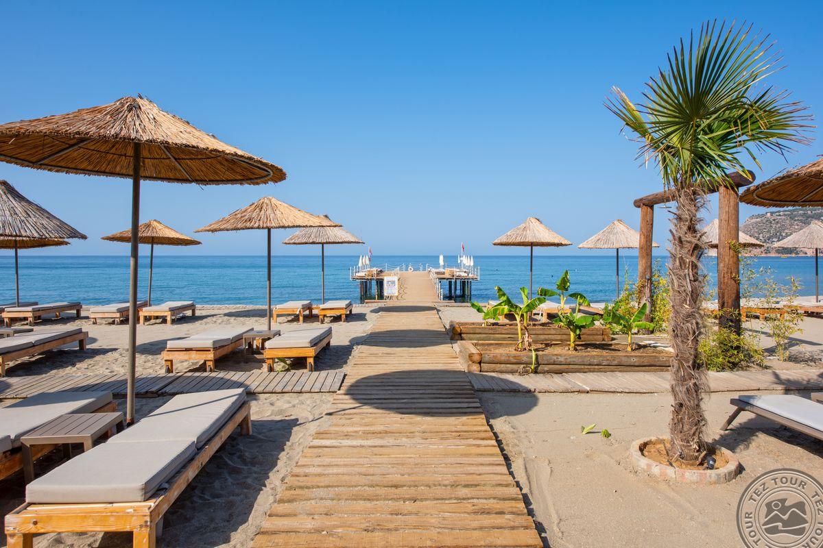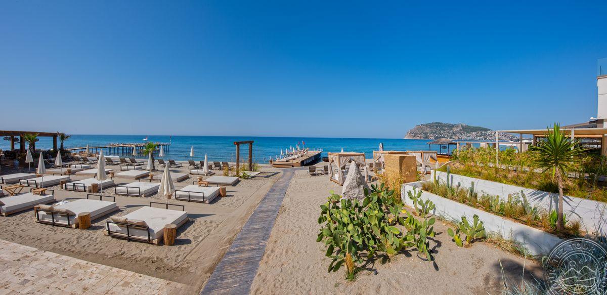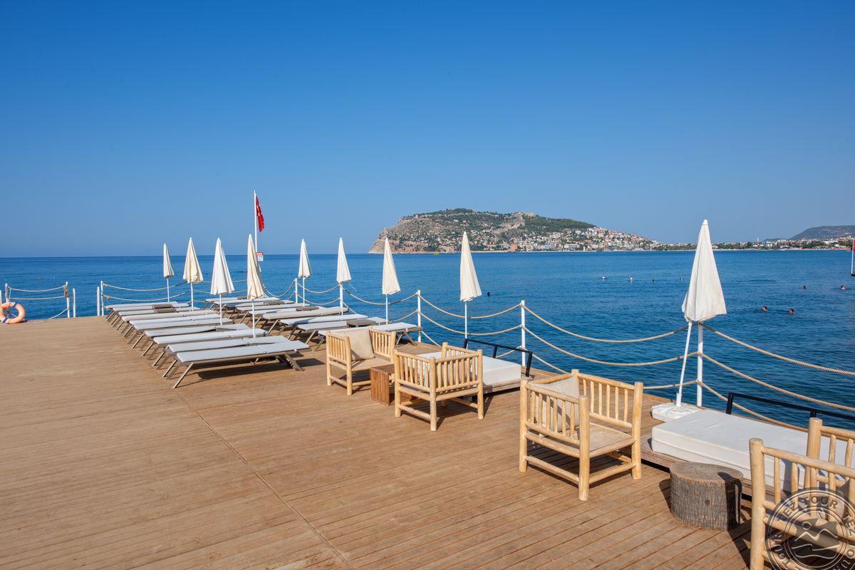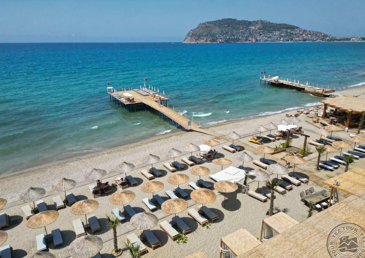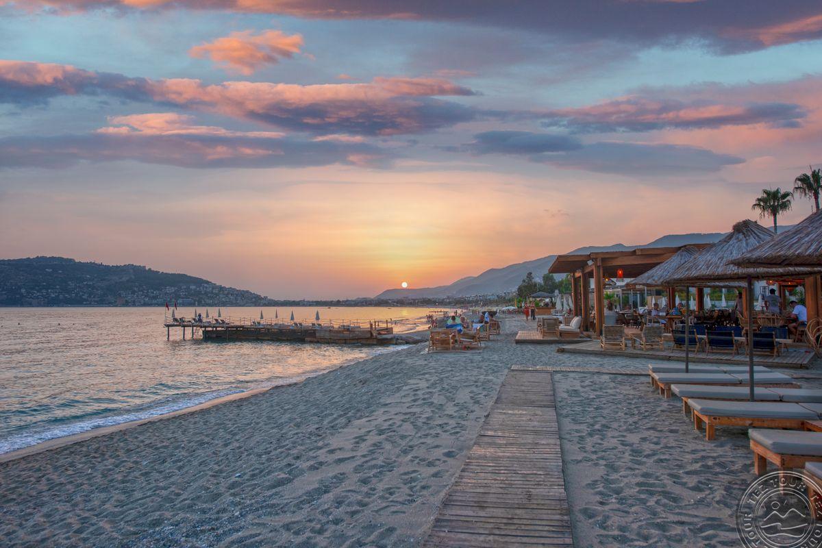 в 129 км от аэропорта г. Анталья, в 38 км от аэропорта Алании, в 6 км от центра г. Аланья, на берегу моря.