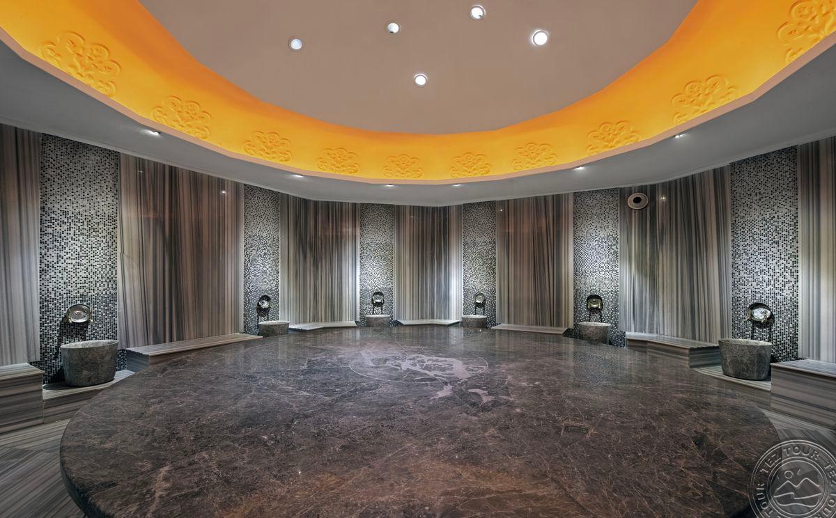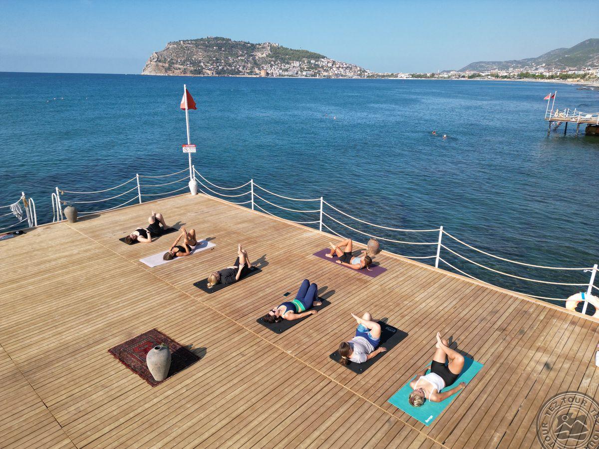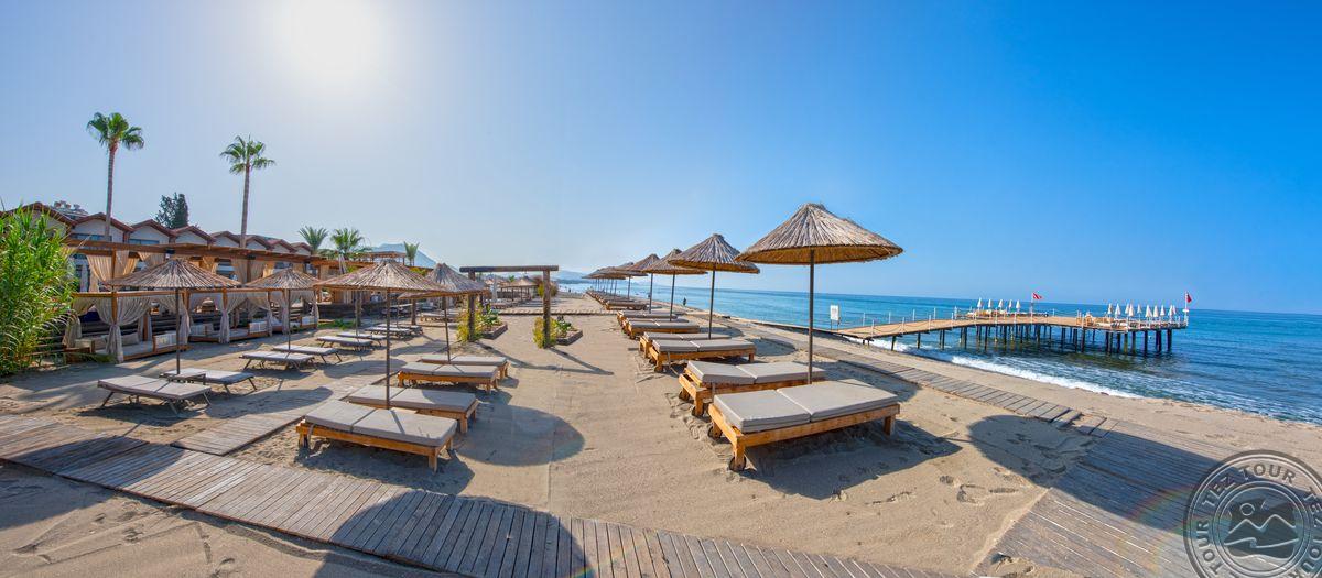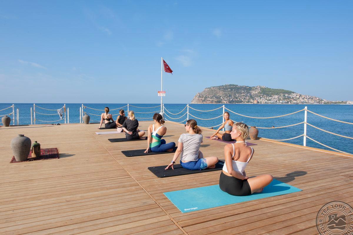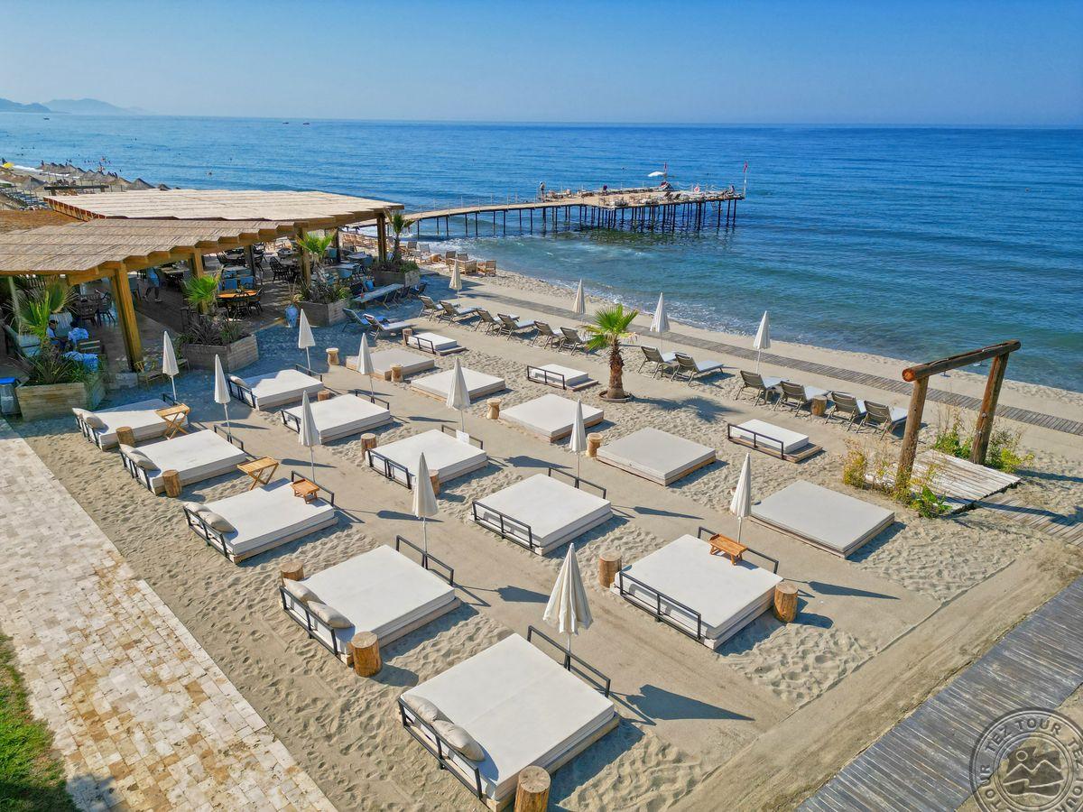 в 129 км от аэропорта г. Анталья, в 38 км от аэропорта Алании, в 6 км от центра г. Аланья, на берегу моря.