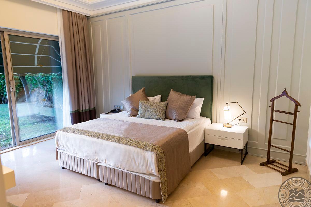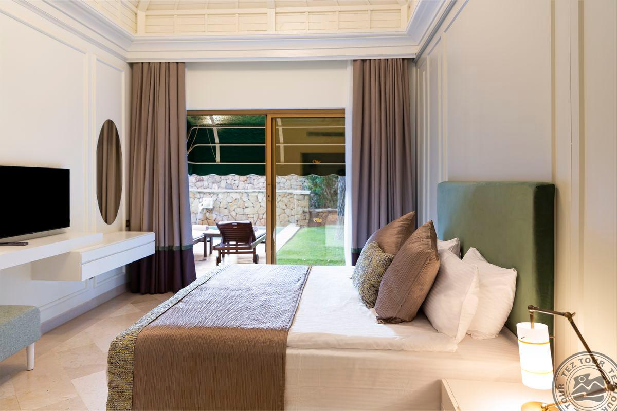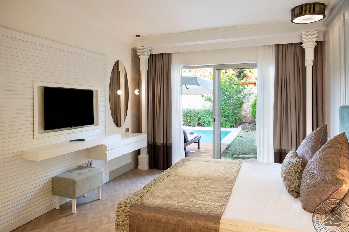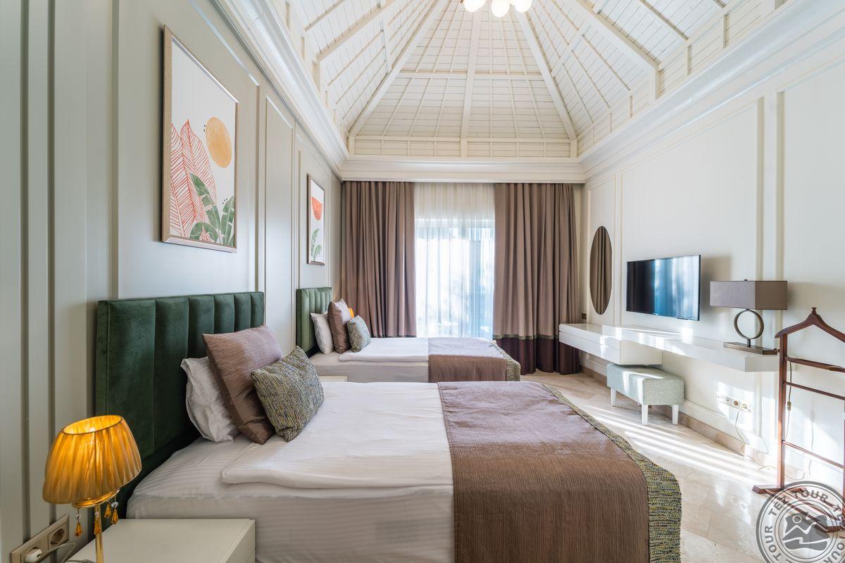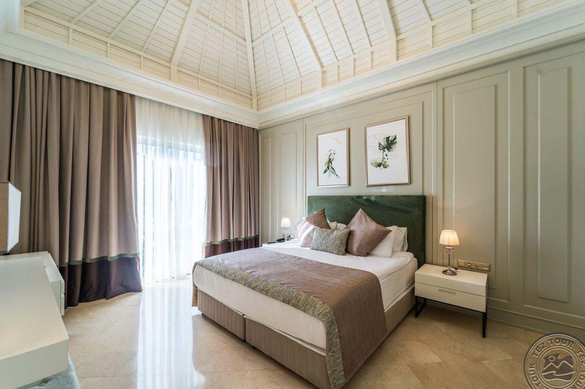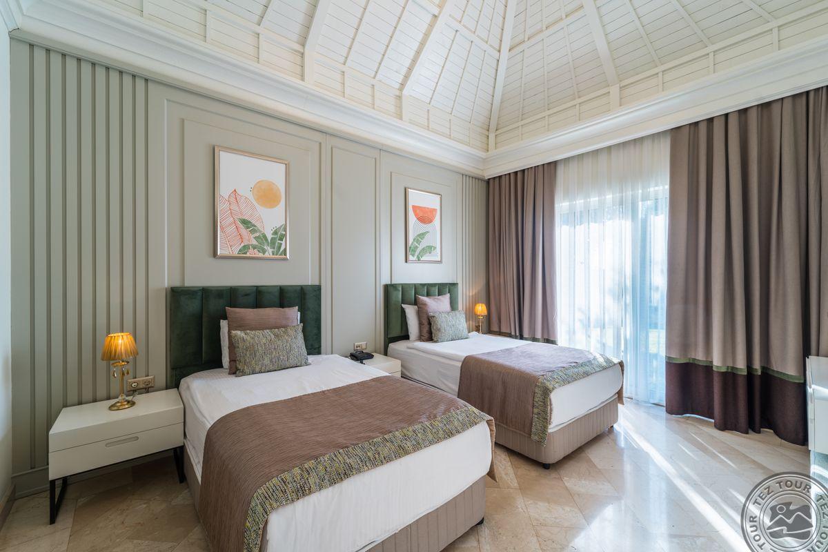 4 четырехкомнатных Superior Deluxe Villa (гостиная с американской кухней, барная стойка, 3 спальни с дверью, 3 ванные: одна с джакузи, две с душем, с подогреваемым полом, 4 ТВ, терраса, собственный подогреваемый бассейн (38 м2), макс. 6+2 чел., общая площадь 396 м2, жилая площадь 202 м2, отдельная огороженная территория, турецкая баня, массажный стол, мебель, VIP-сервис).