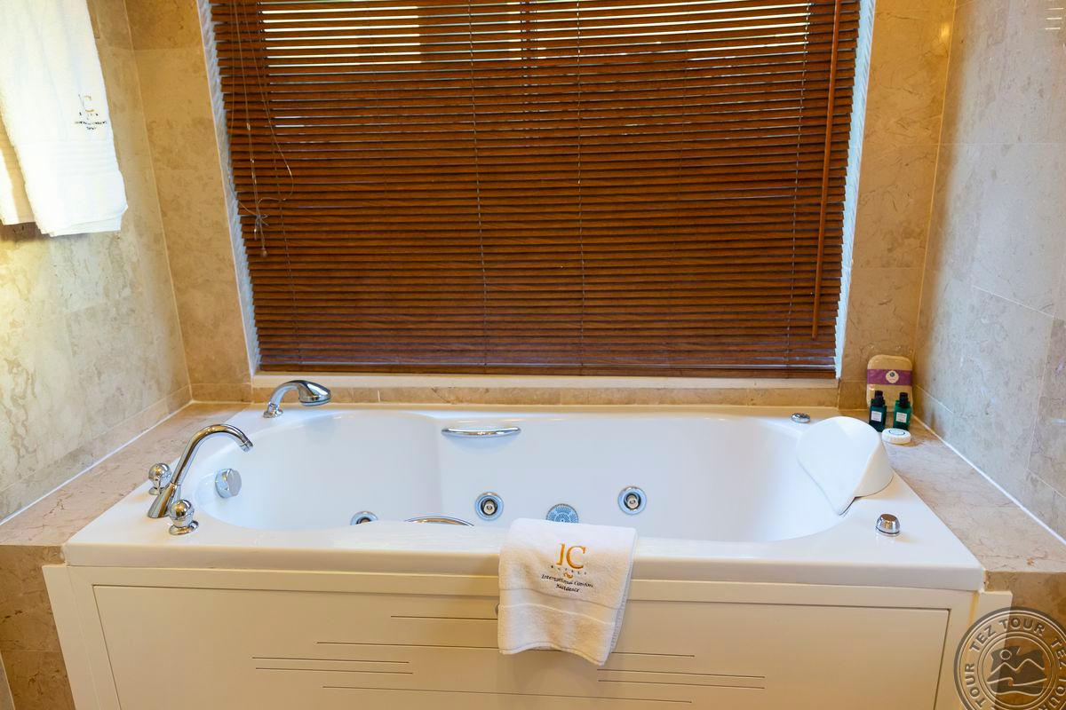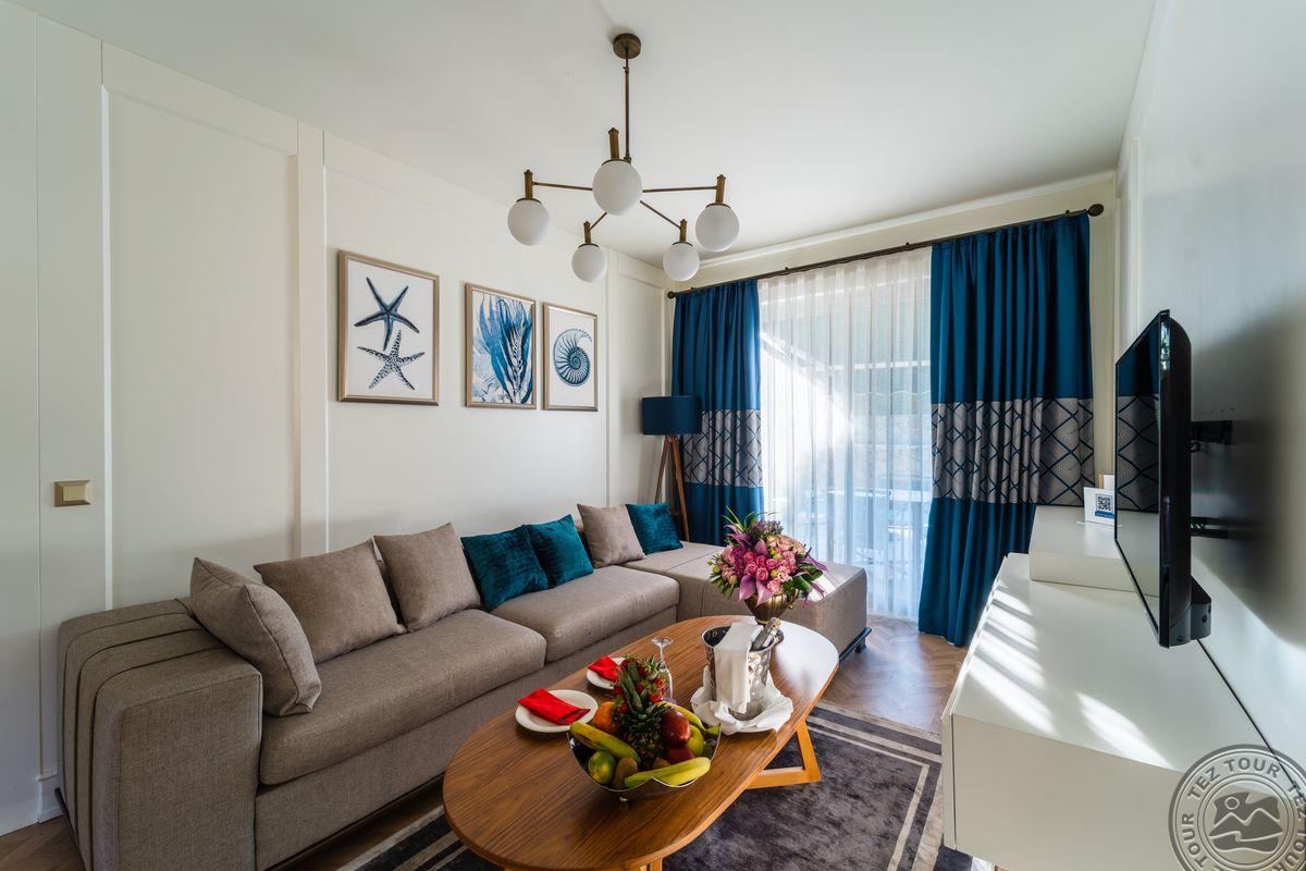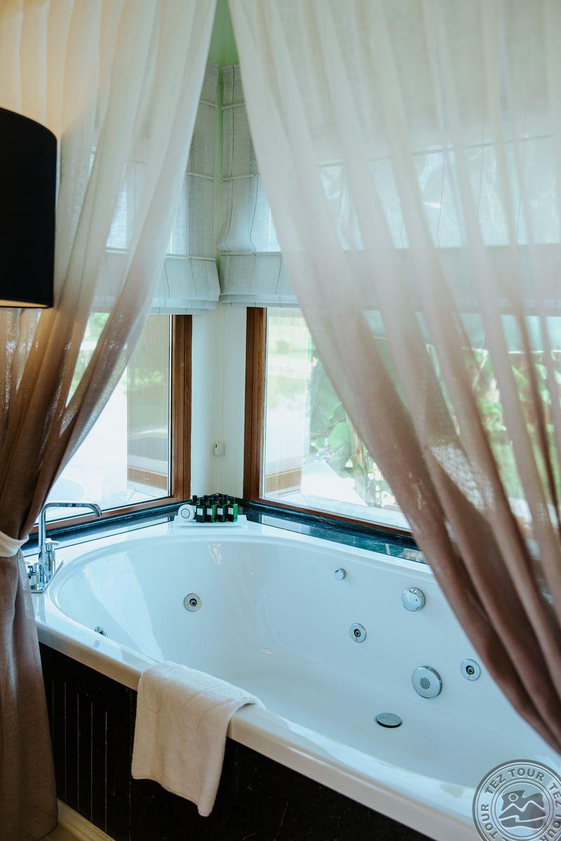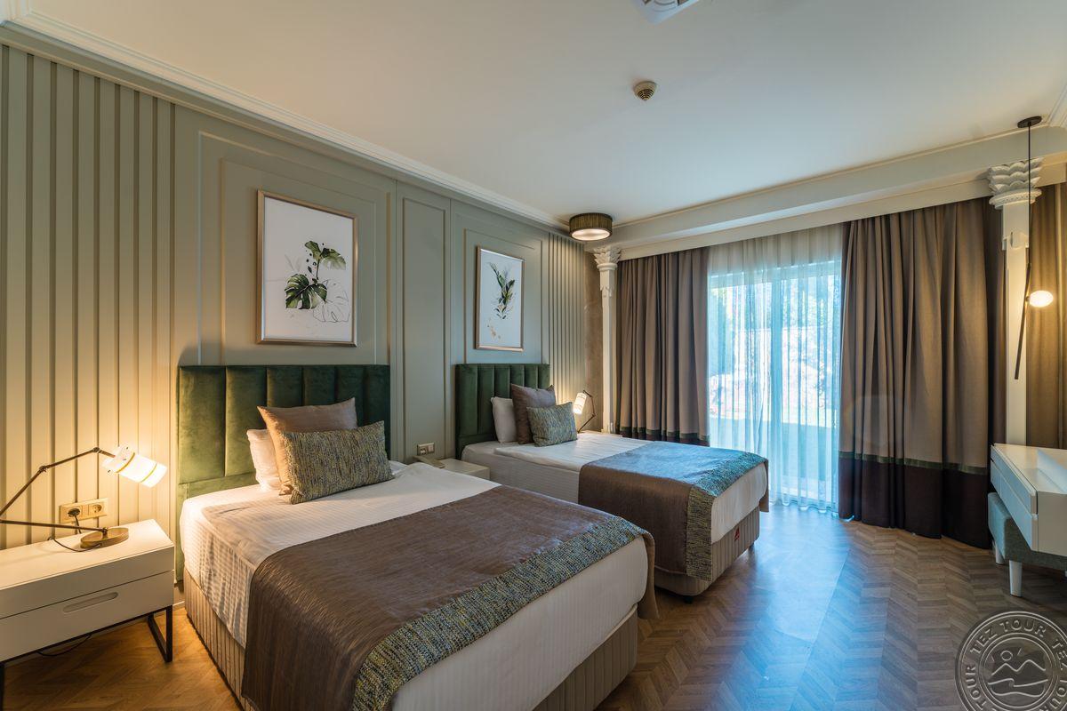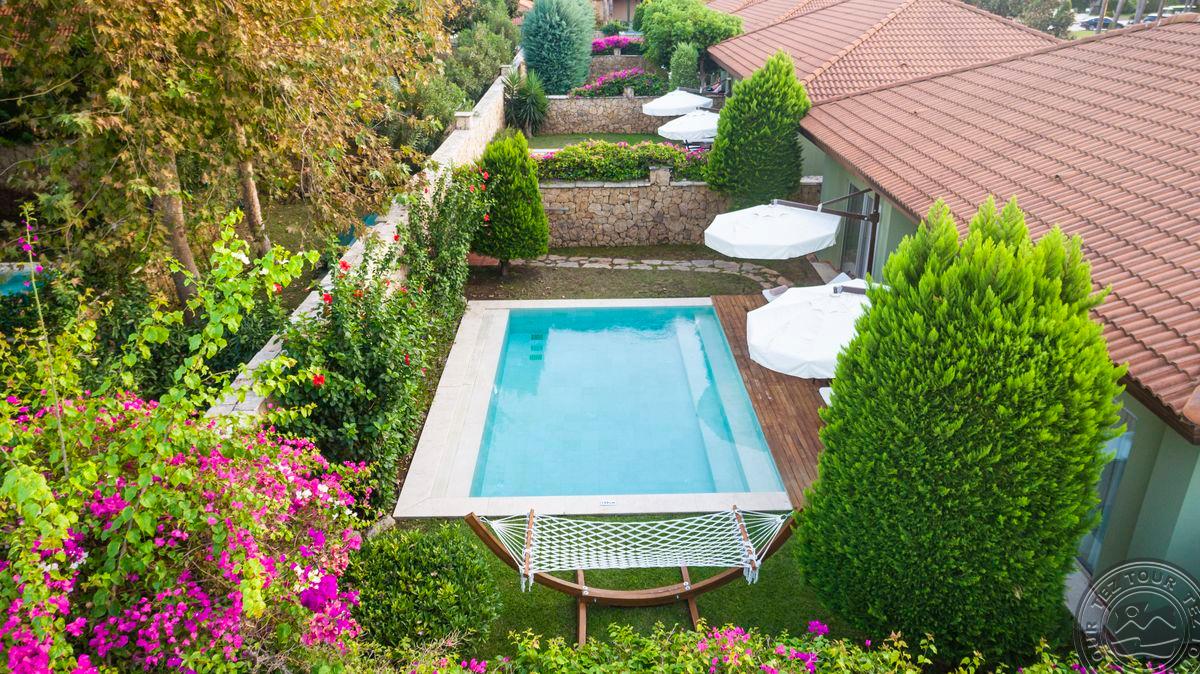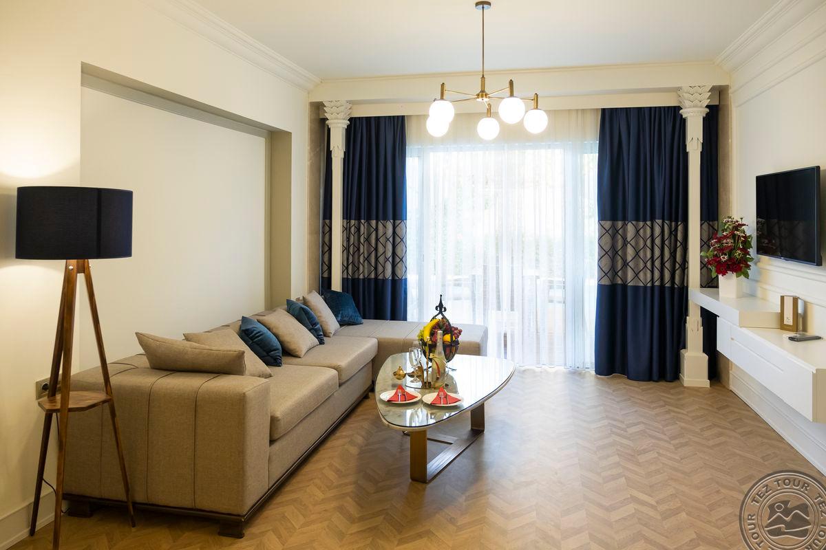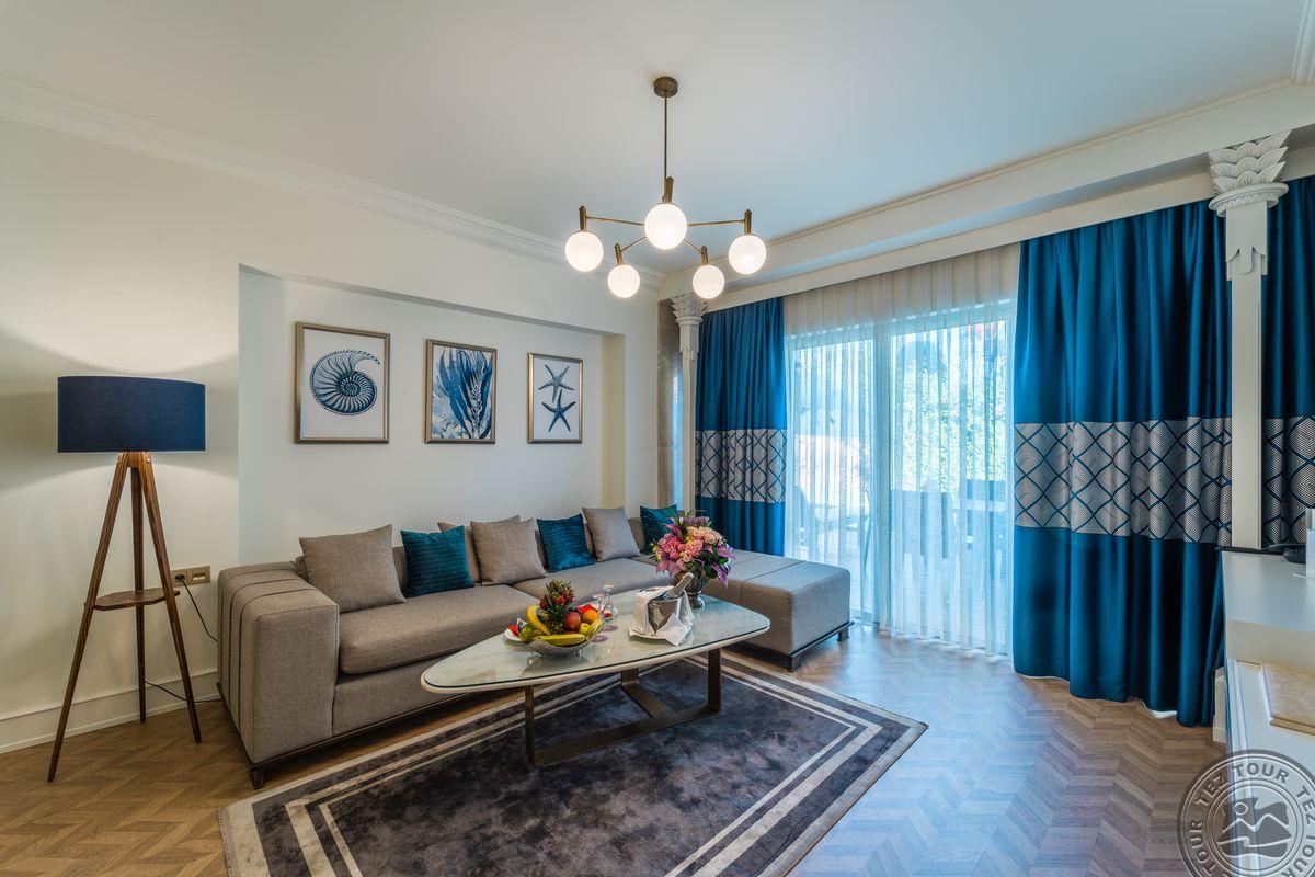 4 четырехкомнатных Superior Deluxe Villa (гостиная с американской кухней, барная стойка, 3 спальни с дверью, 3 ванные: одна с джакузи, две с душем, с подогреваемым полом, 4 ТВ, терраса, собственный подогреваемый бассейн (38 м2), макс. 6+2 чел., общая площадь 396 м2, жилая площадь 202 м2, отдельная огороженная территория, турецкая баня, массажный стол, мебель, VIP-сервис).