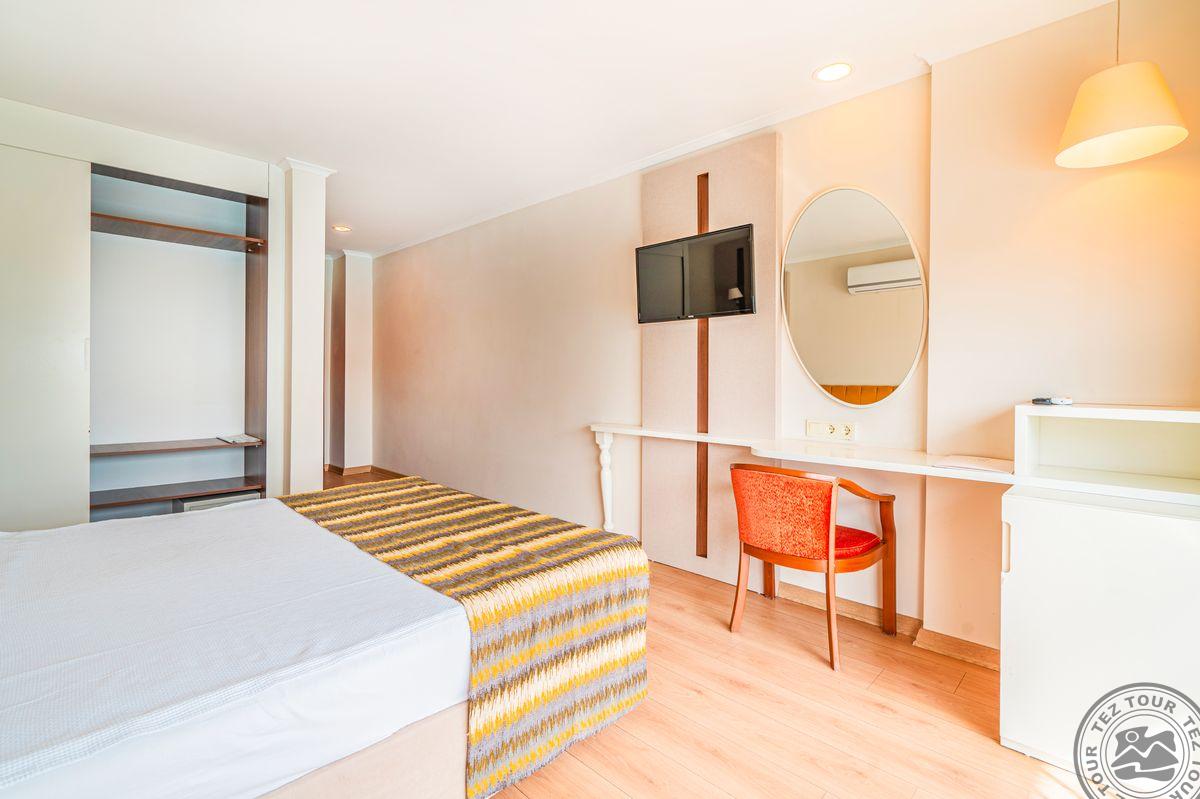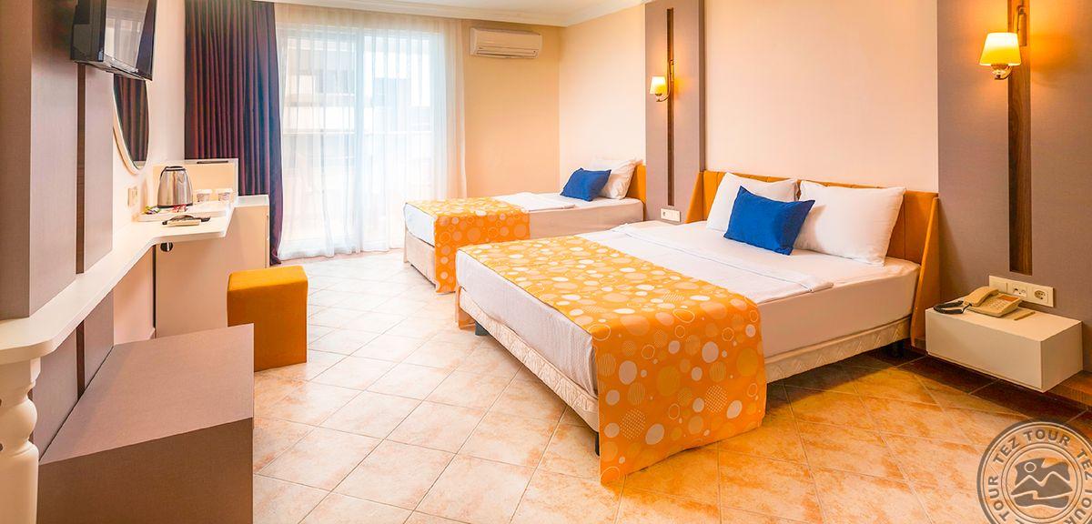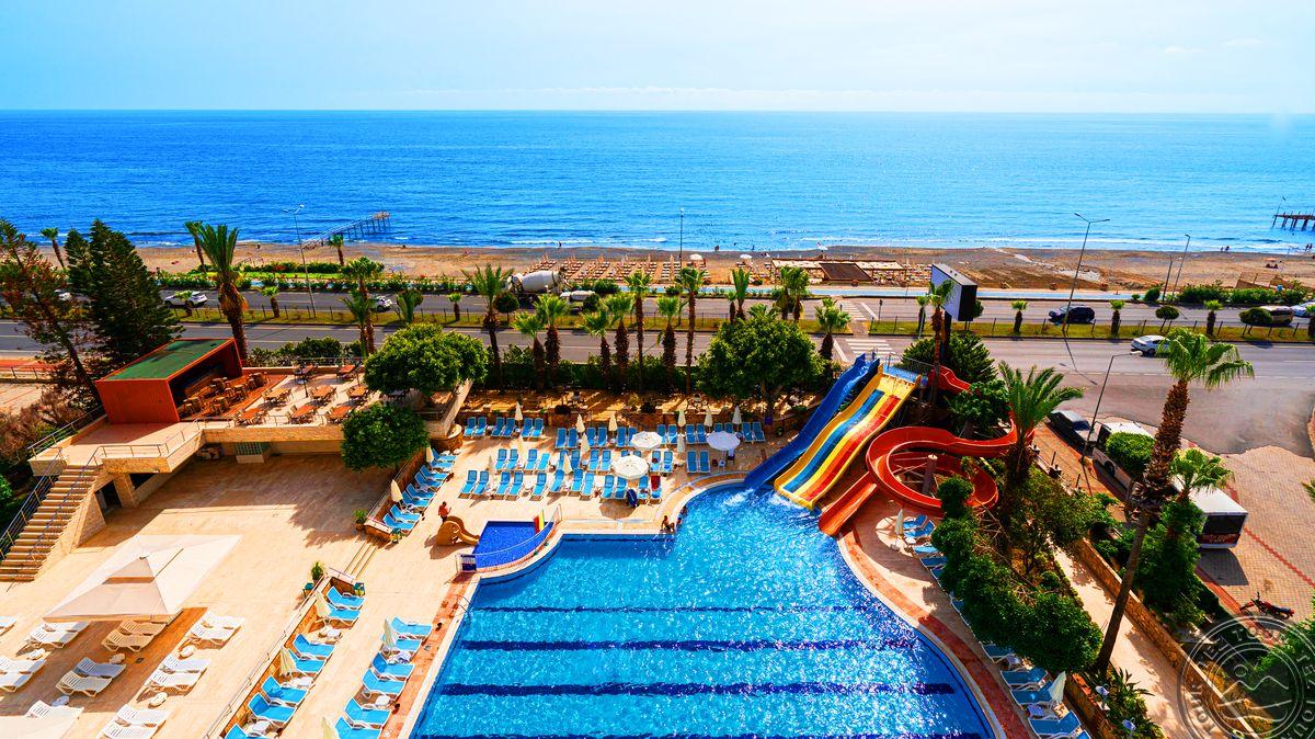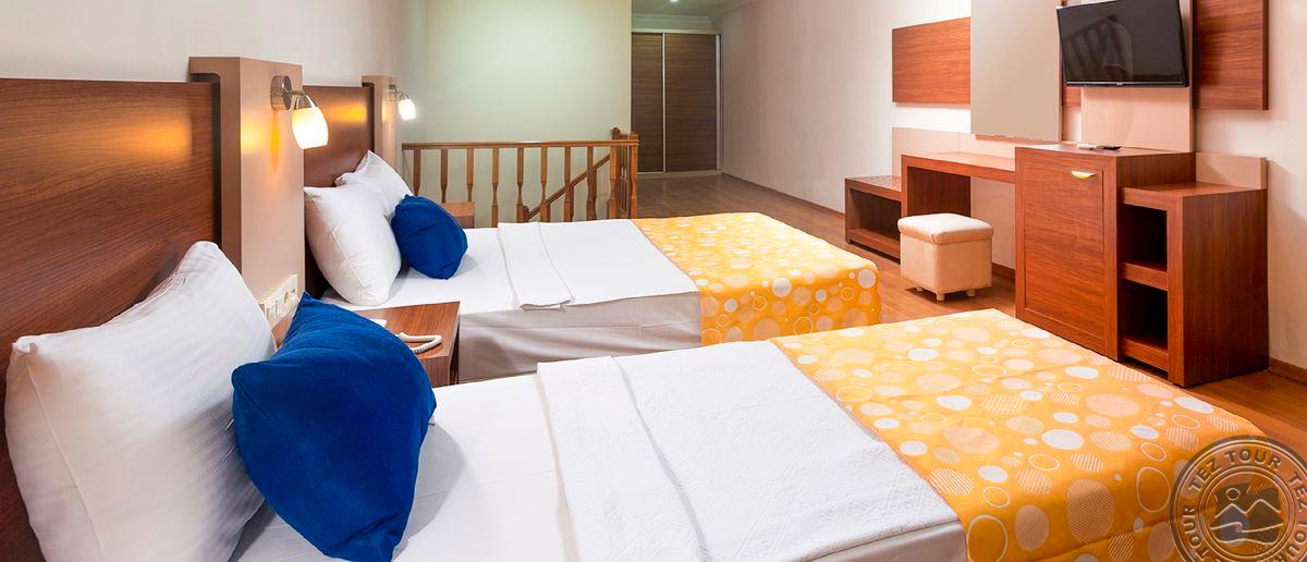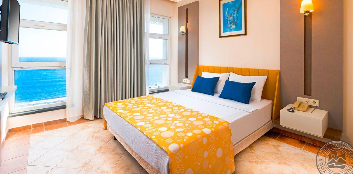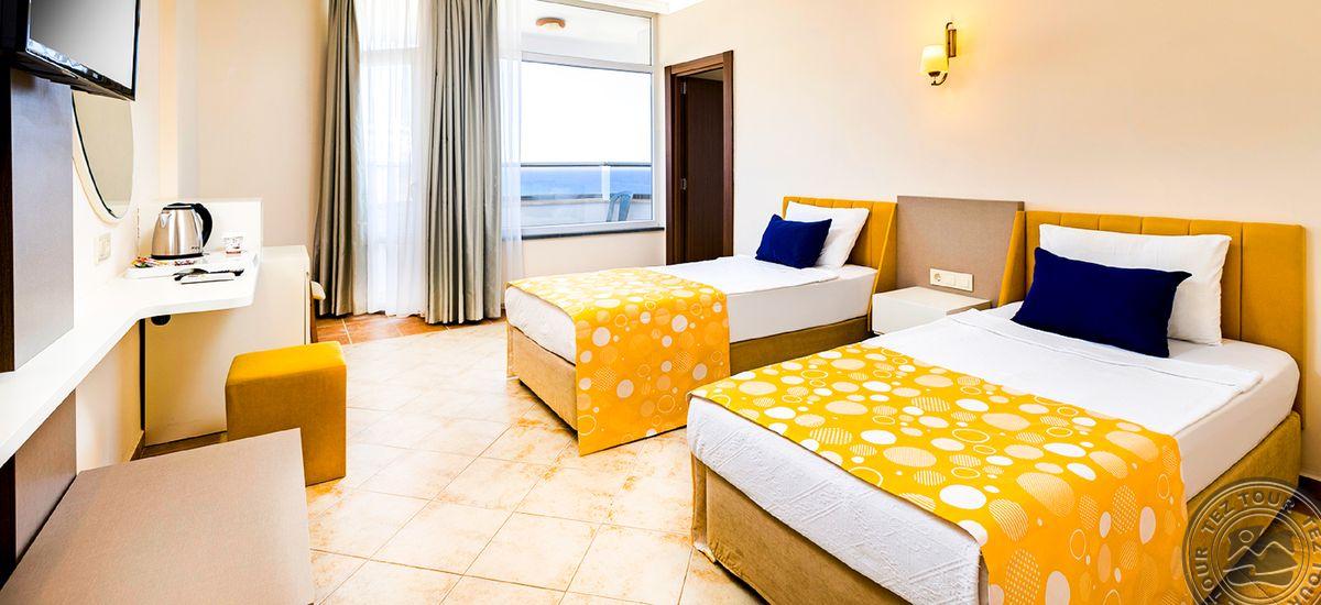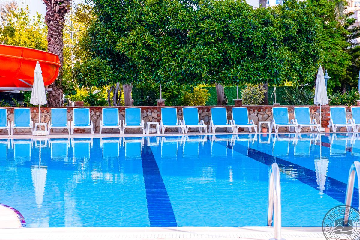 в 135 км от аэропорта г. Анталья, в 140 км от центра г. Анталья, в 12 км от Алании, в 50 м от пляжа (через подземный переход).