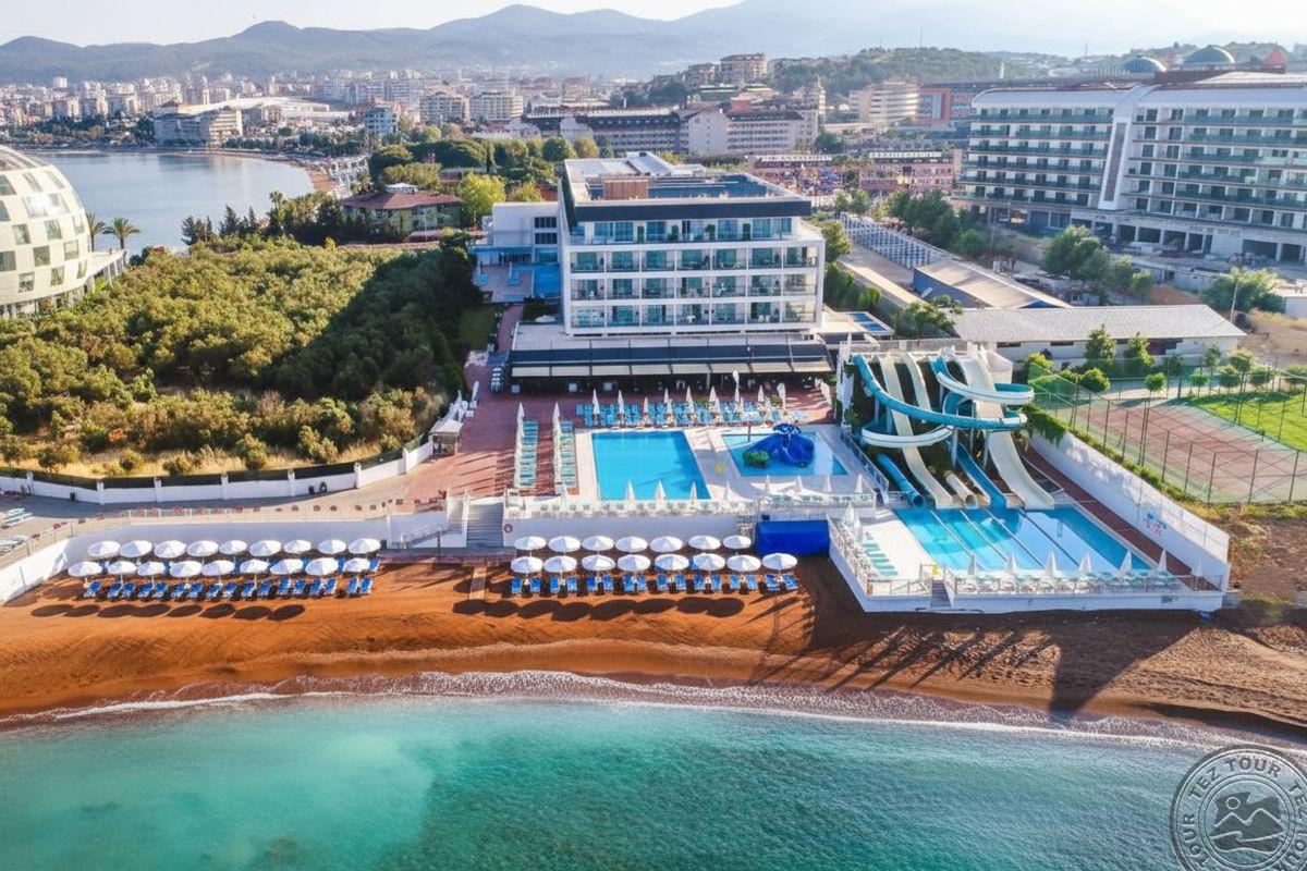 в 98 км от аэропорта г. Анталья, в 65 км от аэропорта Газипаша, в 22 км от центра г. Аланья, на берегу моря.
