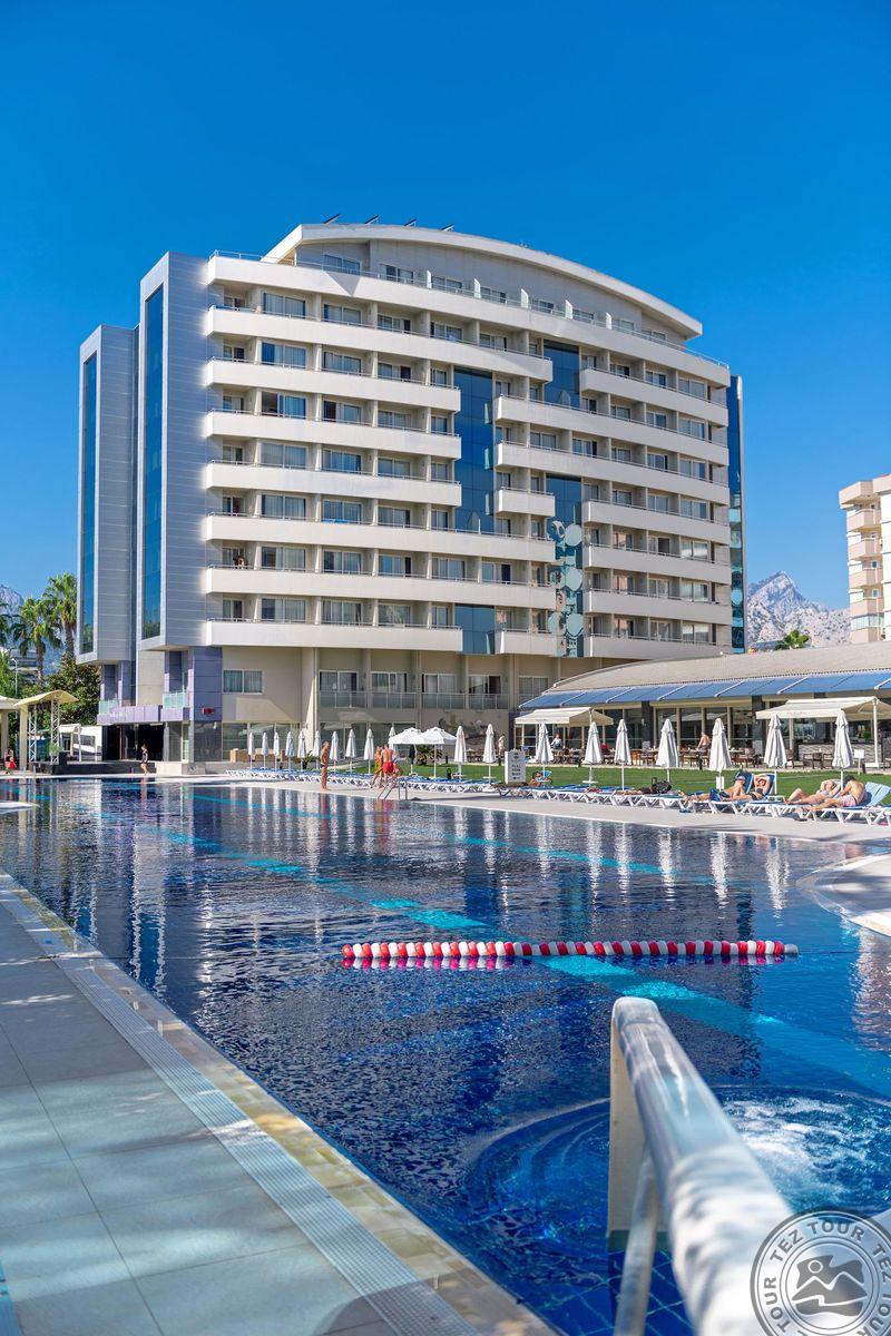 Городской отель с хорошим уровнем обслуживания. Расположен через оживленную дорогу от пляжа, которую можно перейти по подземному переходу. Красивый вид на ночную Анталью и Таврские горы открывается с верхних этажей отеля. От отеля легко добраться на городском транспорте до торговых центров, Аквариума, канатной дороги и Старого города.