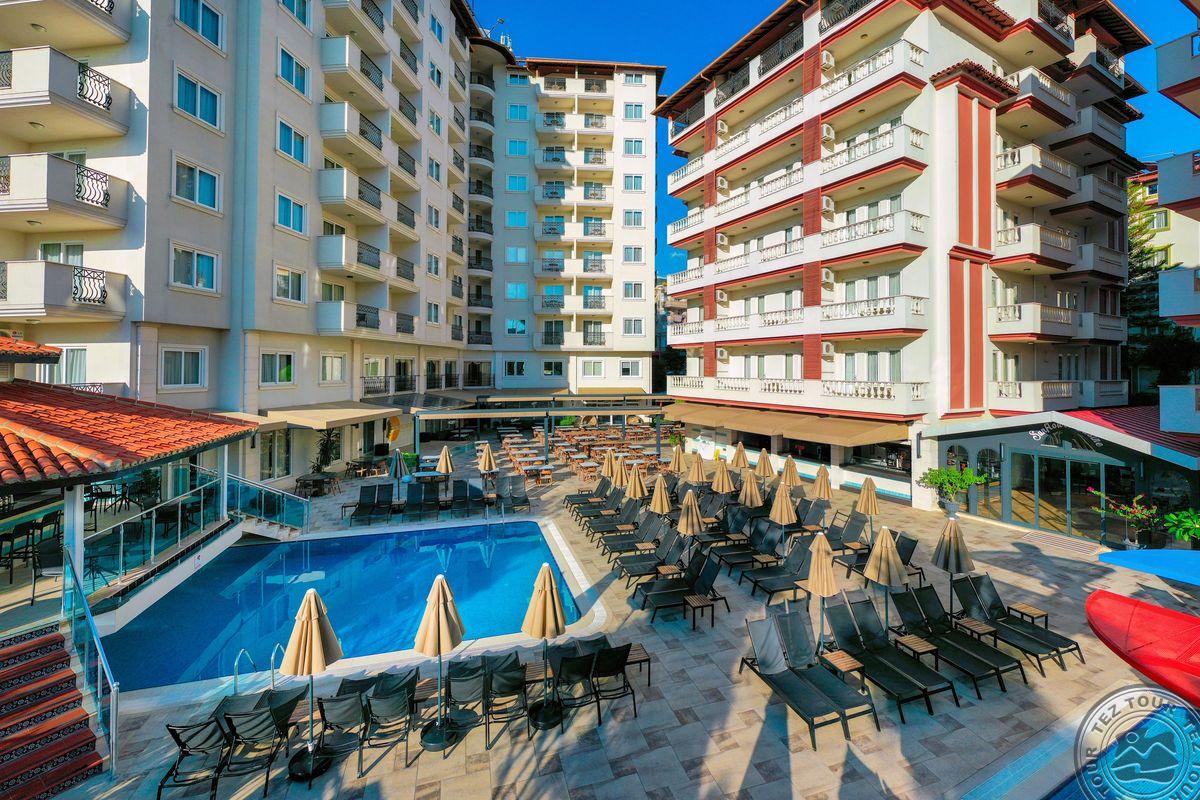 в 130 км от аэропорта г. Анталья, в 500 м от центра г. Аланья, в 1.2 км от городского пляжа.
