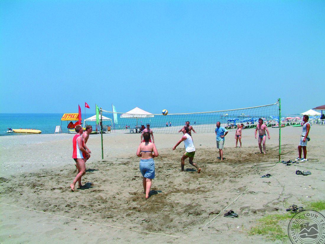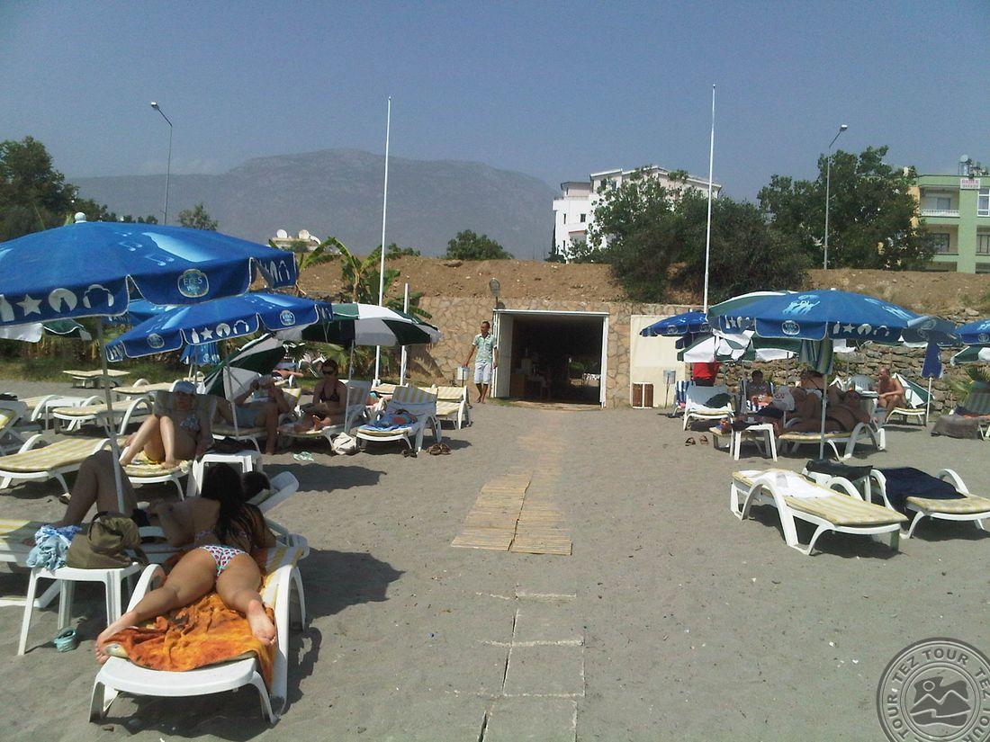 в 139 км от аэропорта г.Анталии, в 9 км от г. Алания, в поселке Махмутлар, на берегу моря (есть подземный переход).