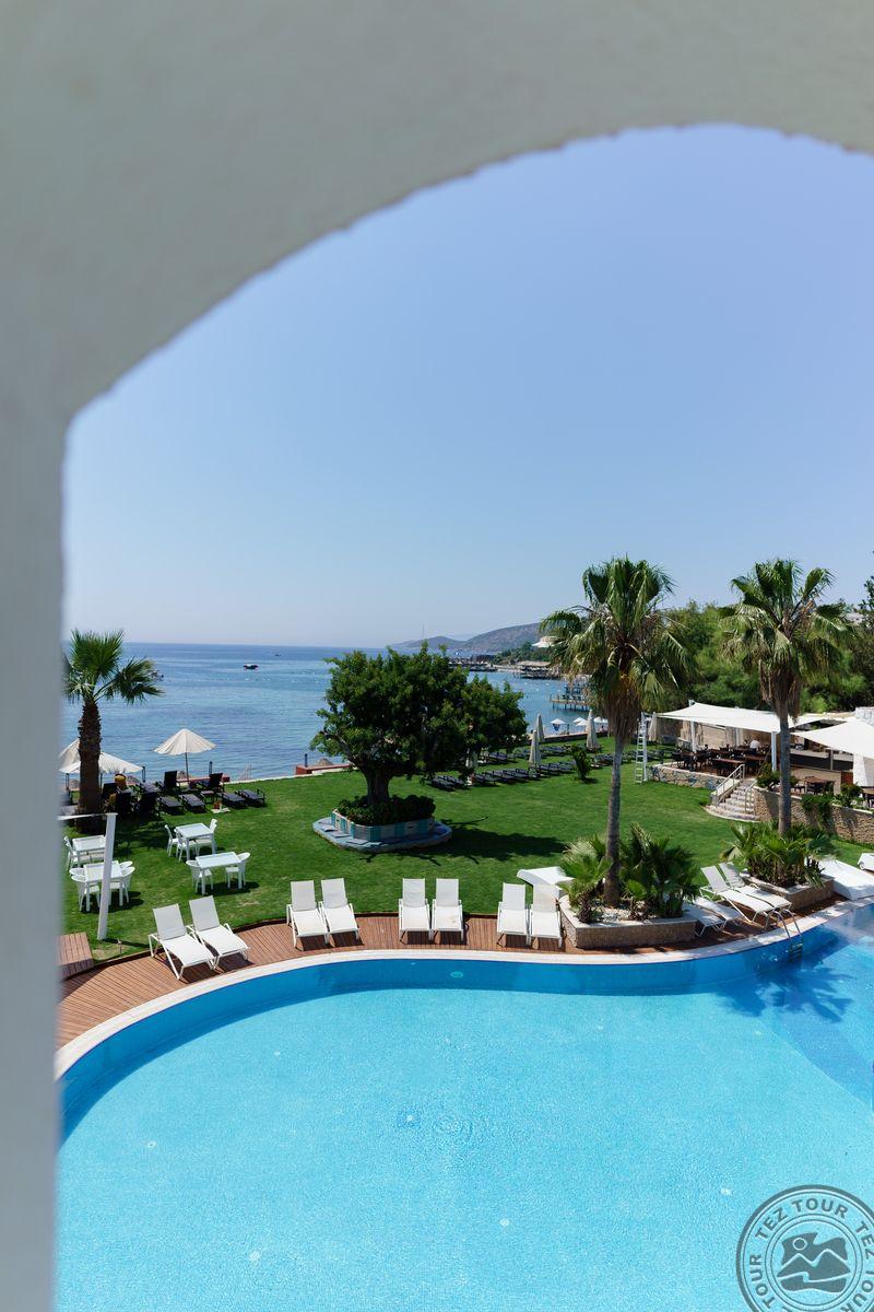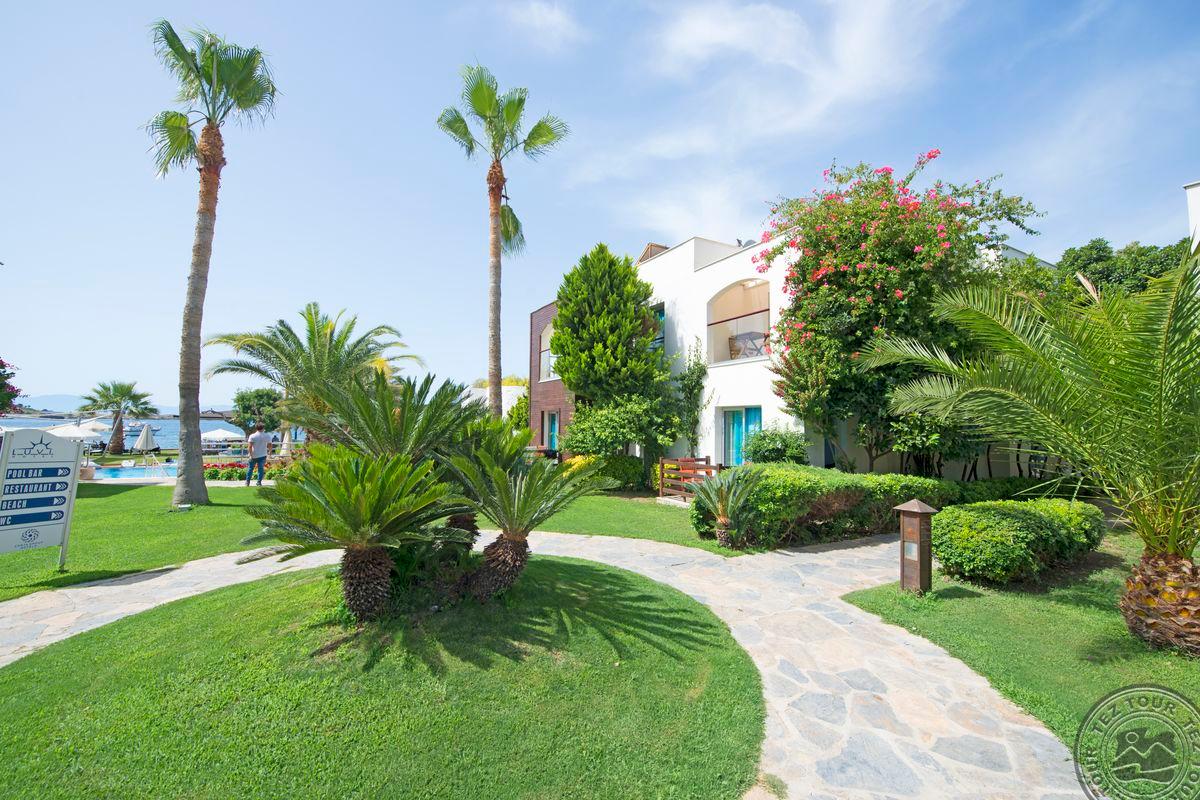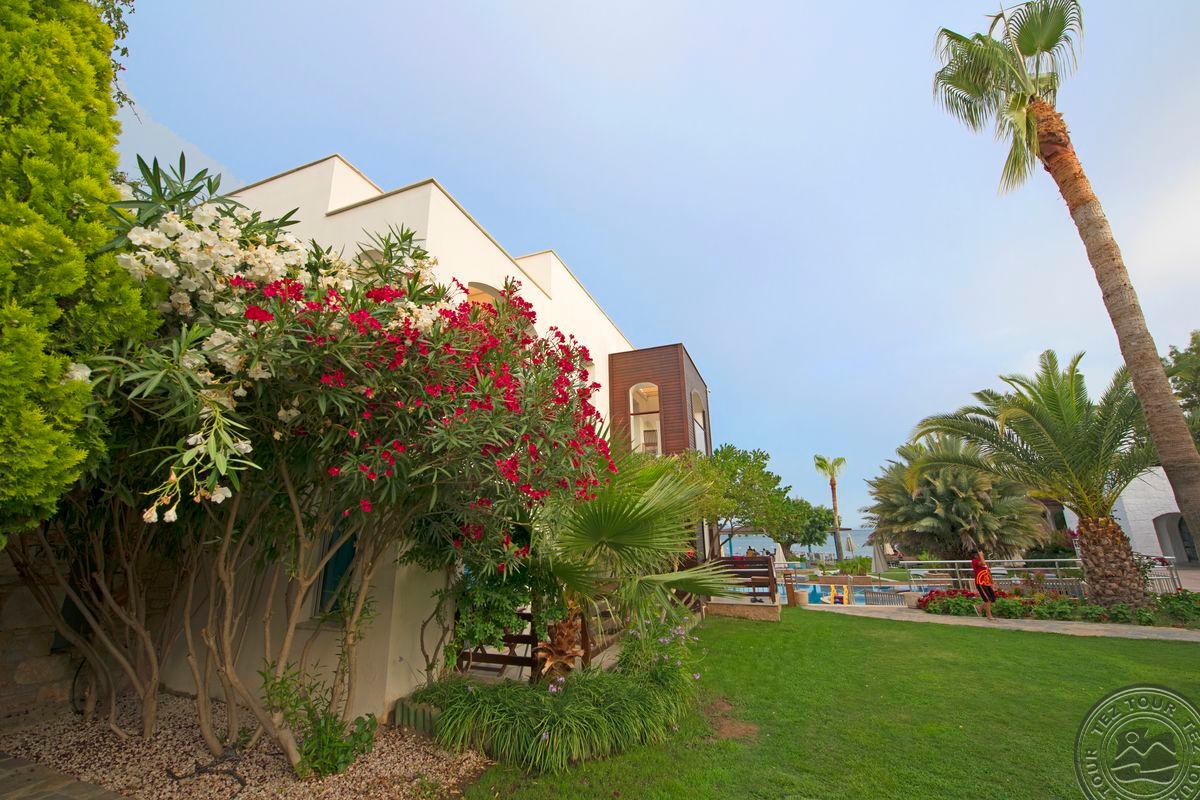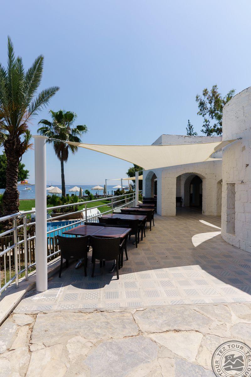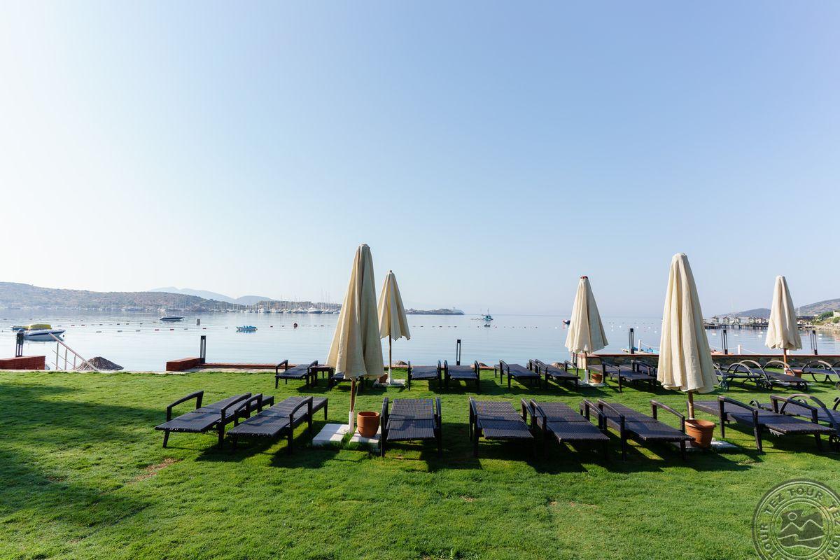 в местечке Гюмбет, в 3 км от Бодрума, в 35 км от аэропорта Бодрума, на берегу моря.
