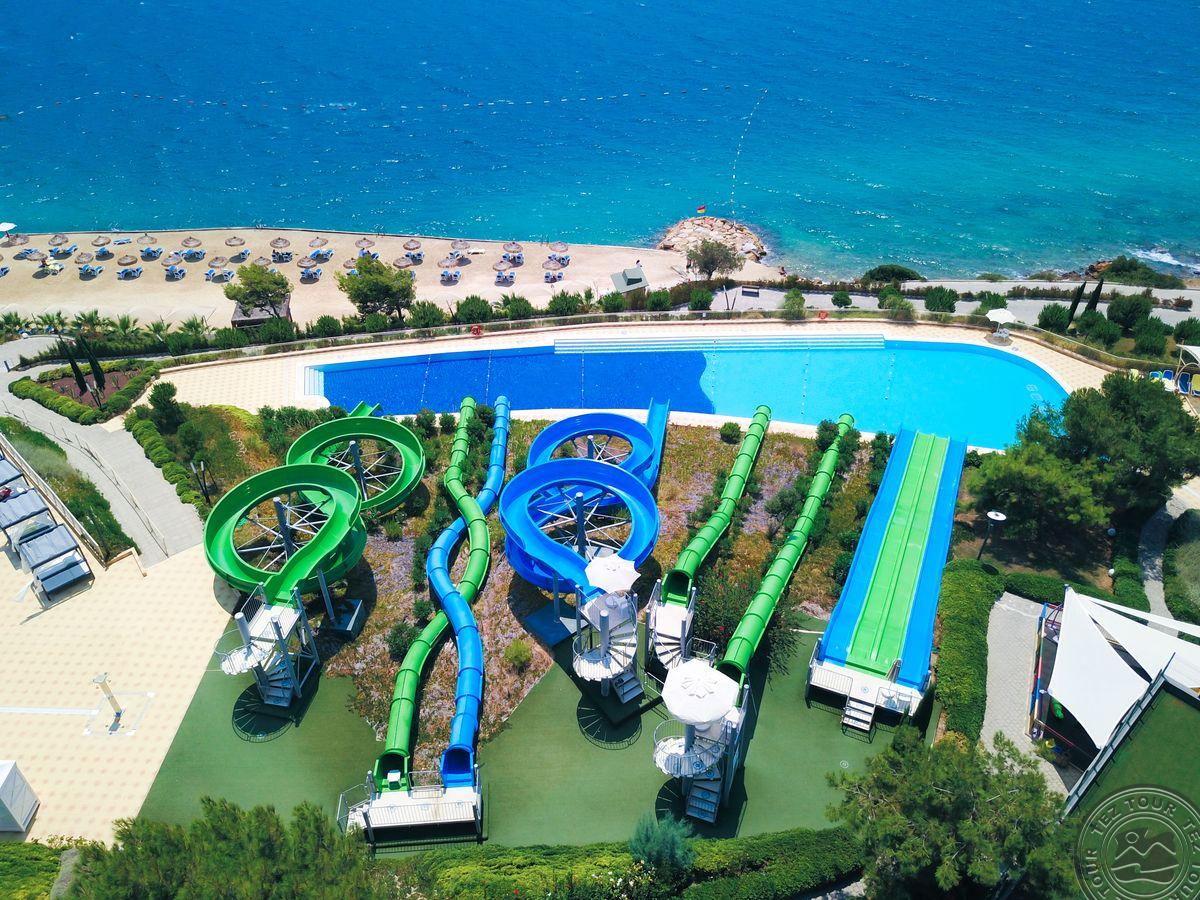 в 15 км от аэропорта Миласа Бодрума, в 200 км от аэропорта Измира, в 183 км от аэропорта Даламана, в 26 км от центра Бодрума и в 3 км от поселка Гюверджинлик, на берегу моря. Автобусная остановка перед отелем.