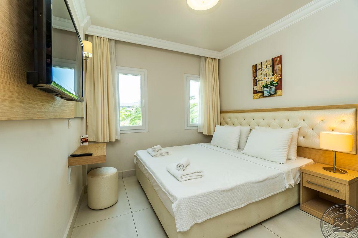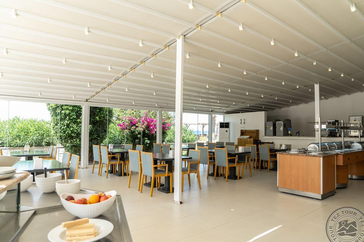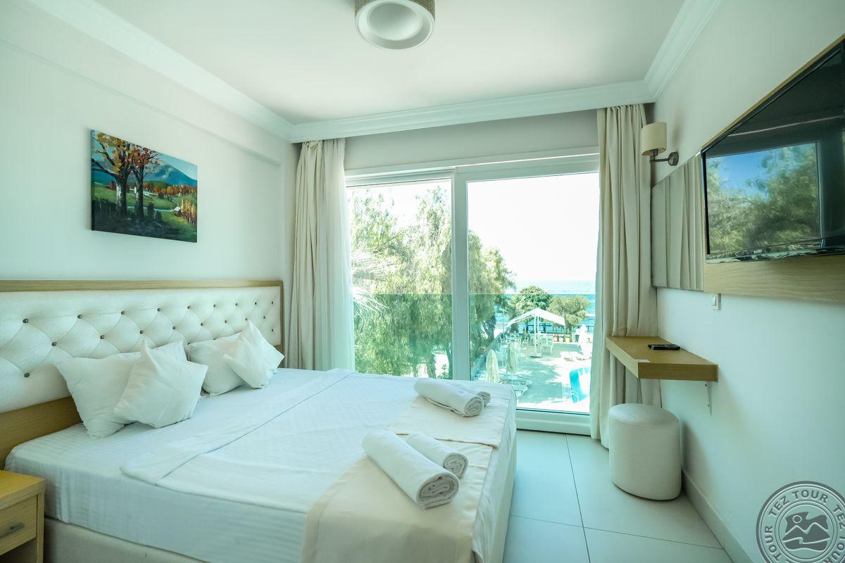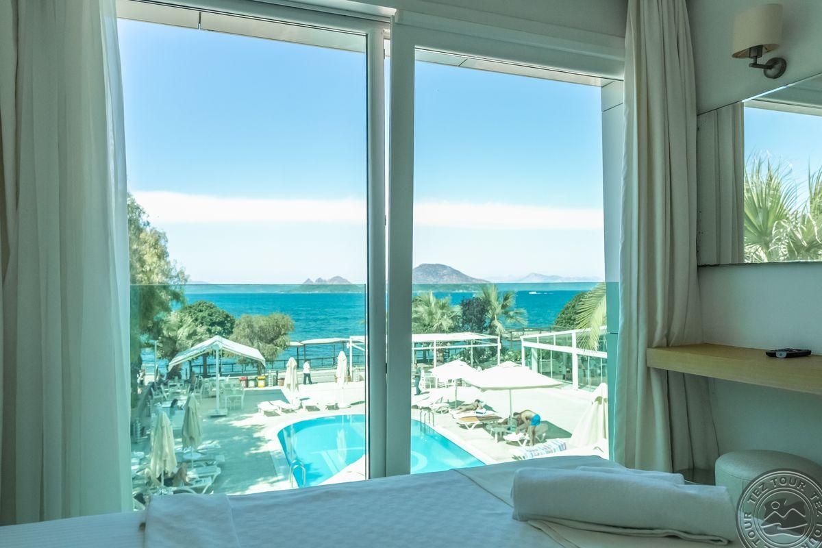 в 55 км от аэропорта Бодрума и в 20 км от центра Бодрума, в 1 км от центра Тургутрейса, на берегу моря.