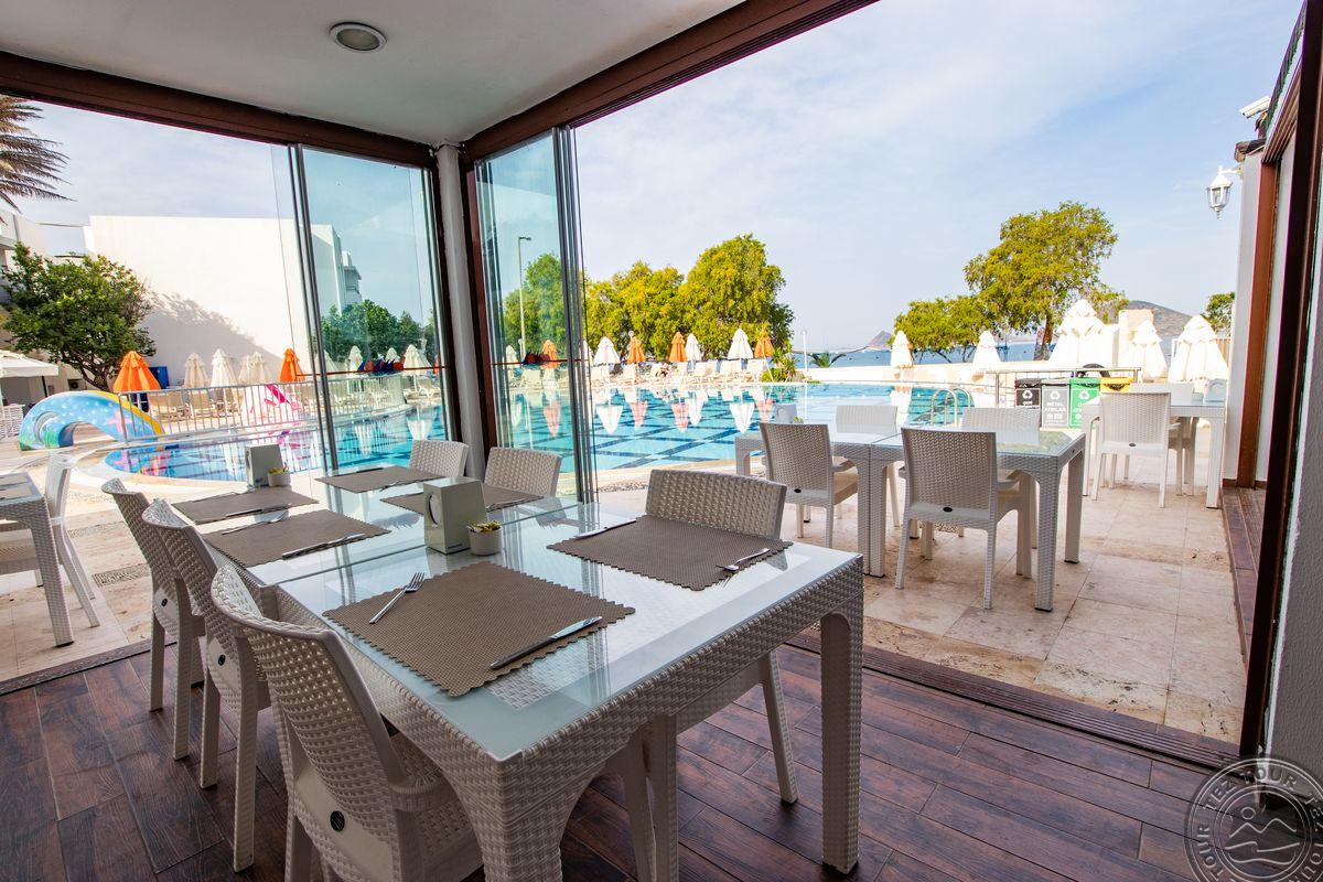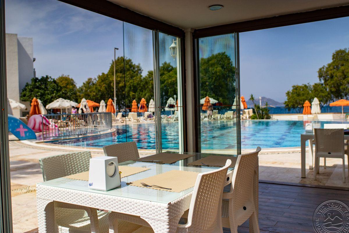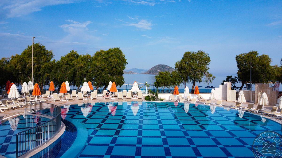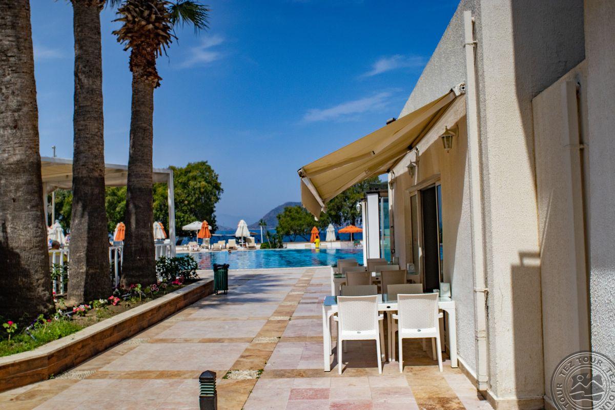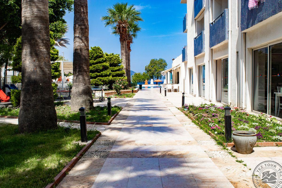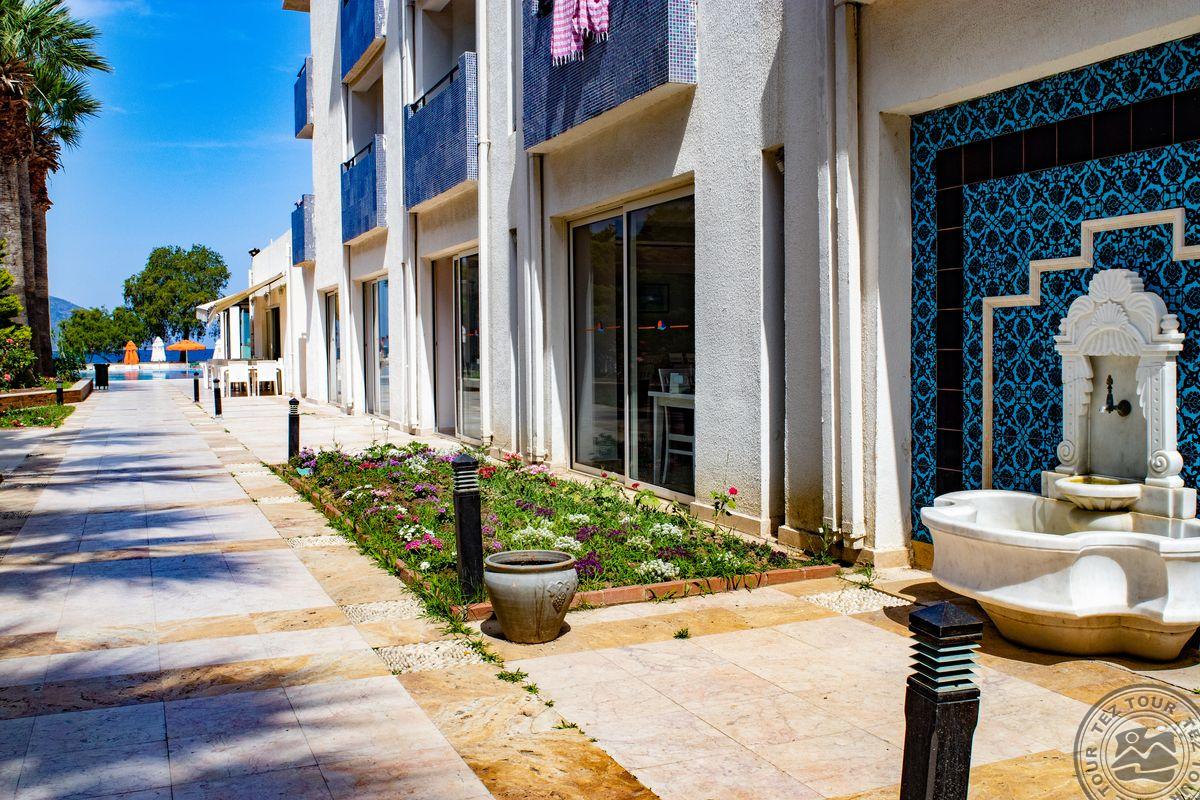 в поселке Тургутрейс, в 53 км от аэропорта Бодрума, в 18 км от Бодрума, на берегу моря.