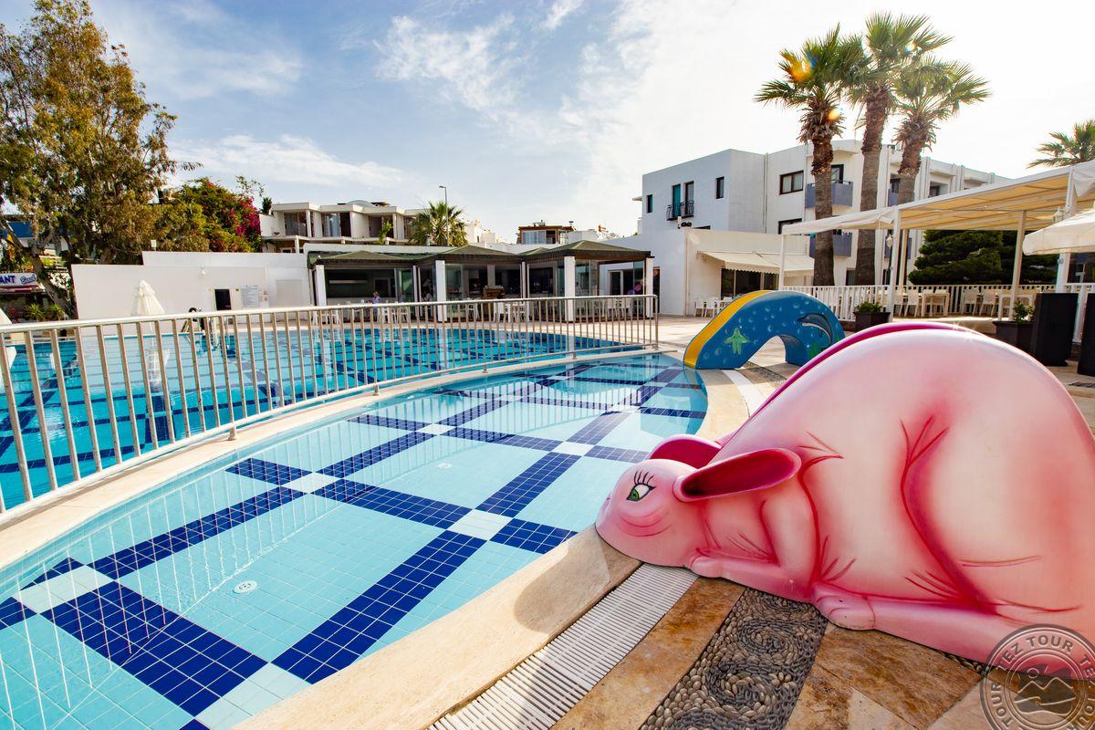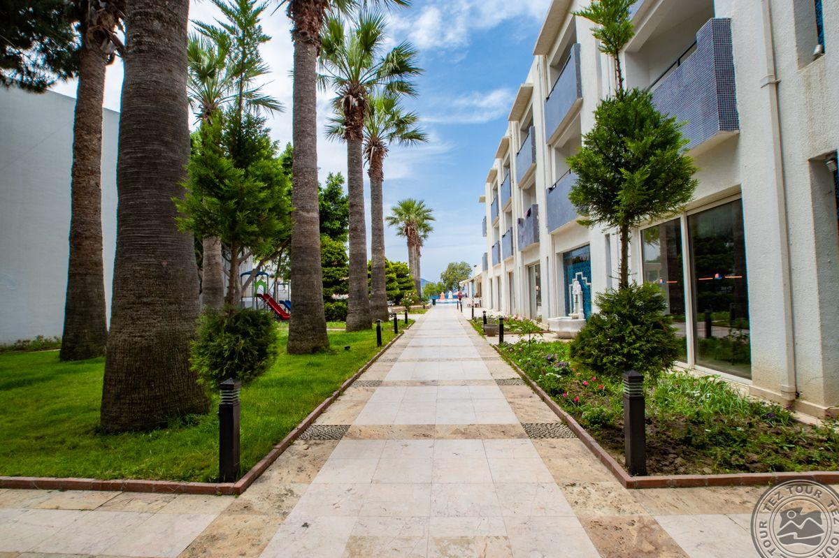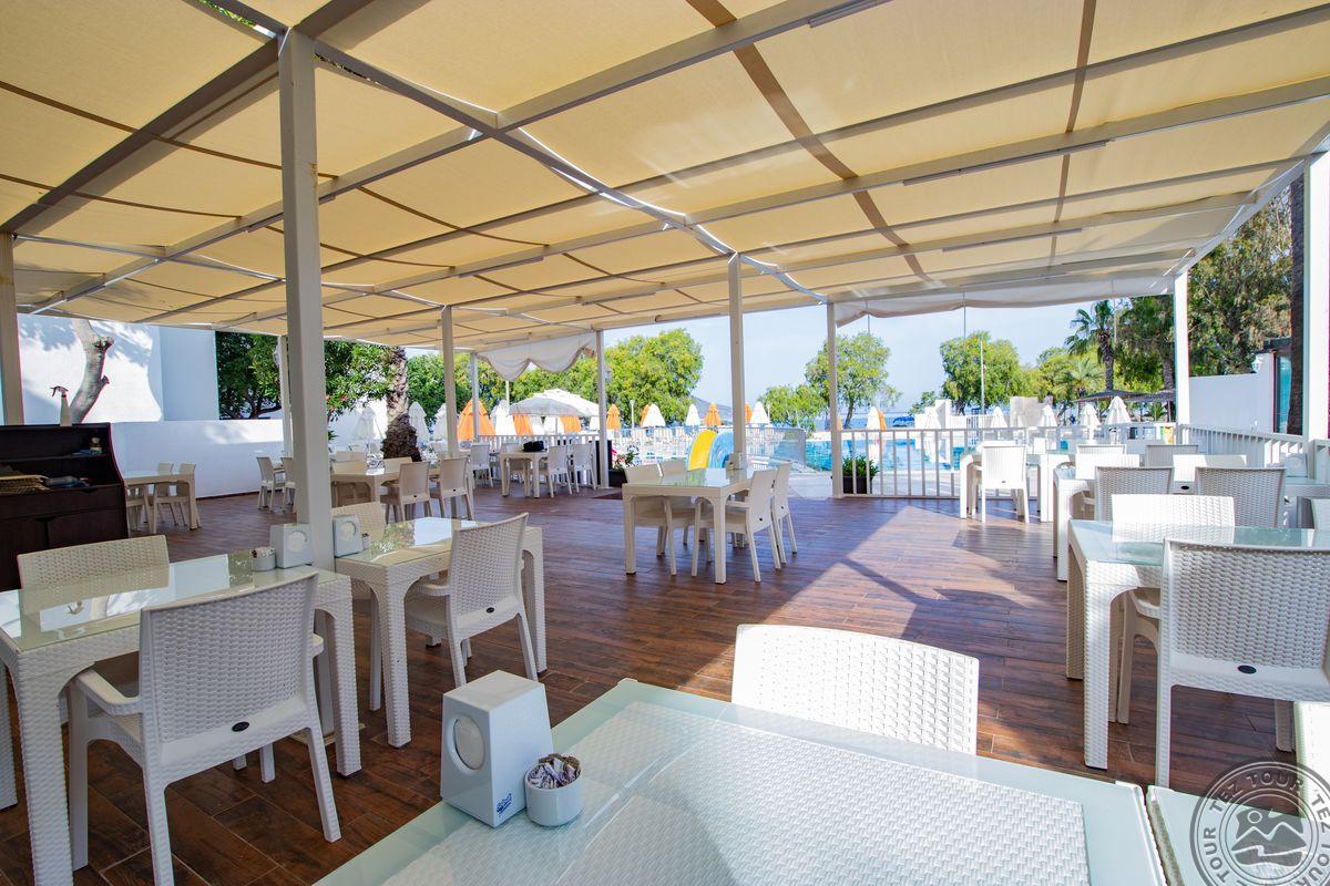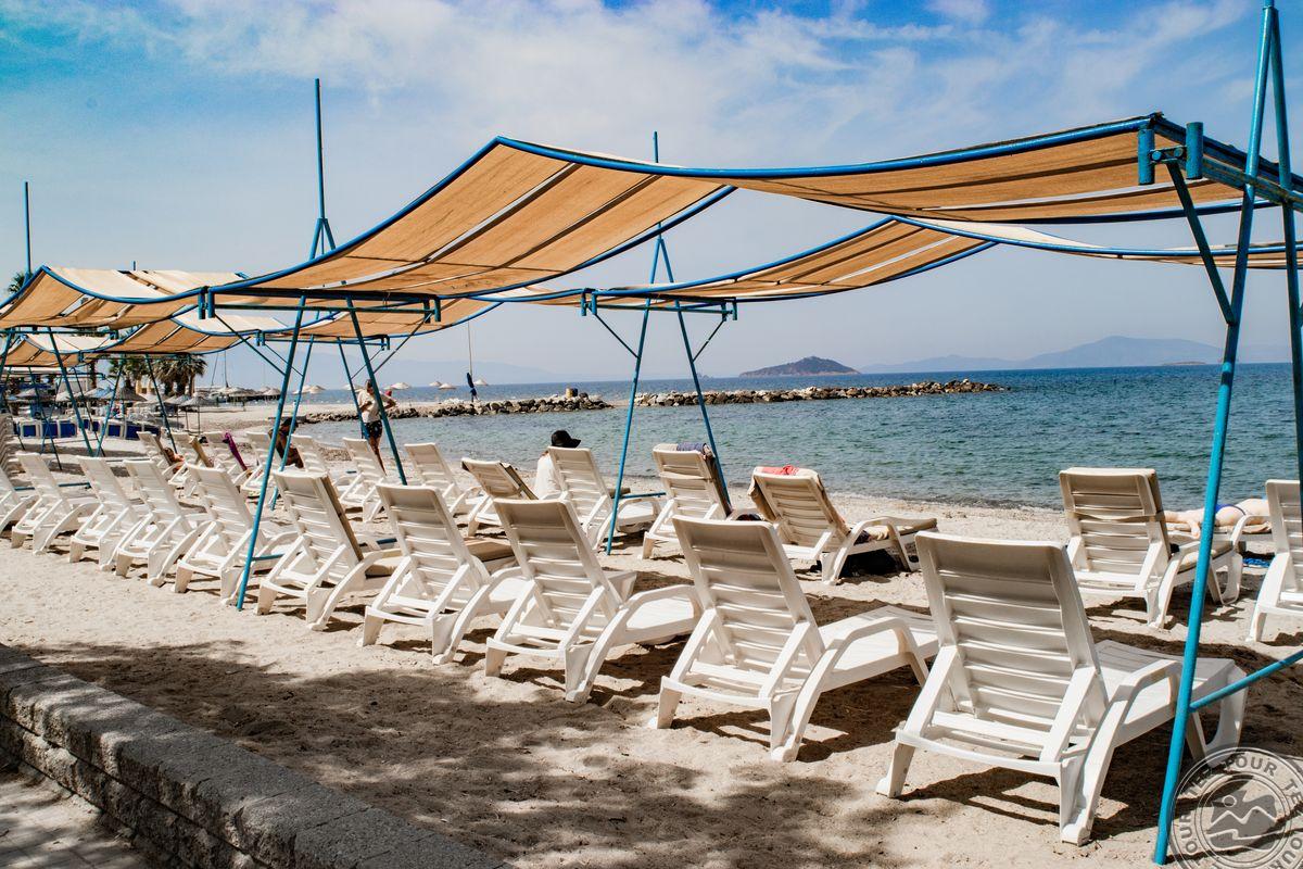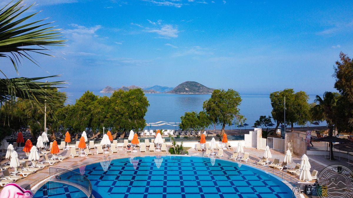 в поселке Тургутрейс, в 53 км от аэропорта Бодрума, в 18 км от Бодрума, на берегу моря.