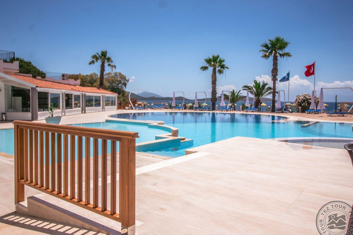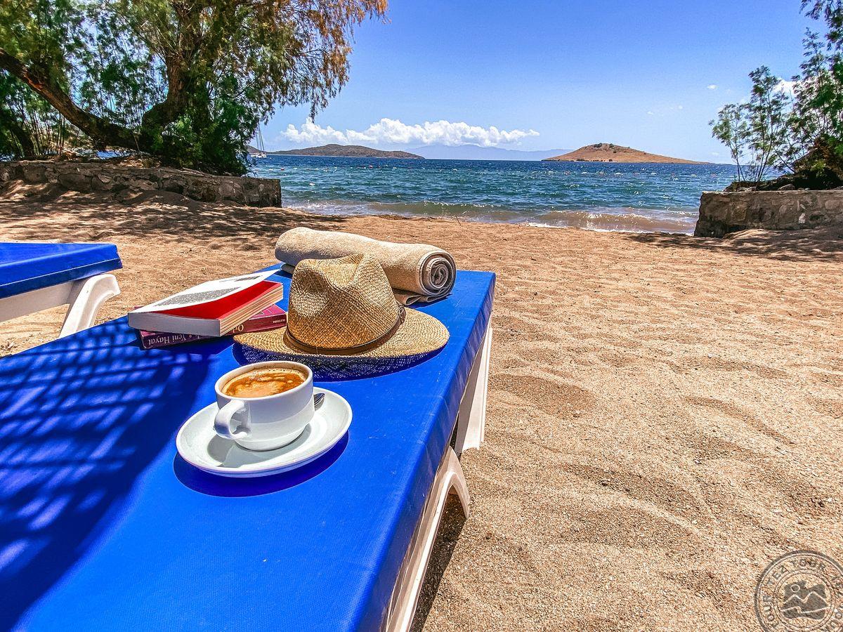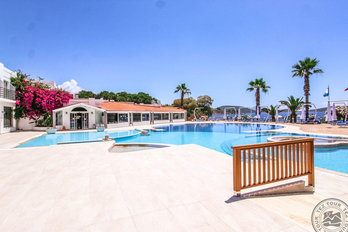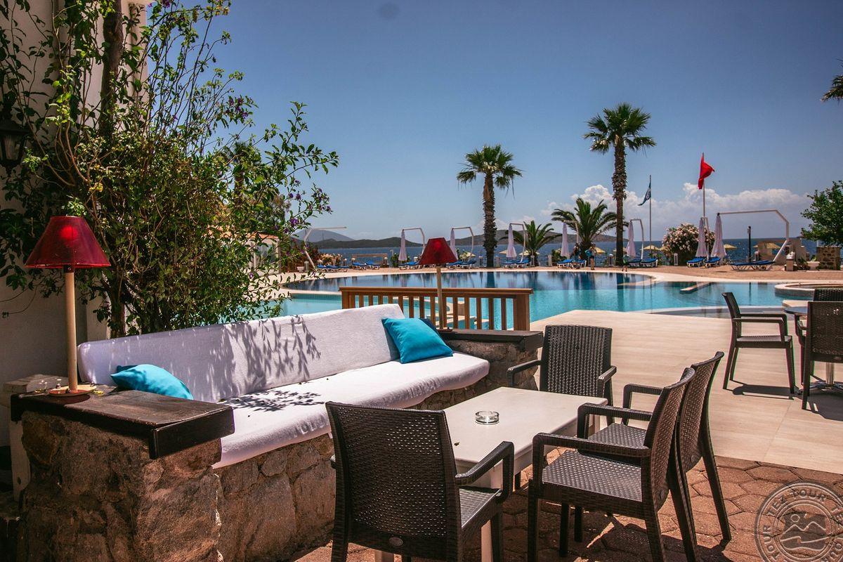 в местечке Ортакент, 10 км от центра Бодрума, в 5 км от магазинов, в 50 км от аэропорта Бодрума, на берегу моря.