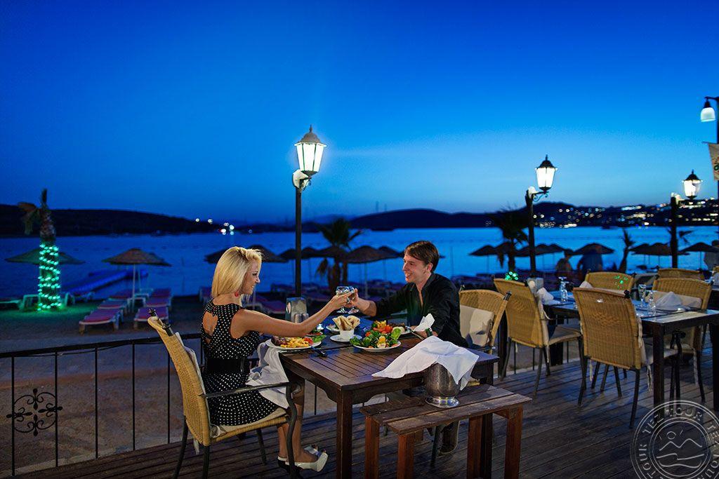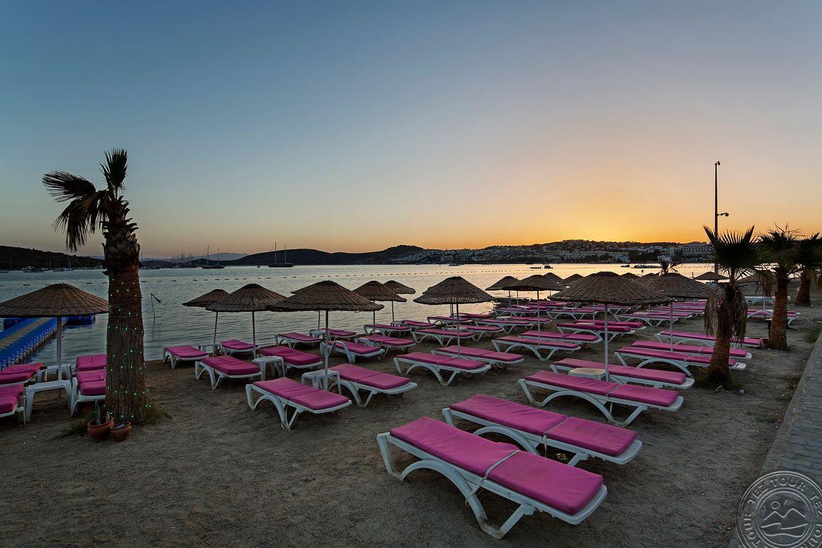 в Гюмбете, в 2 км от центра г. Бодрум, в 40 км от аэропорта Бодрума, на берегу моря.