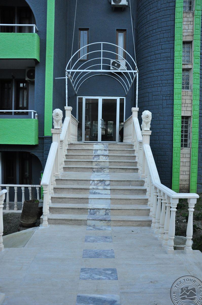 в 35 км. от аэропорта г. Анталья, в 25 км. от г. Кемер, в поселке Бельдиби, в 100 м. от собственного пляжа.