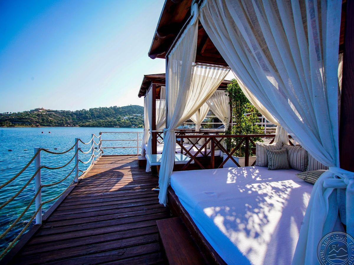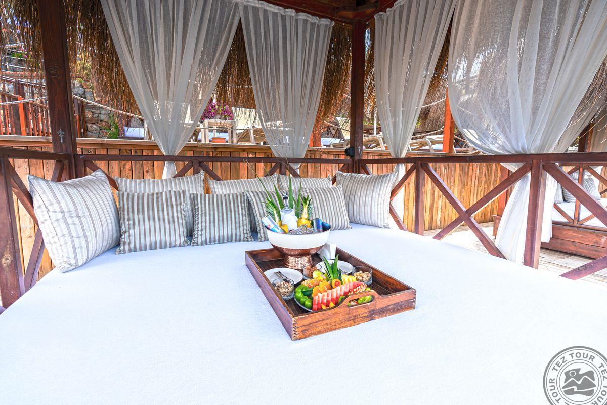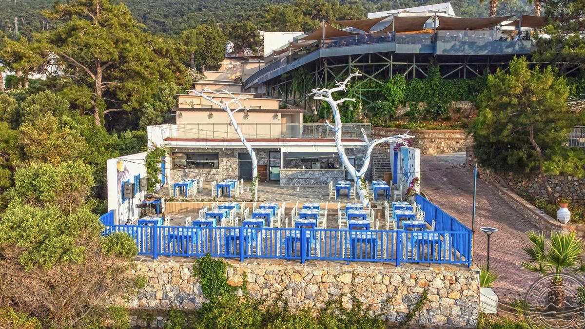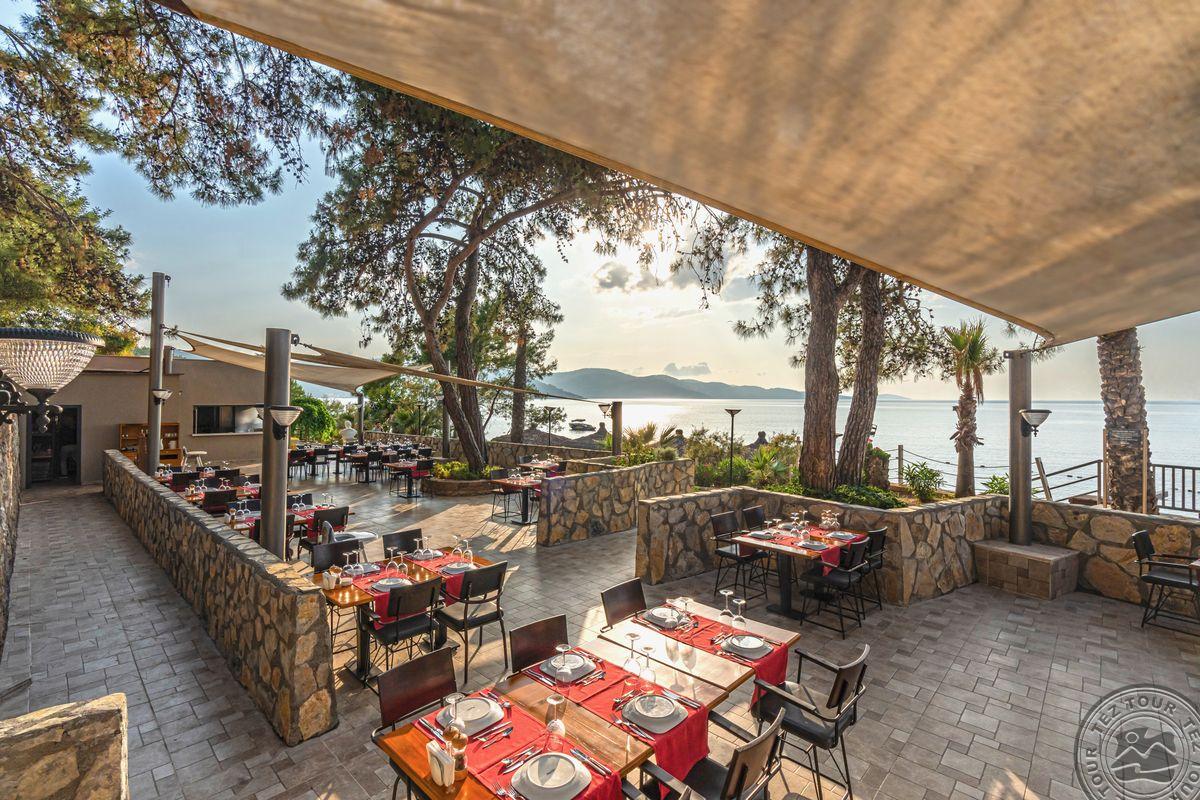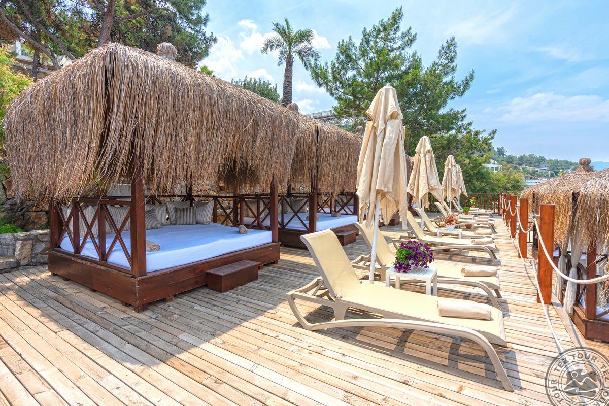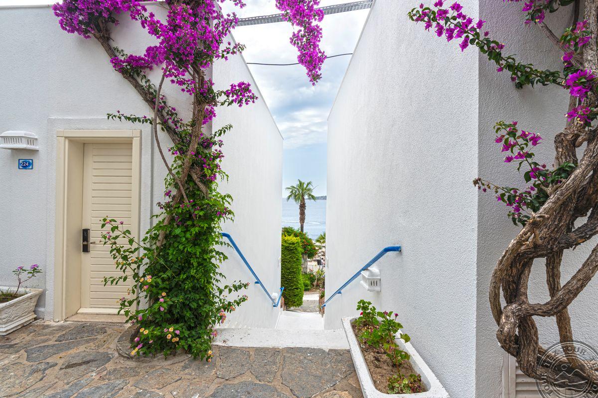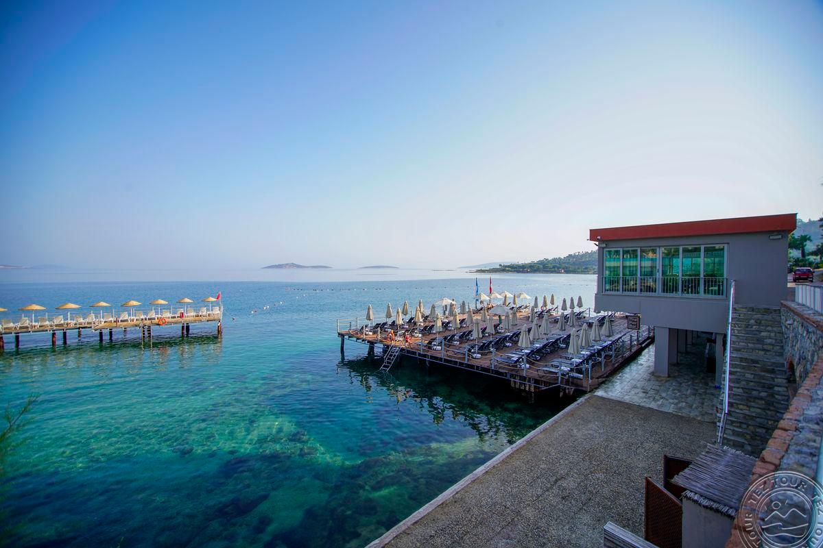 в 4 км от поселка Торба, в 13 км от Бодрума, в 24 км от аэропорта Бодрума, на берегу моря.