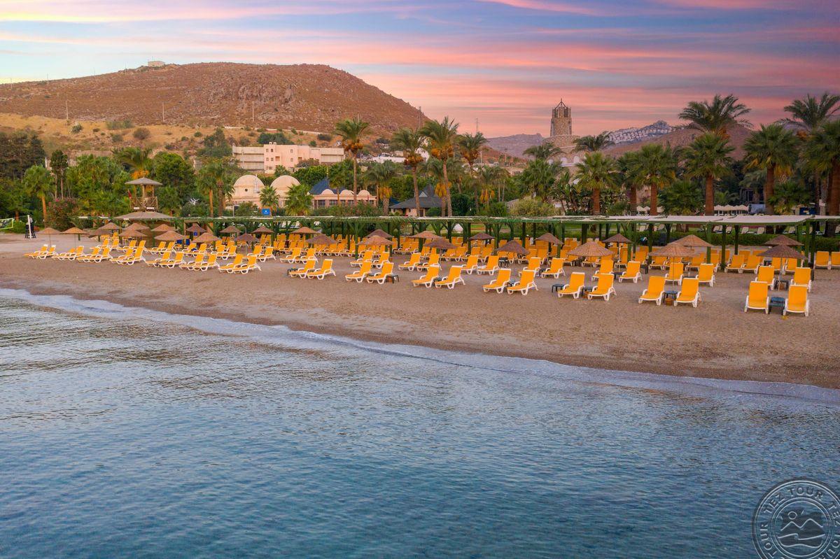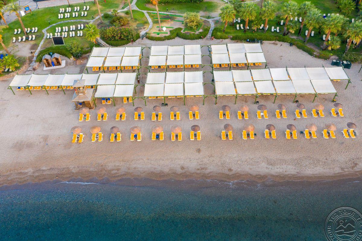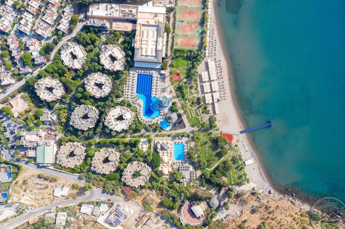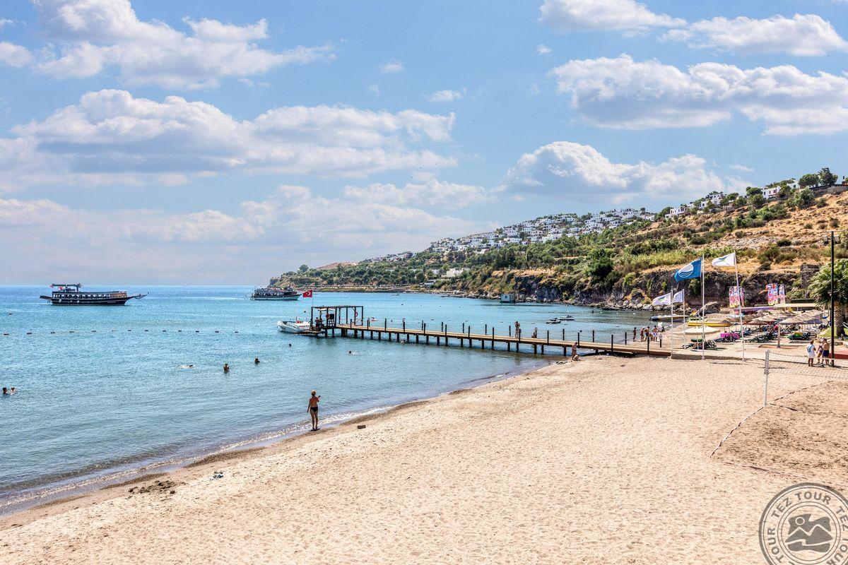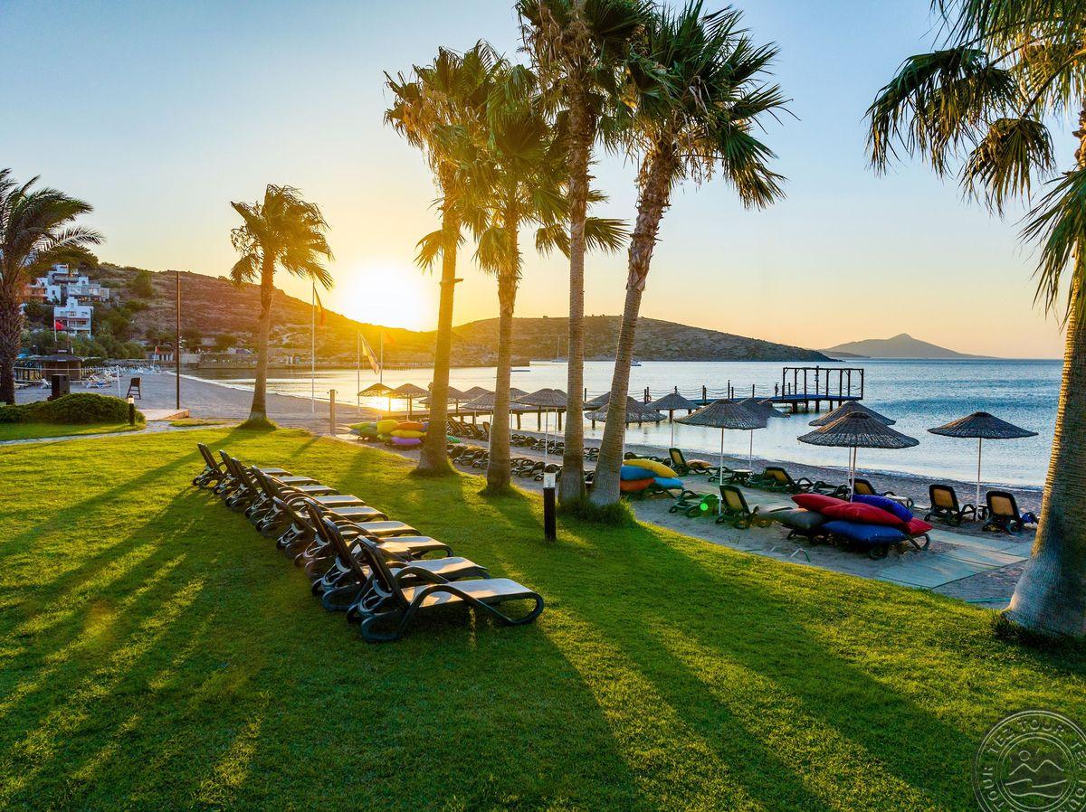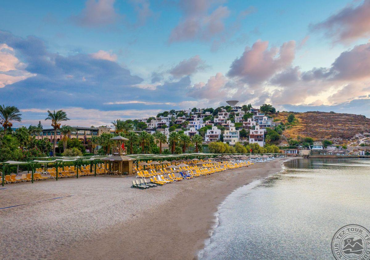 Отель расположен на одном из самых красивых пляжей с мелким песком в Бодруме. Ухоженные сады и большие территории. Один из самых красивых закатов в Бодруме.
