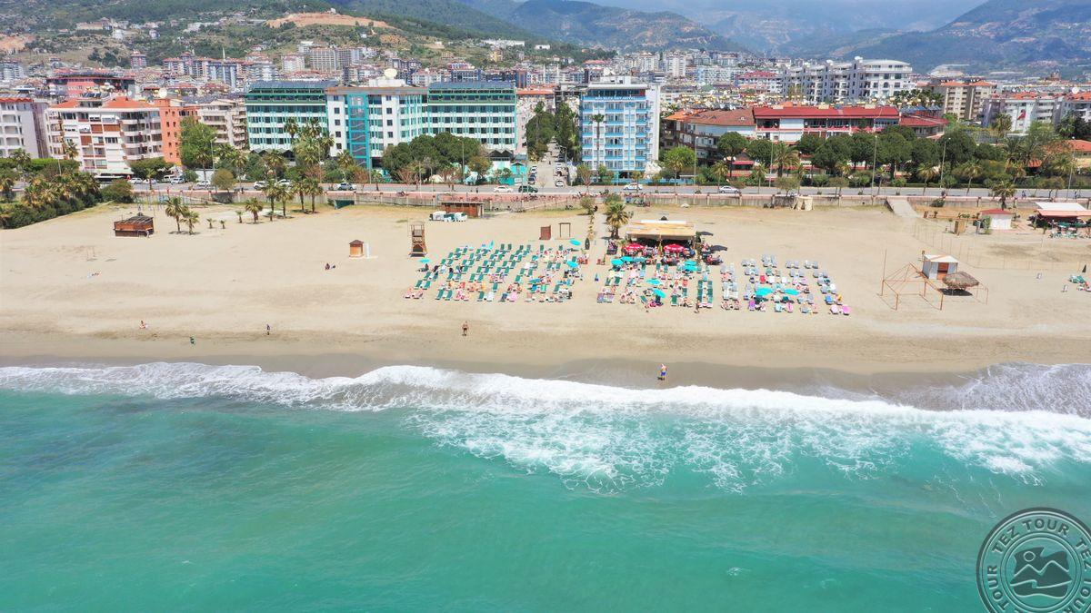 в 120 км от аэропорта г. Анталья, в 40 км от аэропорта Алании, в 2 км от центра г. Алания, в 20 м от собственного пляжа.