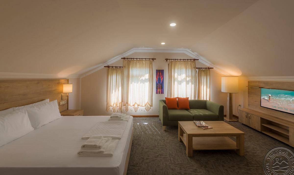 Junior Suite (вид на сад или бассейн, гостиная и спальня, двуспальная кровать, макс. 3+1 чел., 50 м2).