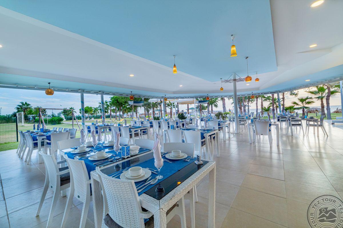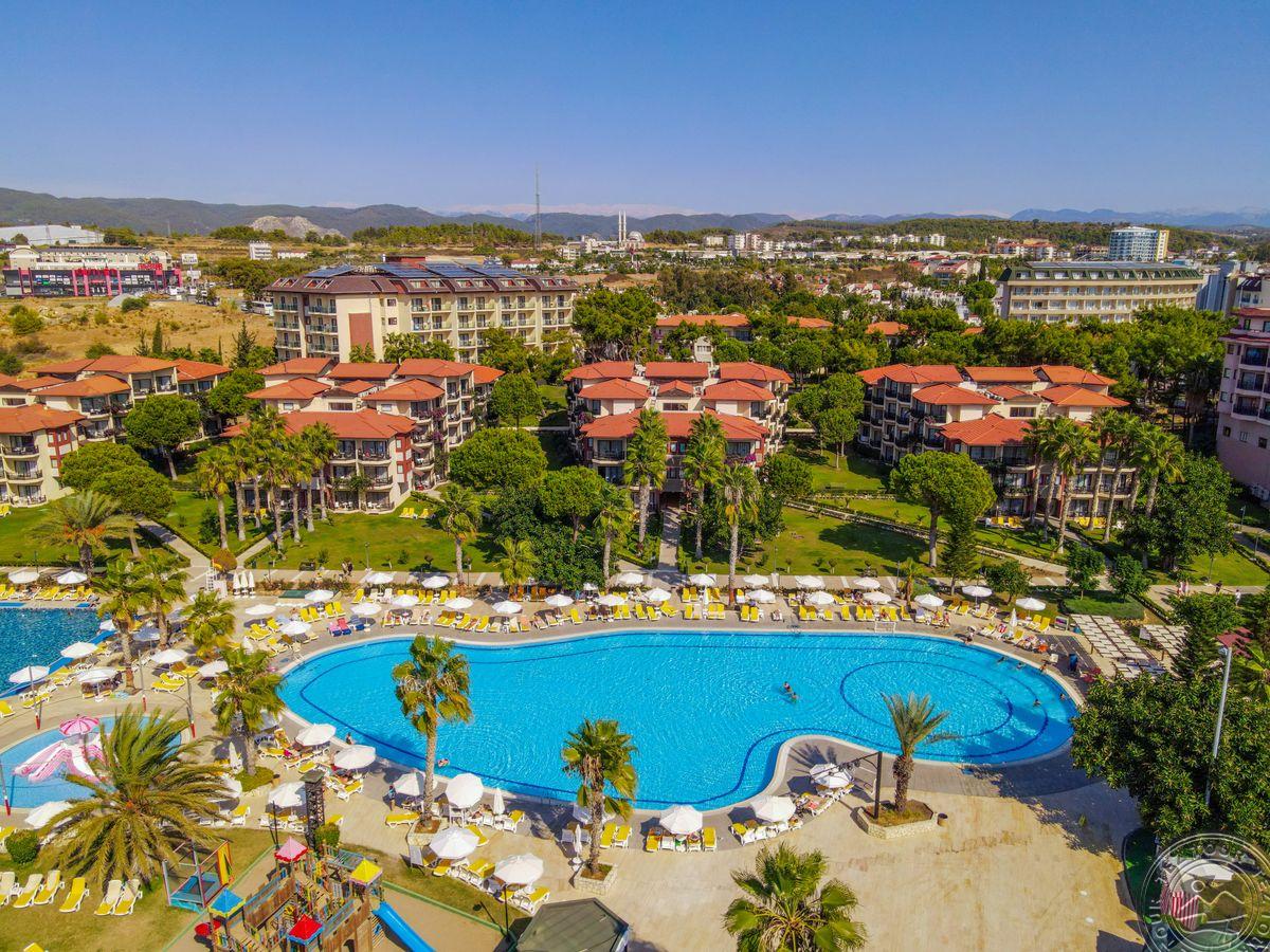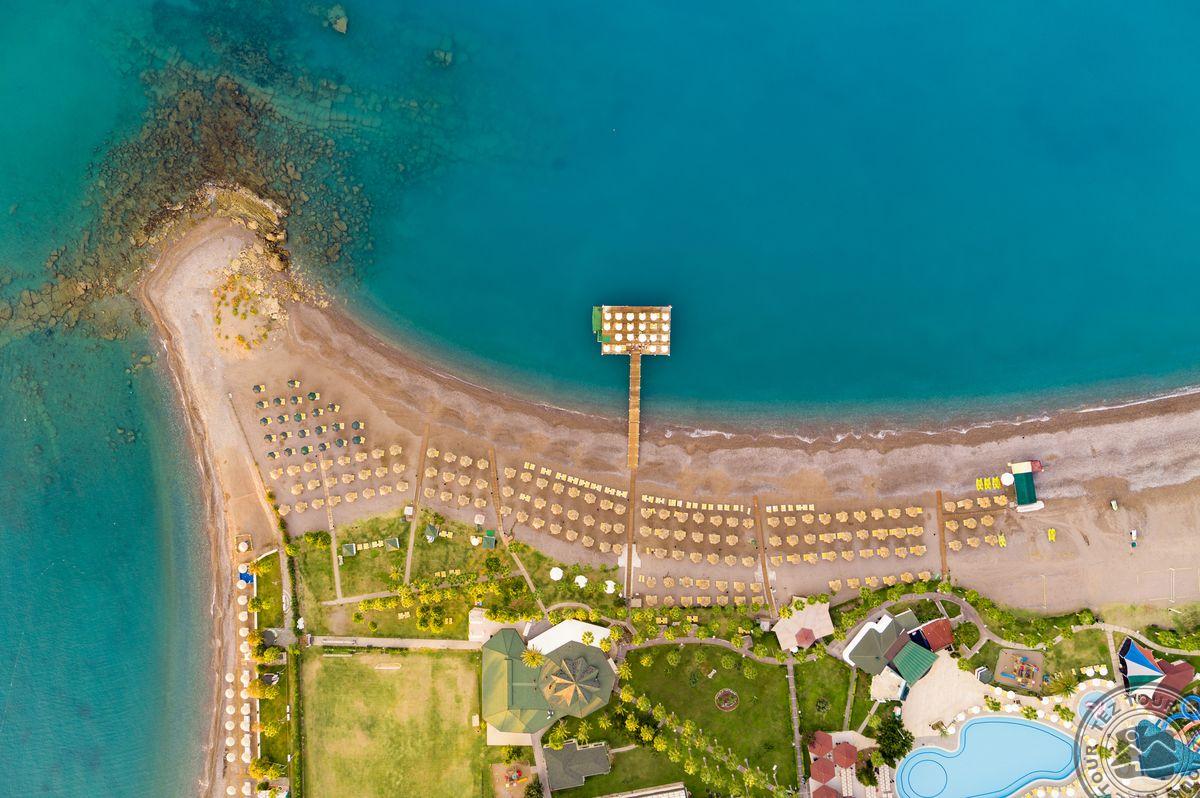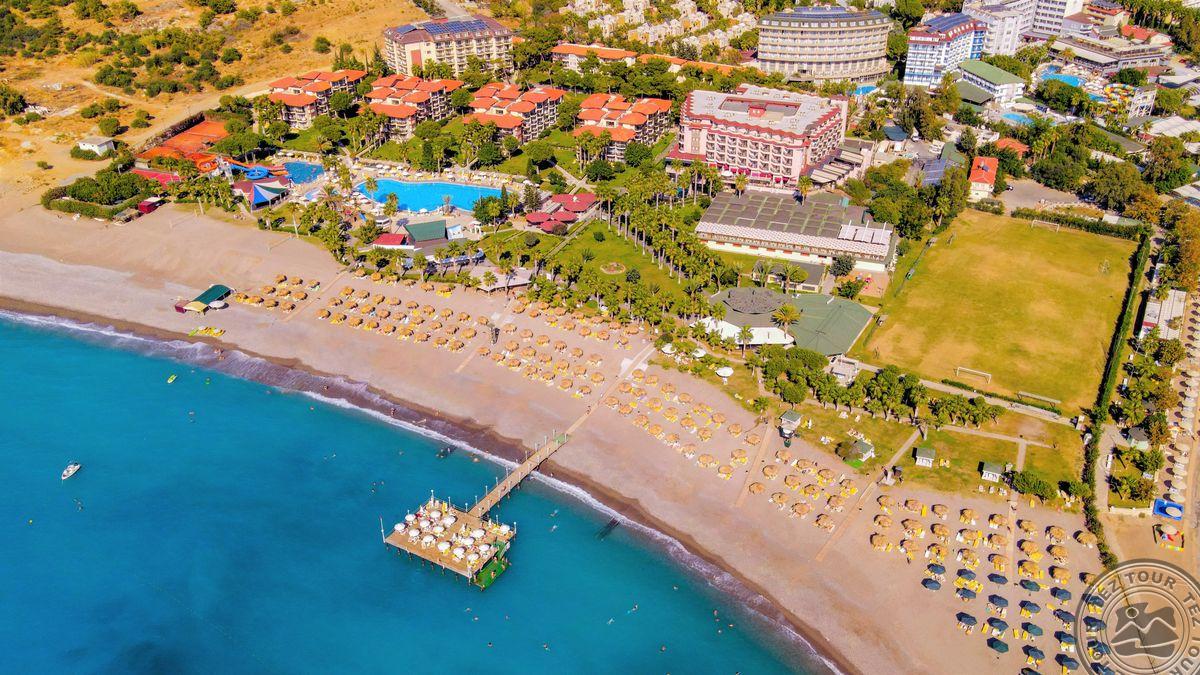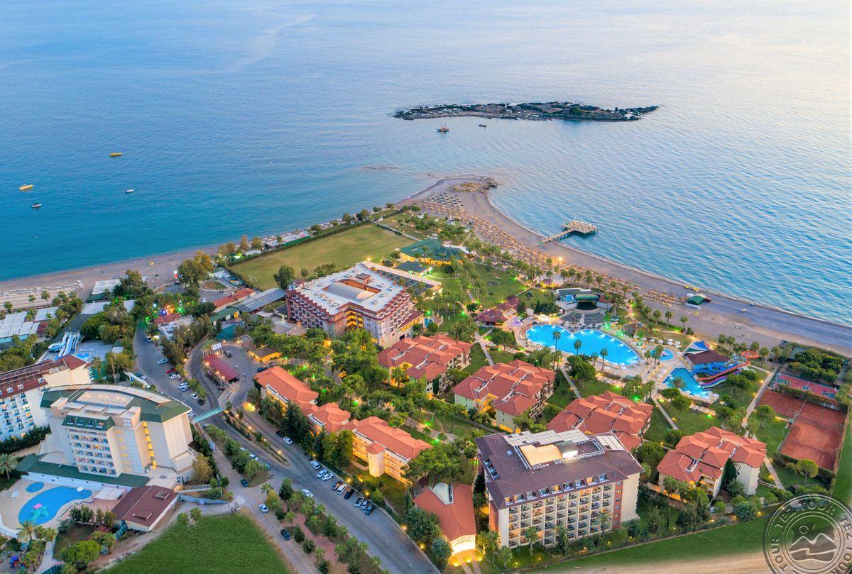 в 90 км от аэропорта г. Анталья, в 35 км от г. Аланья, на самом берегу моря.